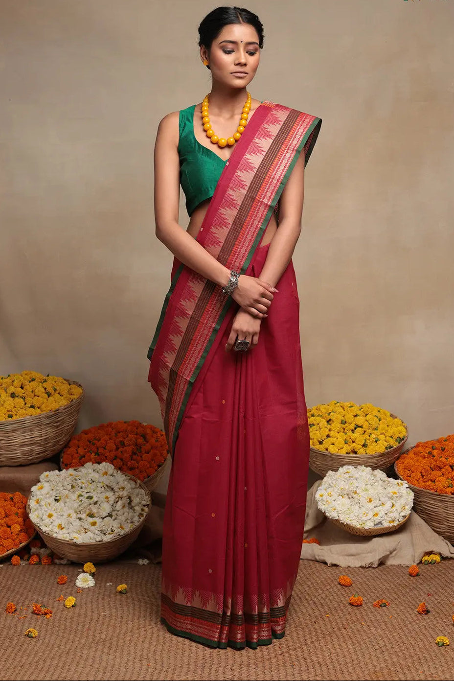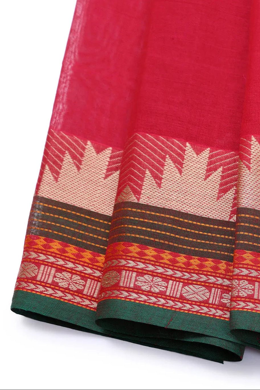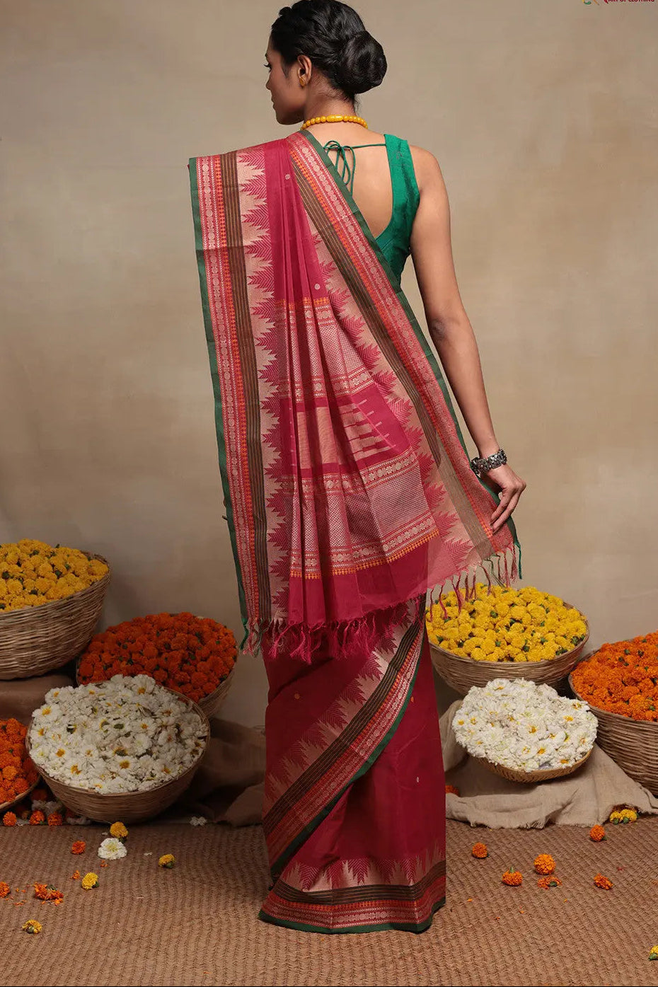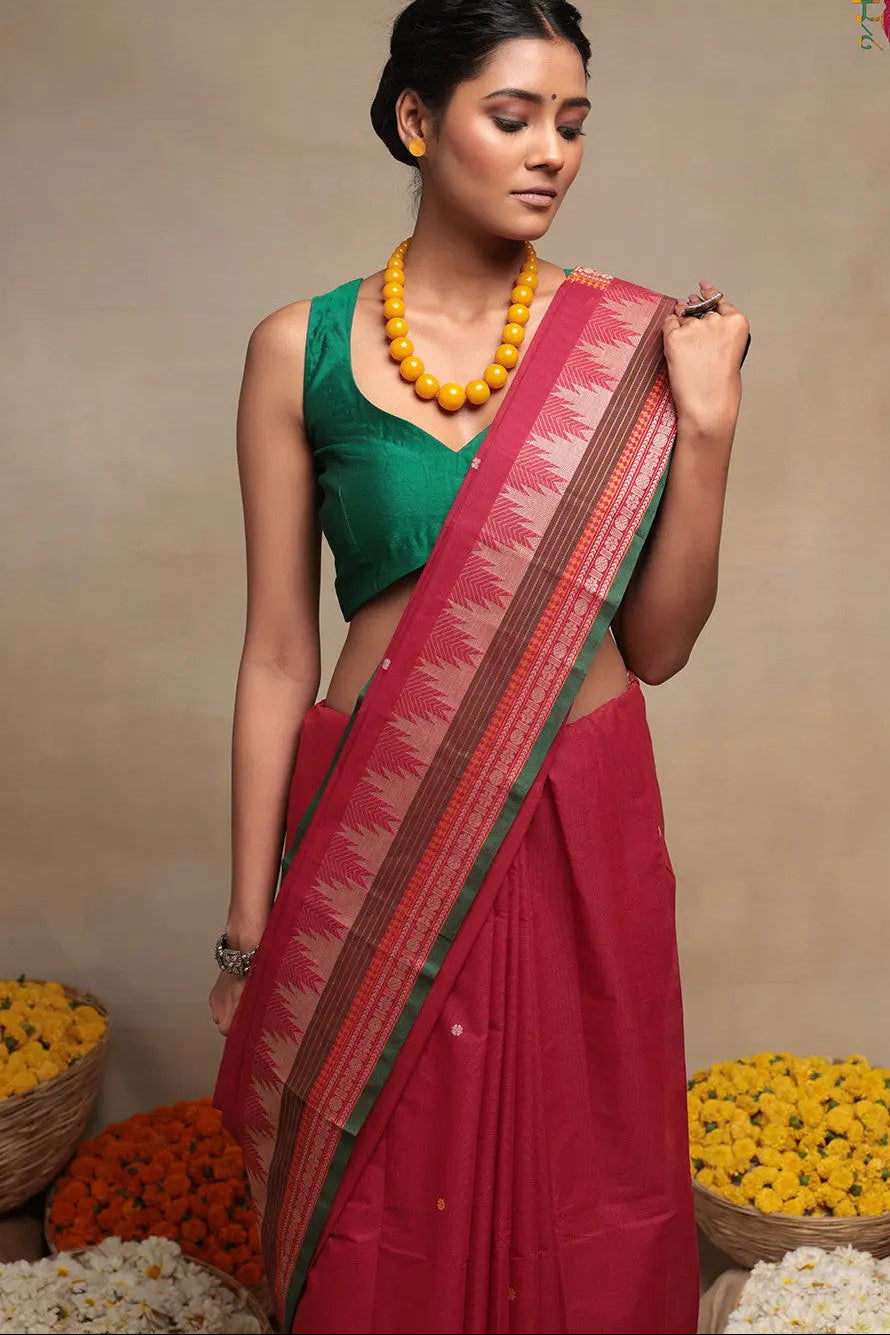 Presenting our new delightful magenta handloom pure cotton Kanchi saree adorned with an exquisite Temple Border in striking green. Meticulously crafted with precision and an eye for detail, this saree embodies a perfect blend of elegance and sophistication. Drawing inspiration from the intricate motifs found in ancient temples, the intricate Temple Border in green adds a touch of traditional allure, symbolizing the rich heritage of Indian craftsmanship. Every detail is thoughtfully woven, adding a touch of artistic splendor to this saree. Versatility meets beauty as this saree effortlessly blends tradition with contemporary sensibilities.
