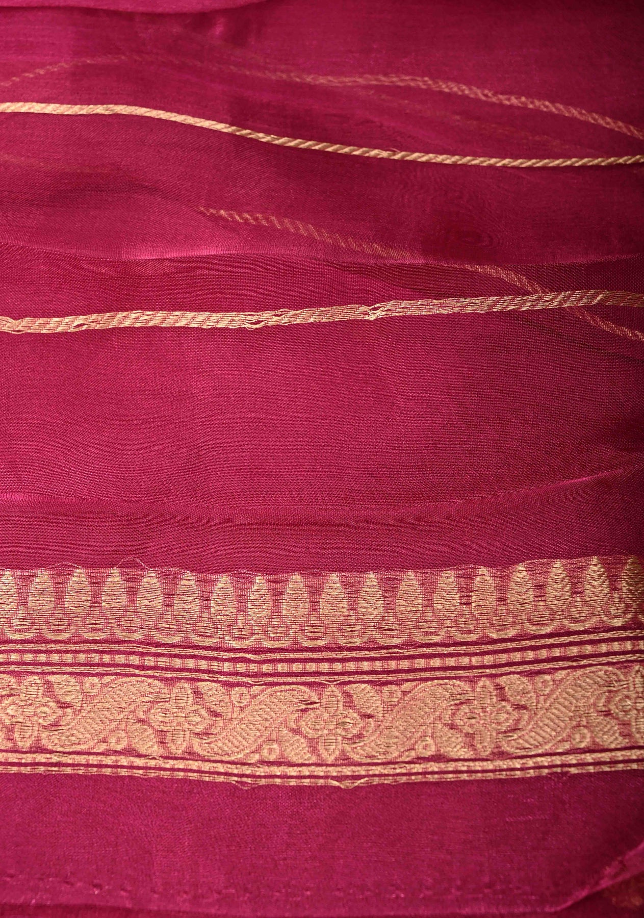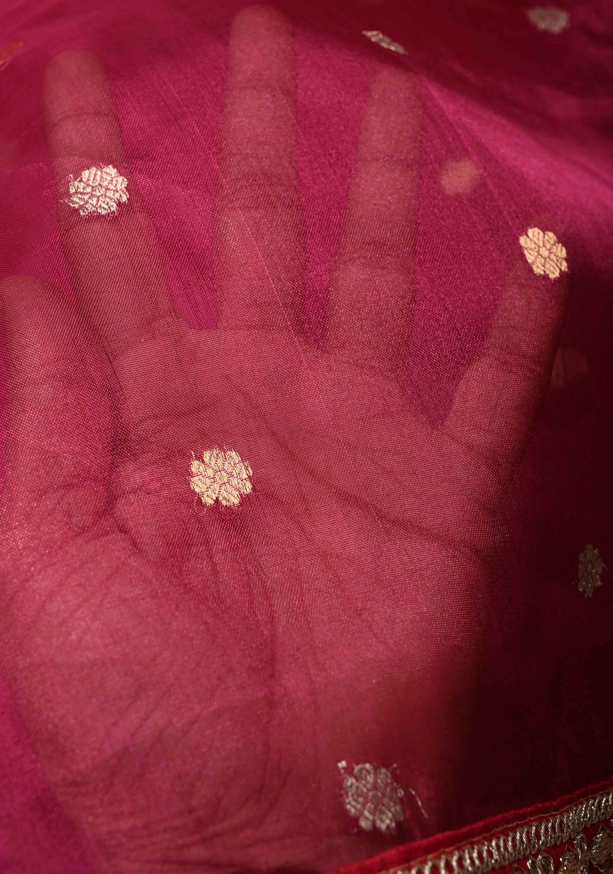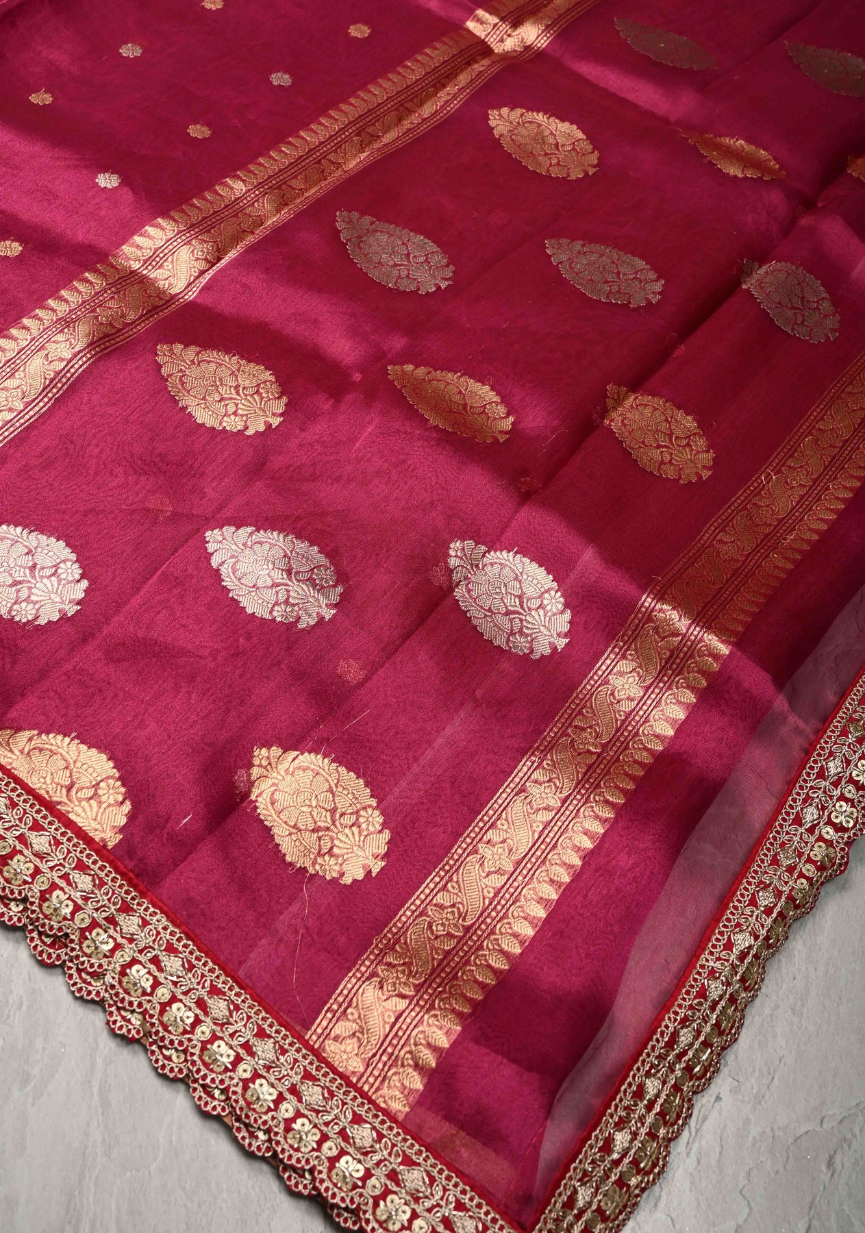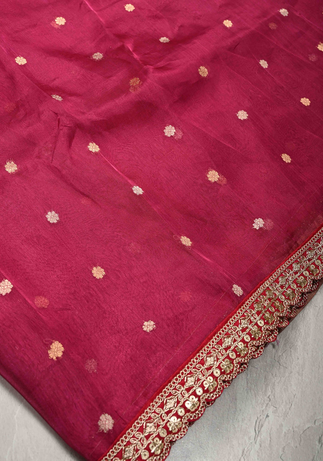 Magenta Organza Silk Saree with Sona Rupa Chunri Buttis and Scallop Fancy Lace Border | SILK MARK CERTIFIED