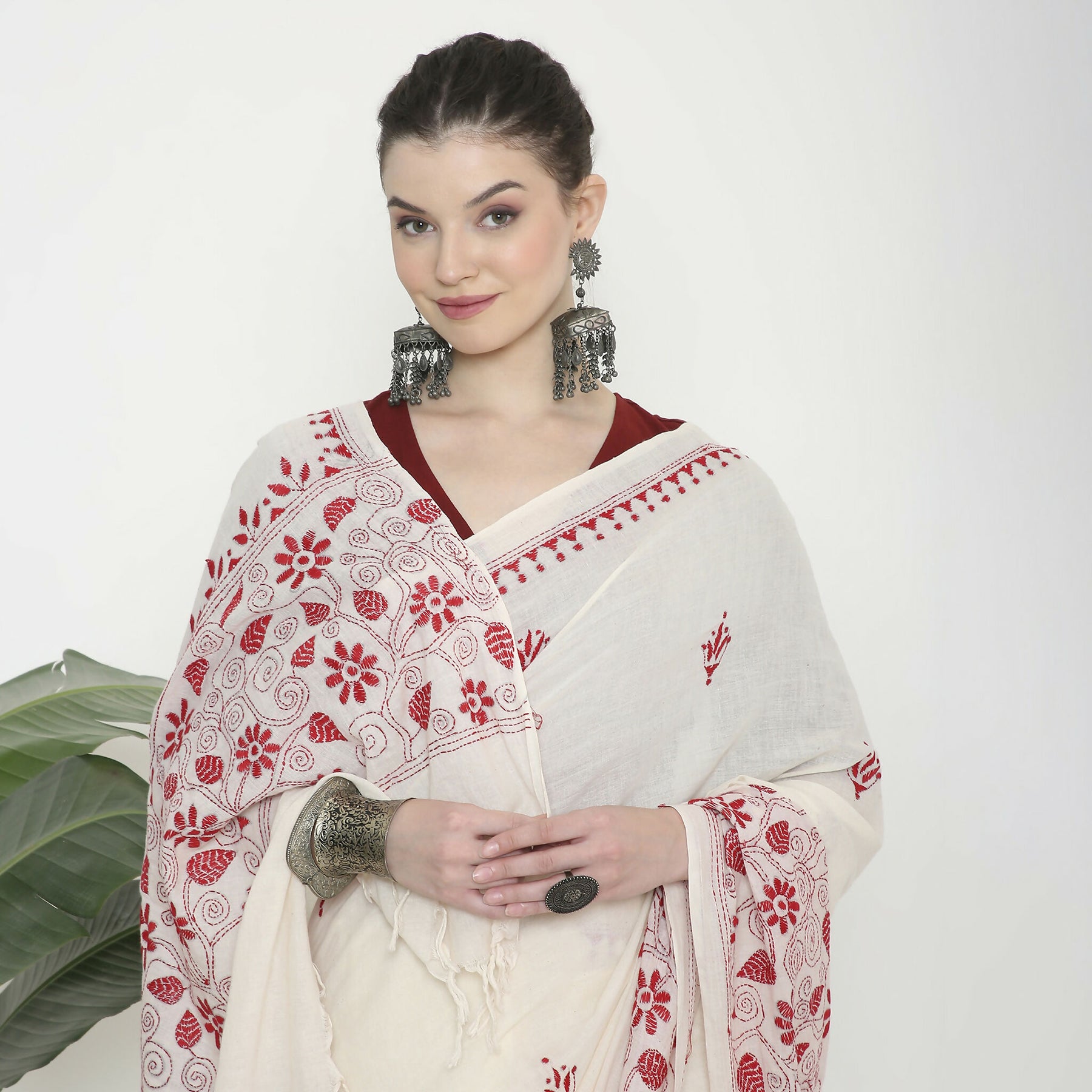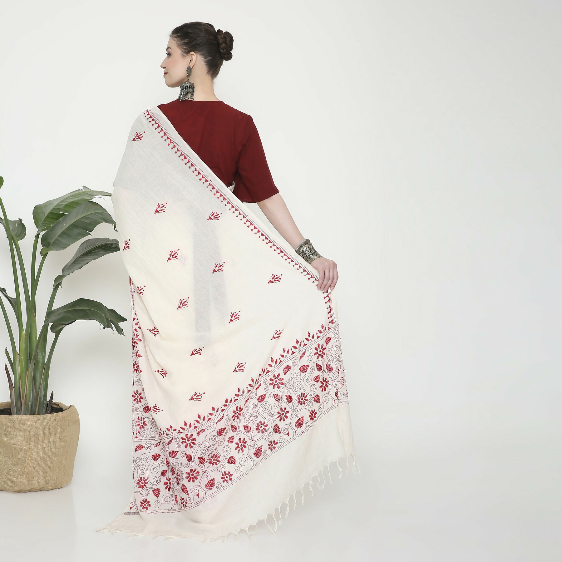 Experience the elegance of our Mul cotton saree, delicately hand-embroidered with traditional Kantha stitches. Crafted from soft, breathable cotton, it’s ideal for casual outings and special events alike. Each saree showcases the skilled handiwork of women artisans from villages near Shanti Niketan, reflecting our commitment to empowering these talented creators. Embrace timeless beauty and support a meaningful cause with this exquisite saree.
