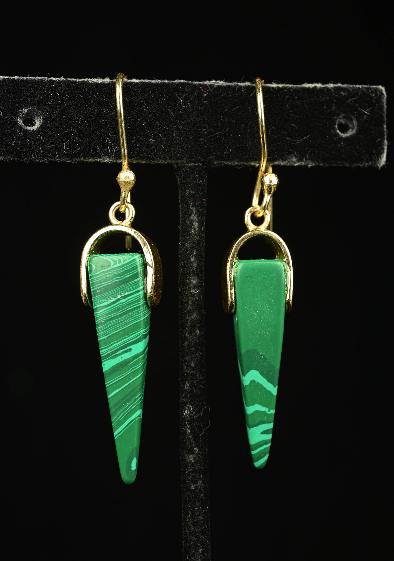 Make a bold statement with these Malachite Dangle Earrings, featuring striking green stone spikes with signature wavy striations. Suspended from elegant gold-tone hooks, these tapered drops blend sharp geometric lines with rich, earthy textures. These handcrafted earrings offer a sophisticated, nature-inspired touch to any modern ensemble.