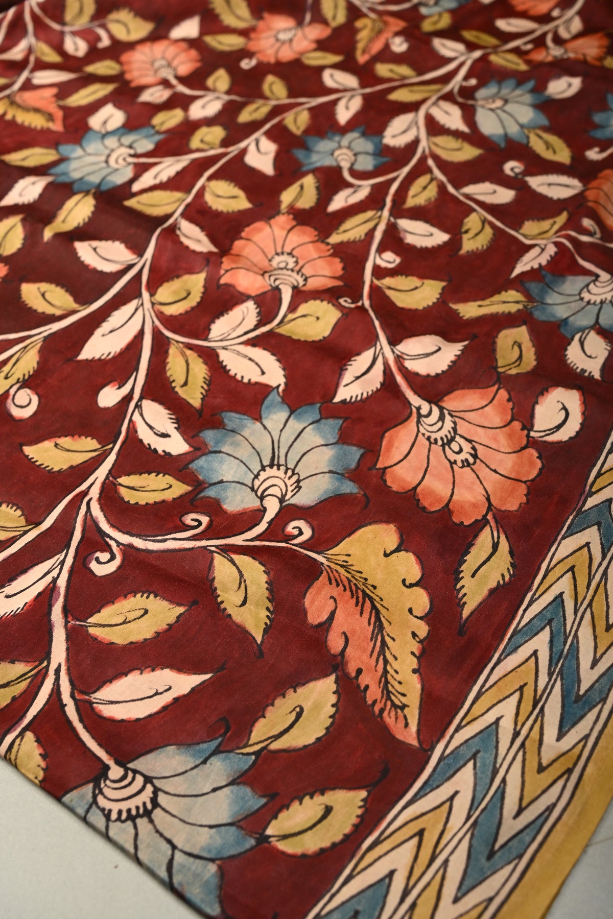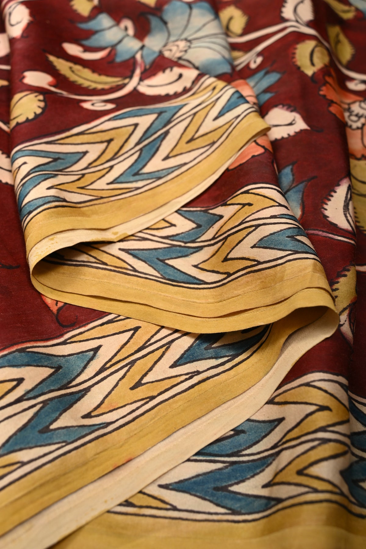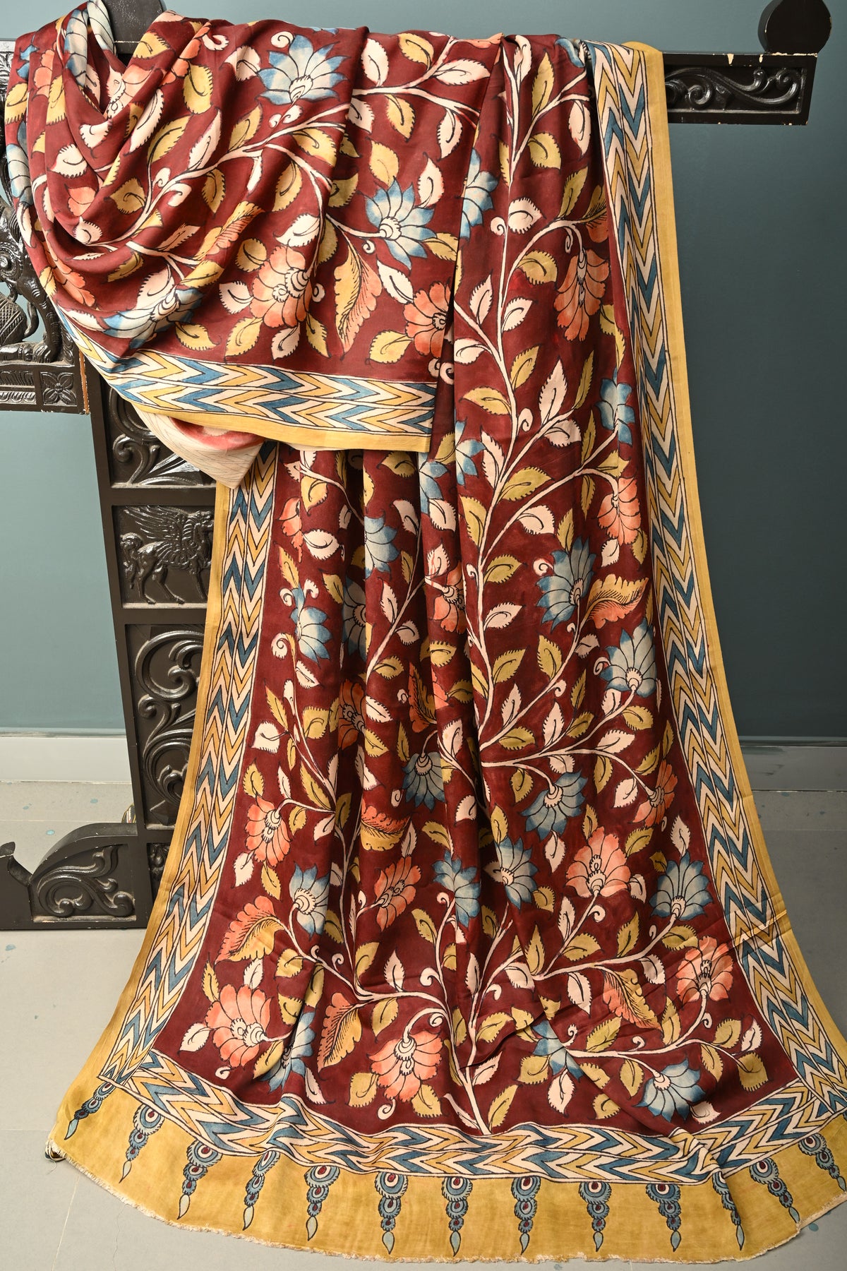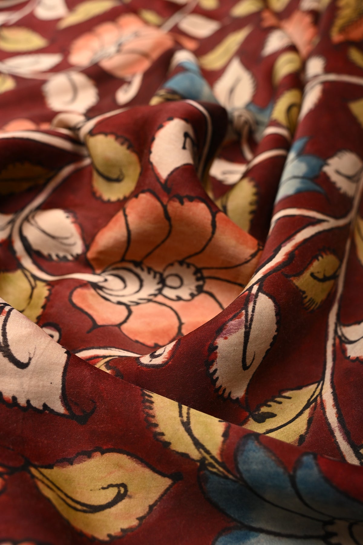 The Maroon Modal Silk Saree with Pen Kalamkari Shaded Floral Design is a stunning blend of rich heritage and refined elegance. Crafted from smooth, lightweight modal silk, this saree drapes beautifully and offers all-day comfort with a subtle, luxurious sheen. The deep maroon base is adorned with intricate hand-drawn Pen Kalamkari floral motifs, enhanced by delicate shading that adds depth and artistic character. Perfect for festive celebrations, cultural events, and special occasions, this saree showcases exquisite craftsmanship and timeless design, making it a graceful addition to any ethnic wardrobe