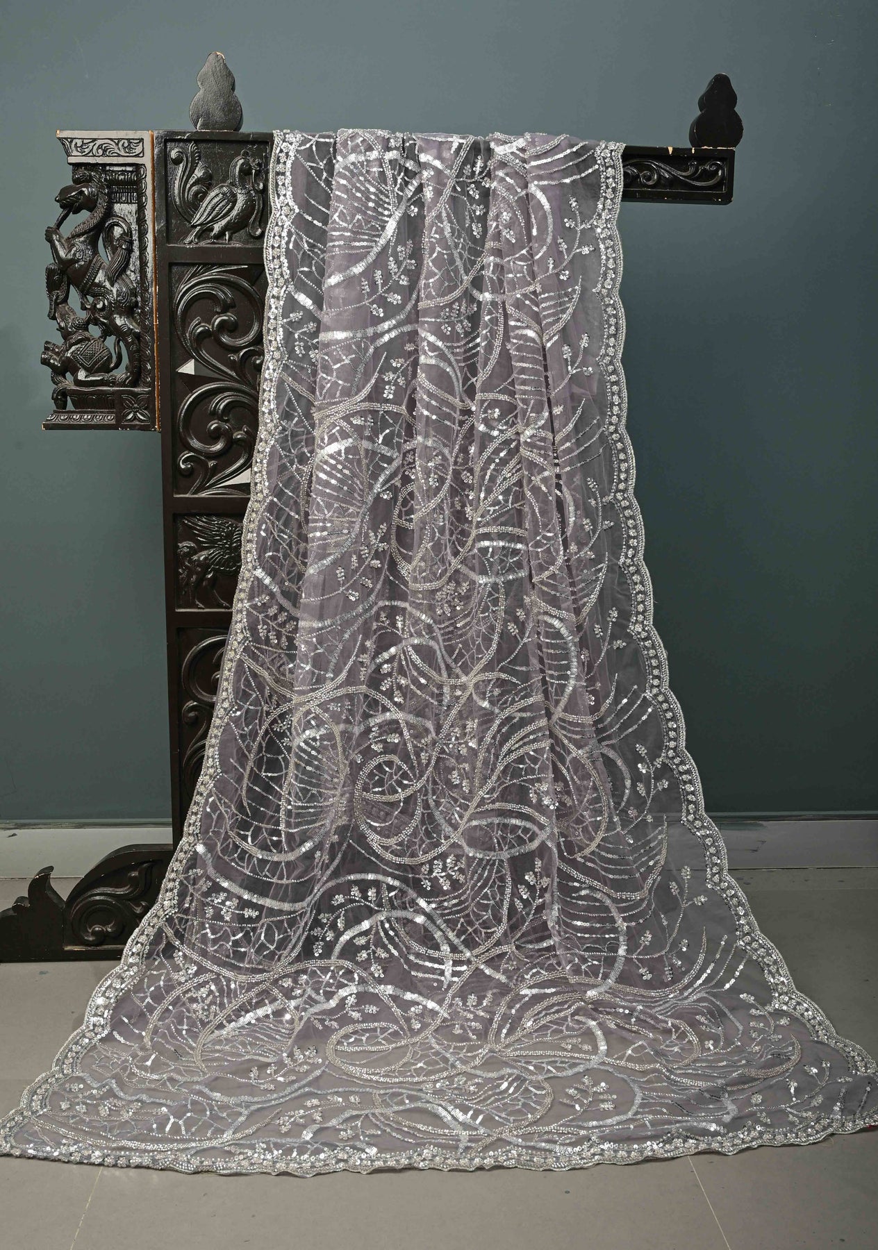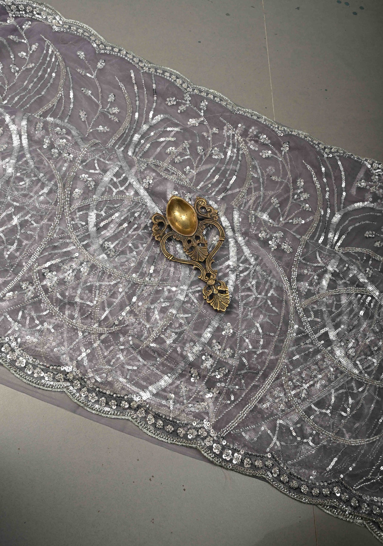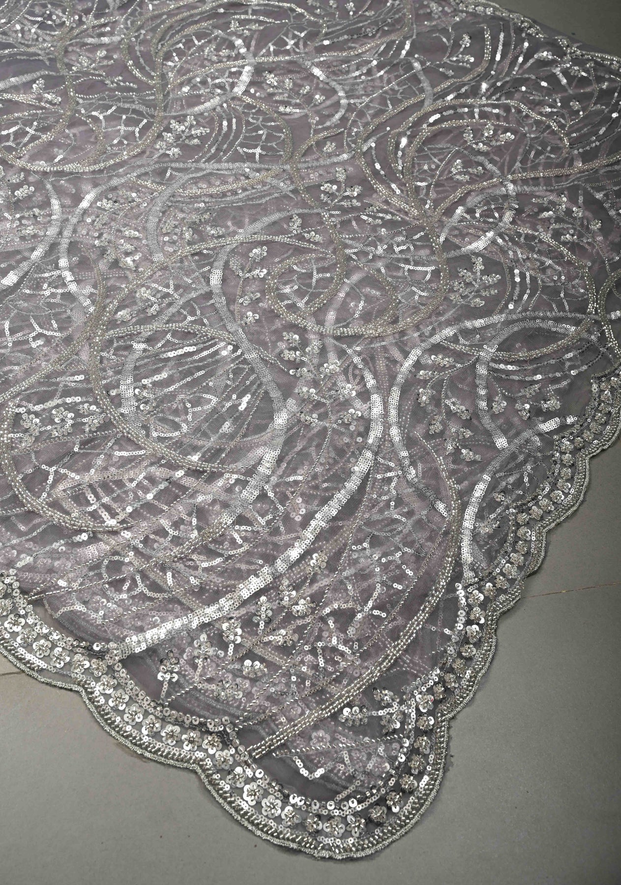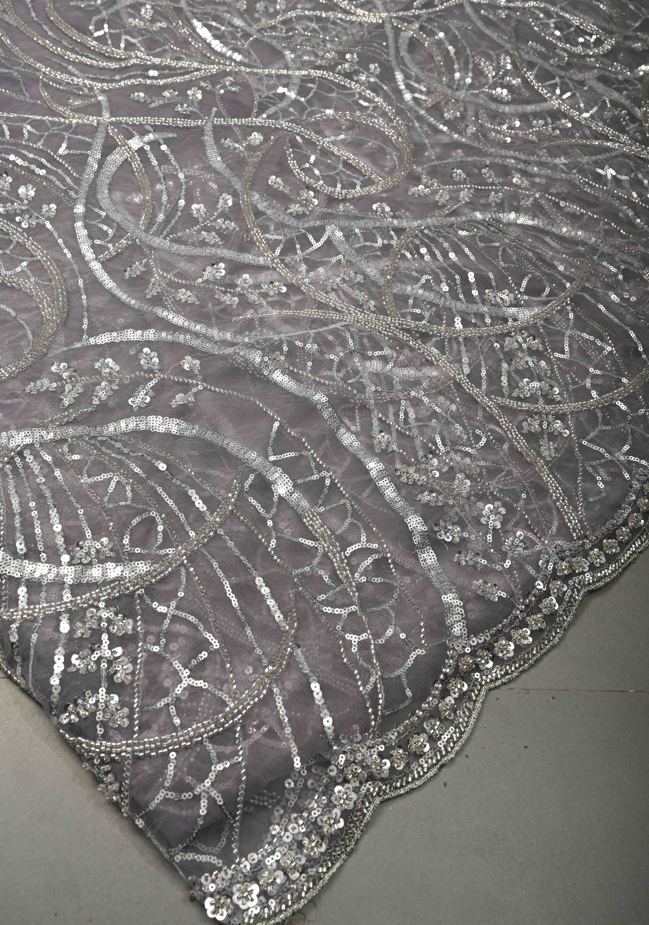 The saree showcases a beautiful swirling design adorned with sequins and cutdana, adding shimmer and artisanal charm. The scallop border provides a refined and feminine finishing touch. Pair it with a matching or contrast blouse to create a contemporary yet traditional ethnic look.