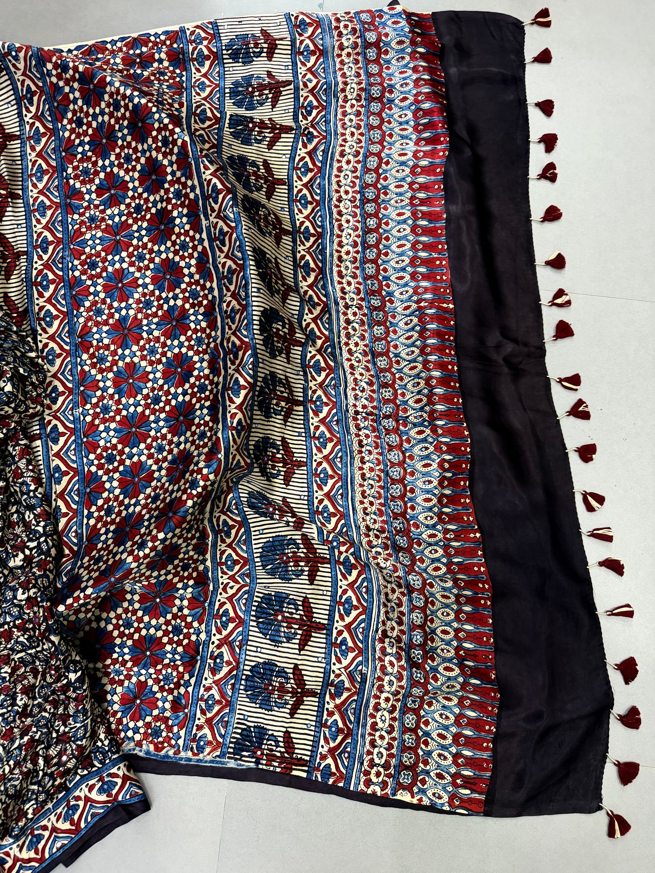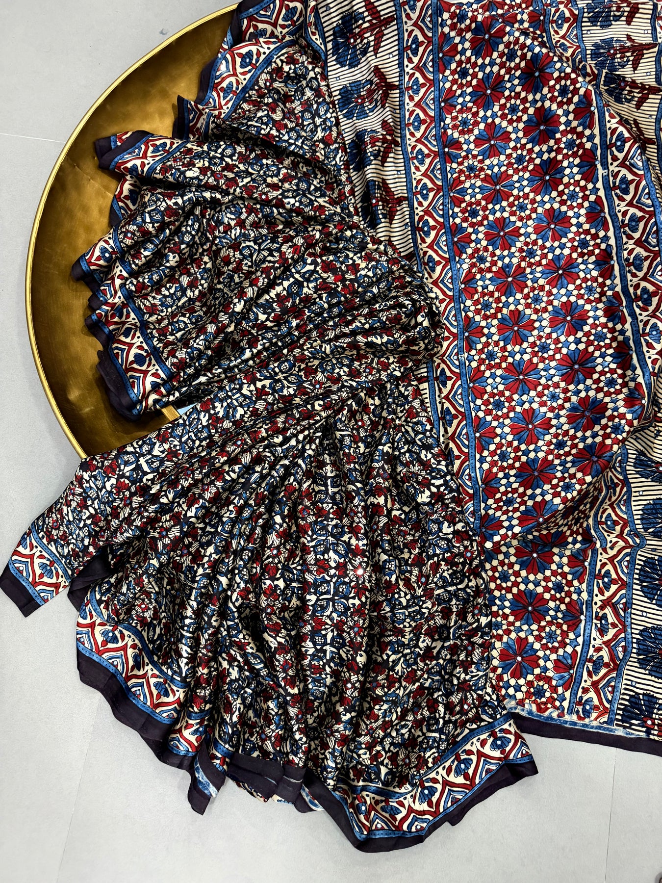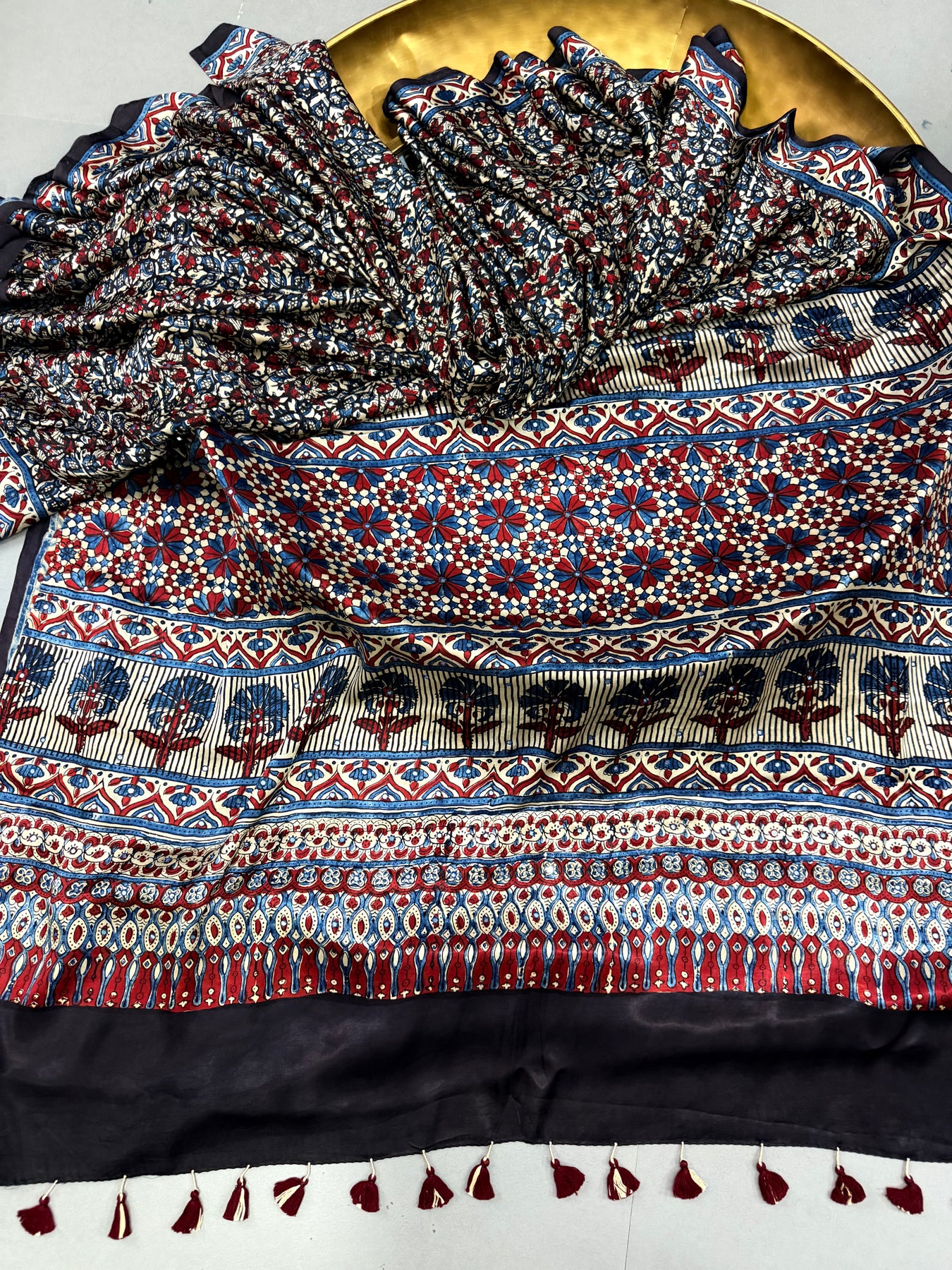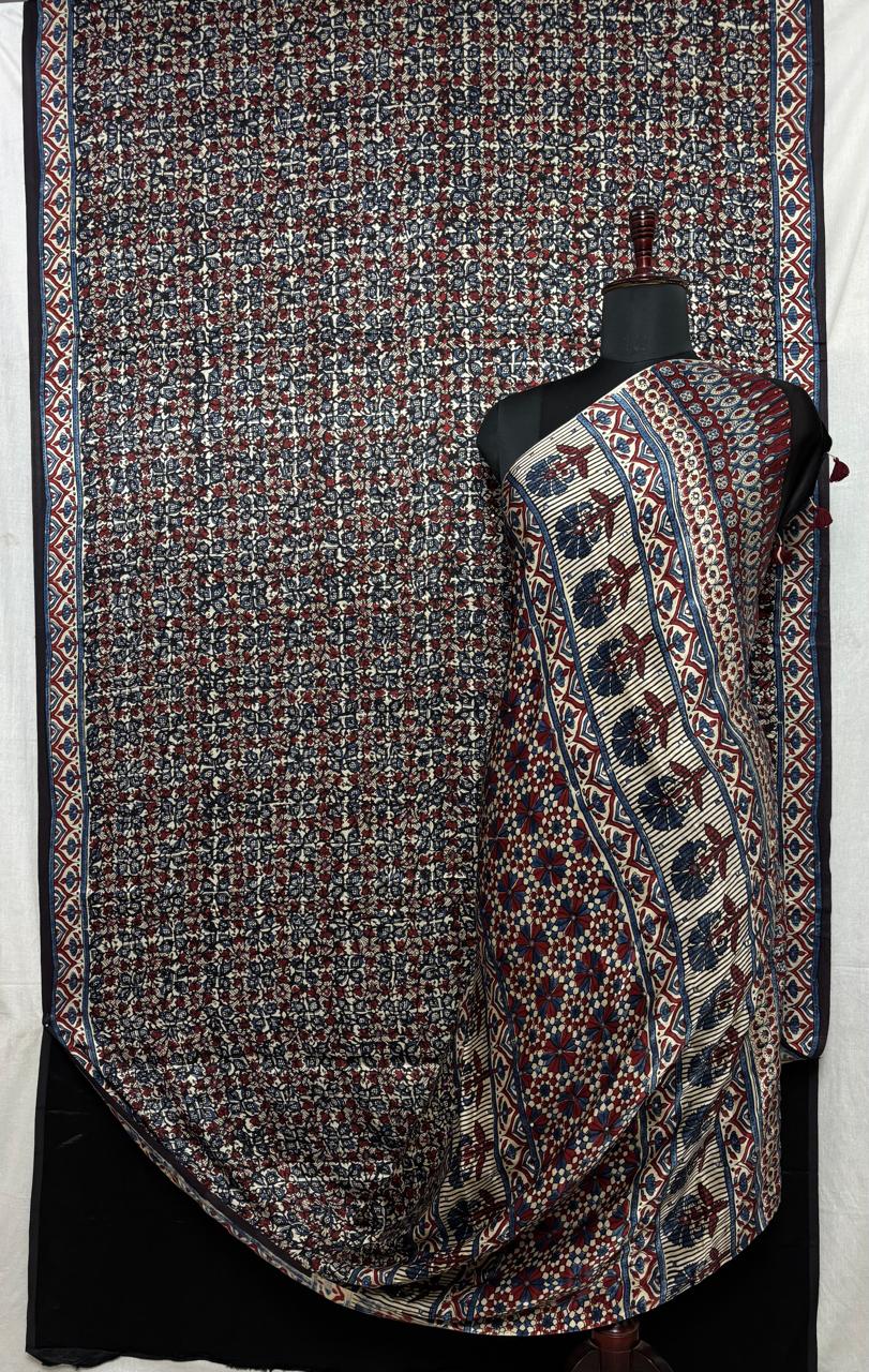 Celebrate vibrant heritage craftsmanship with this Multicolor Authentic Ajrakh Hand Block Printed Modal Silk Saree, a stunning blend of traditional artistry and contemporary elegance. Handcrafted using the age-old Ajrakh hand block printing technique, the saree features intricate motifs rendered in a multicolor palette, creating a visually striking and timeless appeal.
