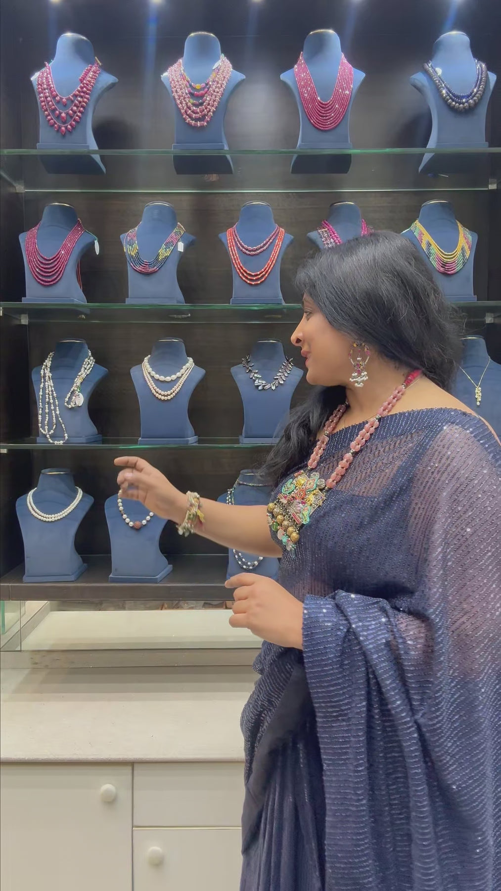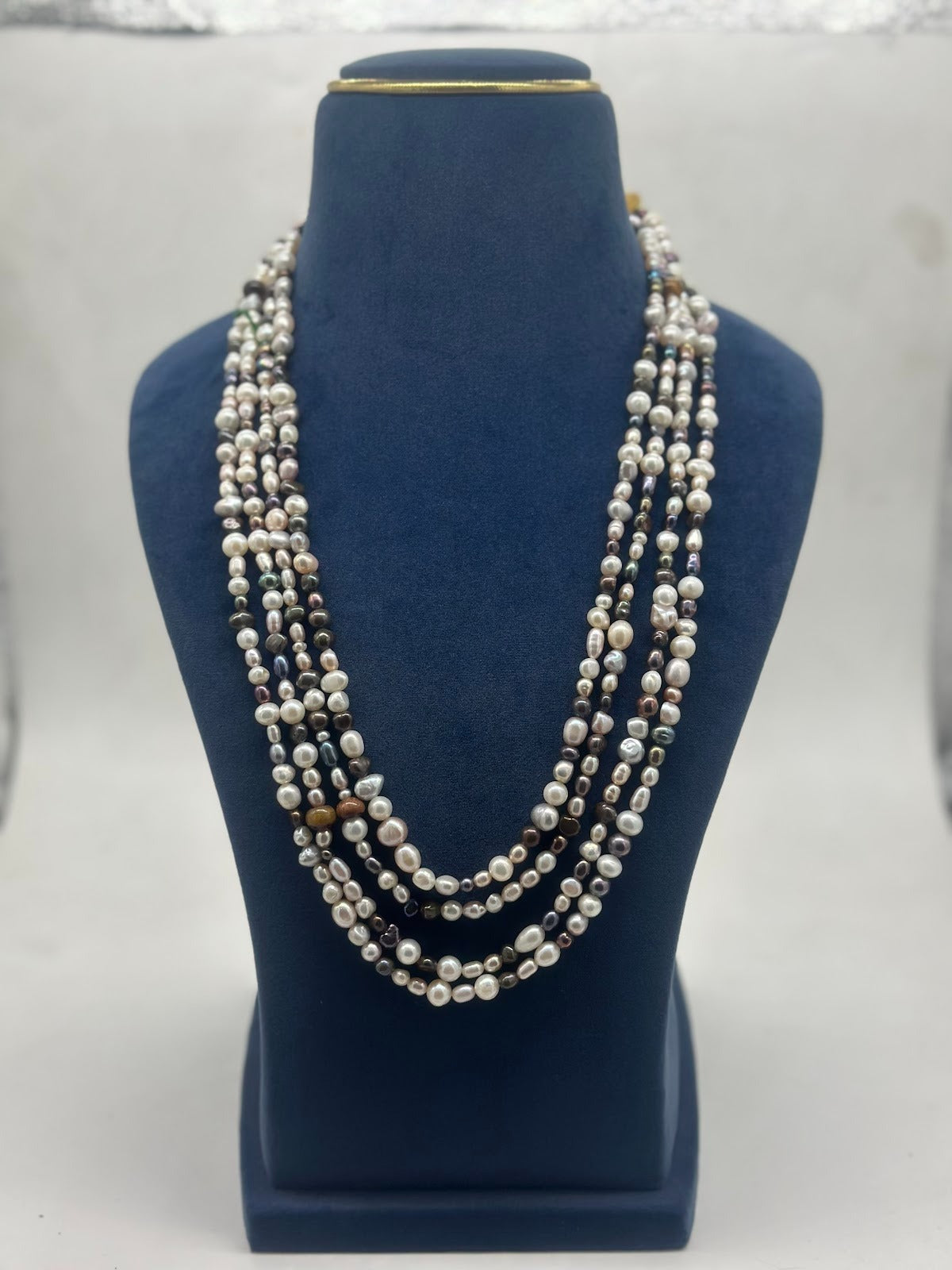 Adorn yourself in vibrant luxury with our Multicolor Freshwater Pearl & Semi-Precious Stone Long Mala Necklace. This handcrafted masterpiece features lustrous, colorful pearls layered with gemstones for a radiant, multi-tonal glow. Its elongated silhouette offers a regal, versatile drape, perfect for elevating grand silk sarees and festive ensembles.