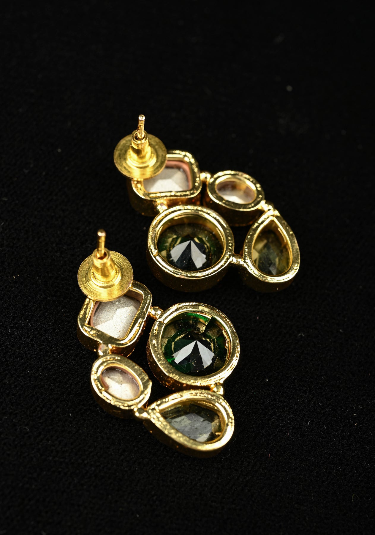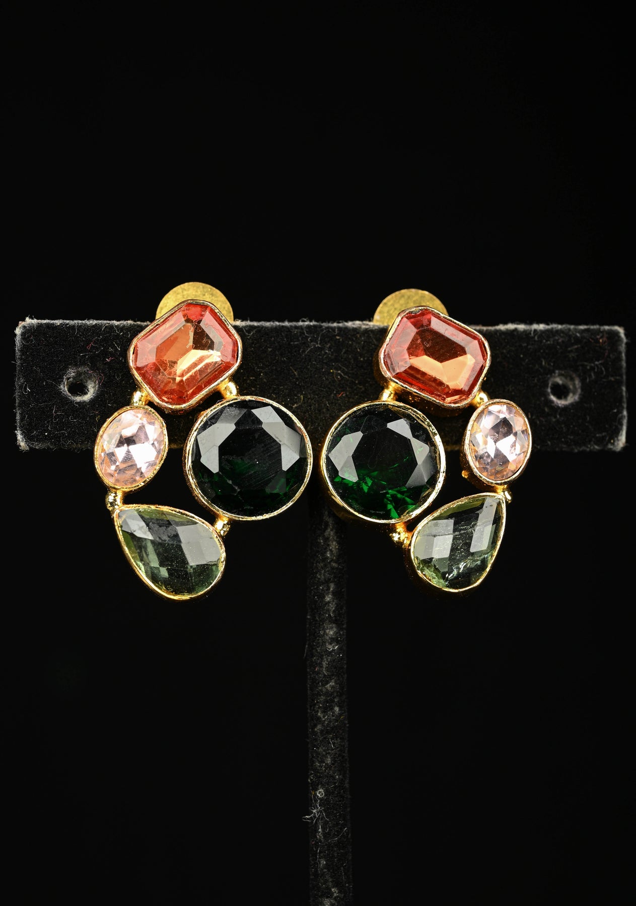 These multicolor glass stone cluster stud earrings feature a vibrant mix of faceted stones arranged in an eye-catching clustered design. The playful blend of colors adds sparkle and charm, making them a perfect accent for both ethnic and contemporary outfits. Lightweight and comfortable, these studs are ideal for festive occasions, parties, and everyday styling with a touch of glamour.