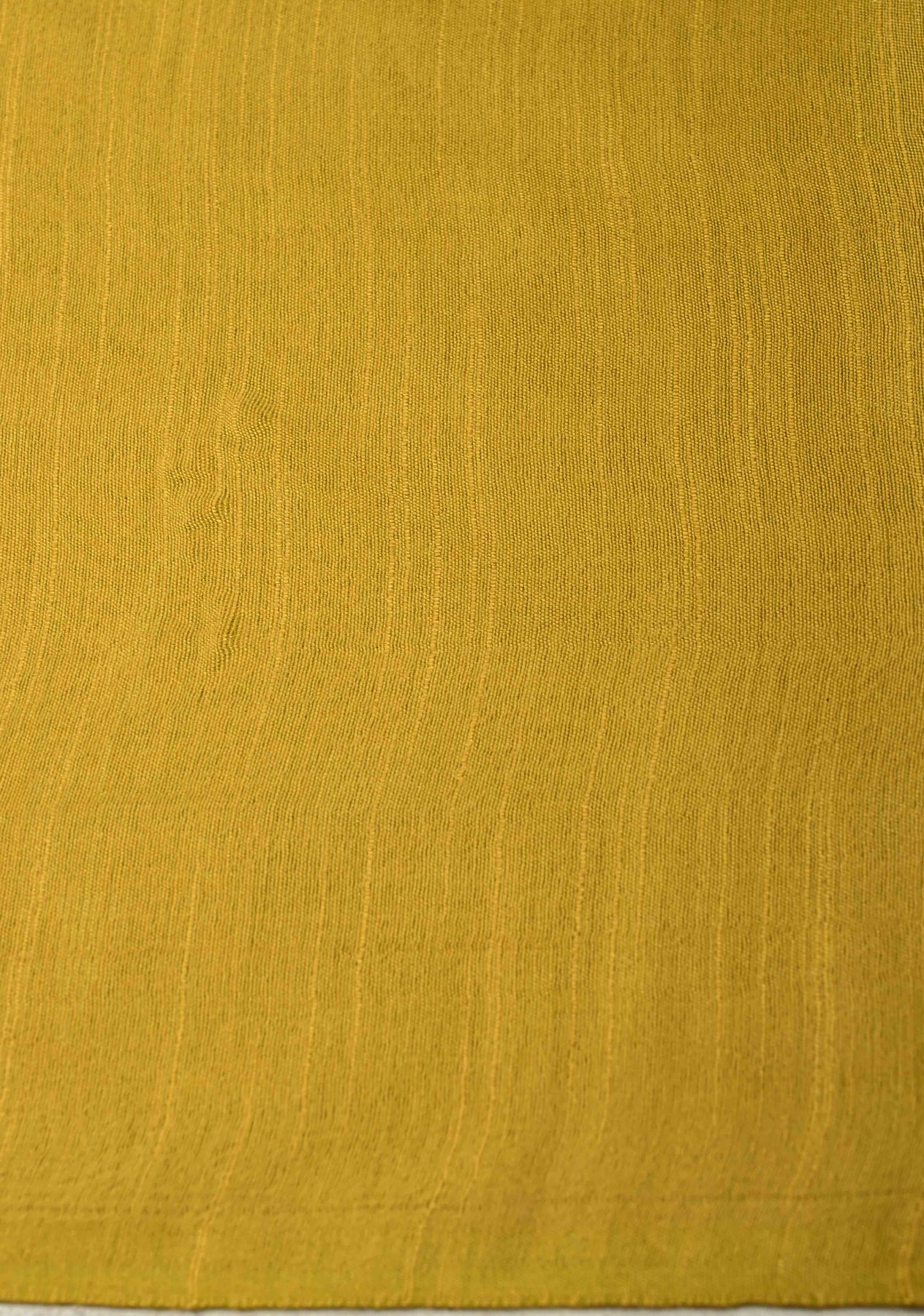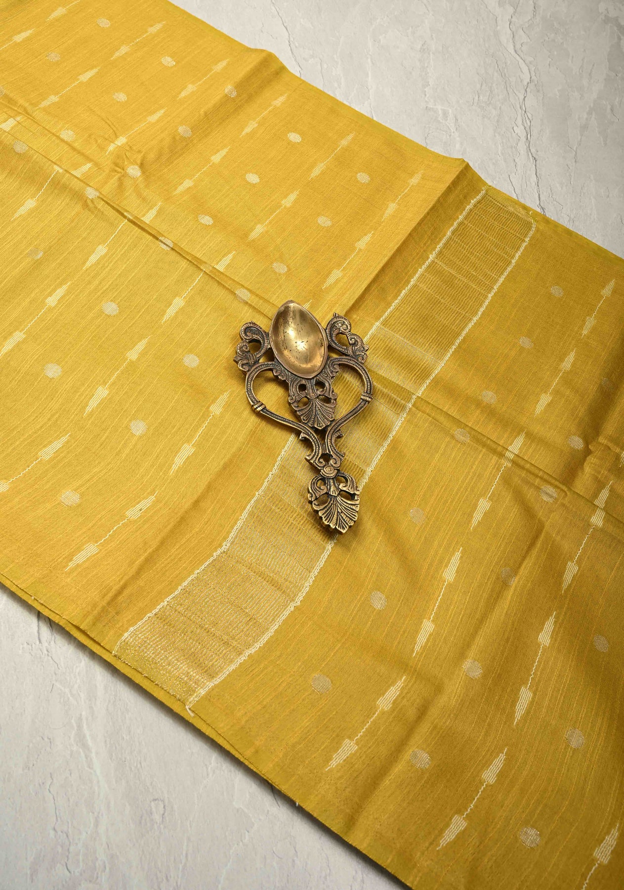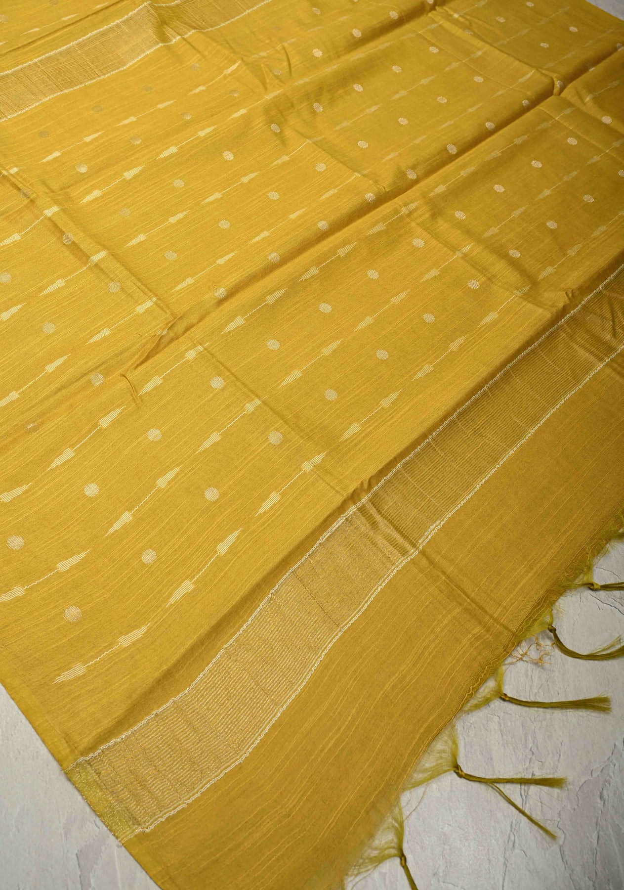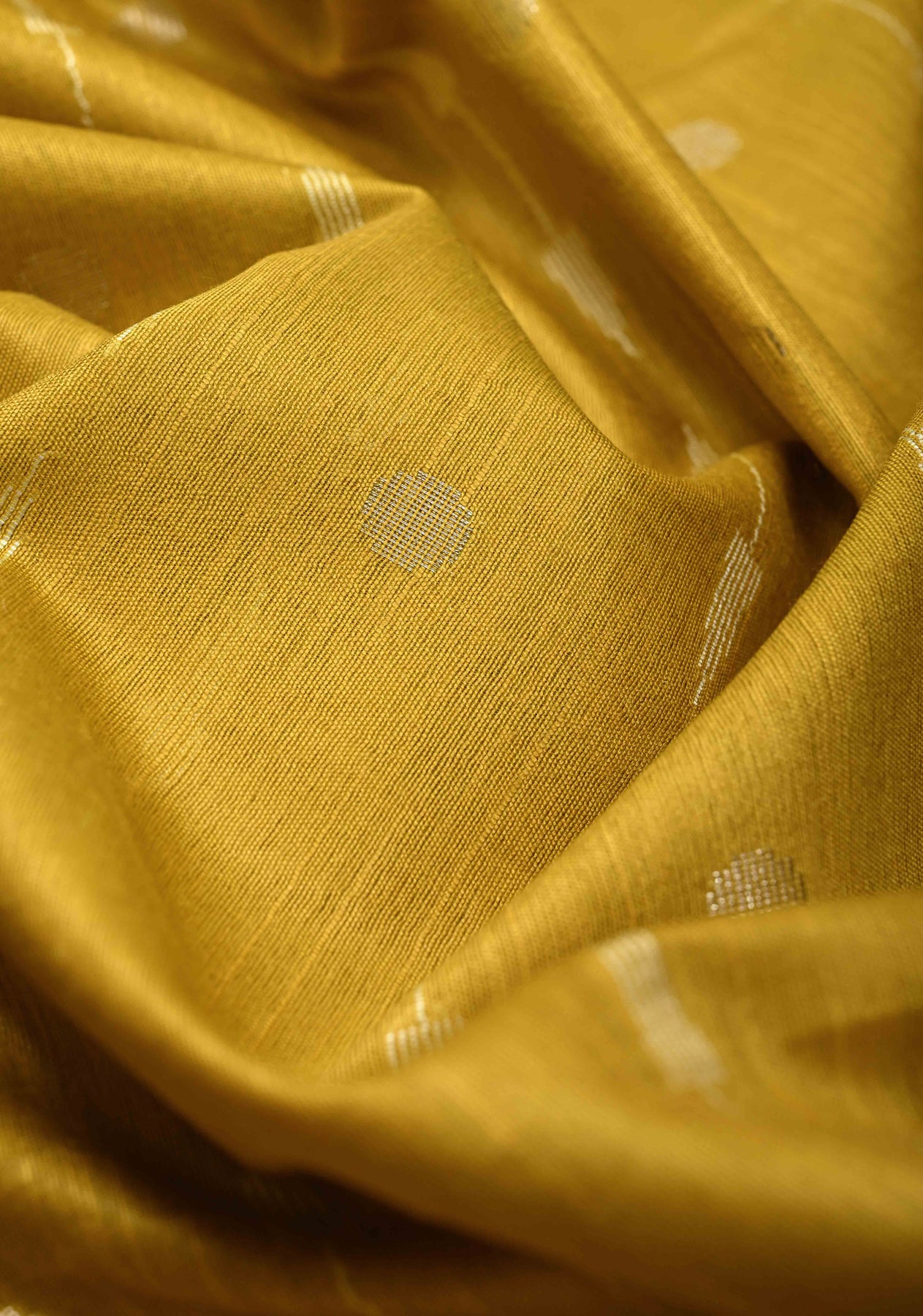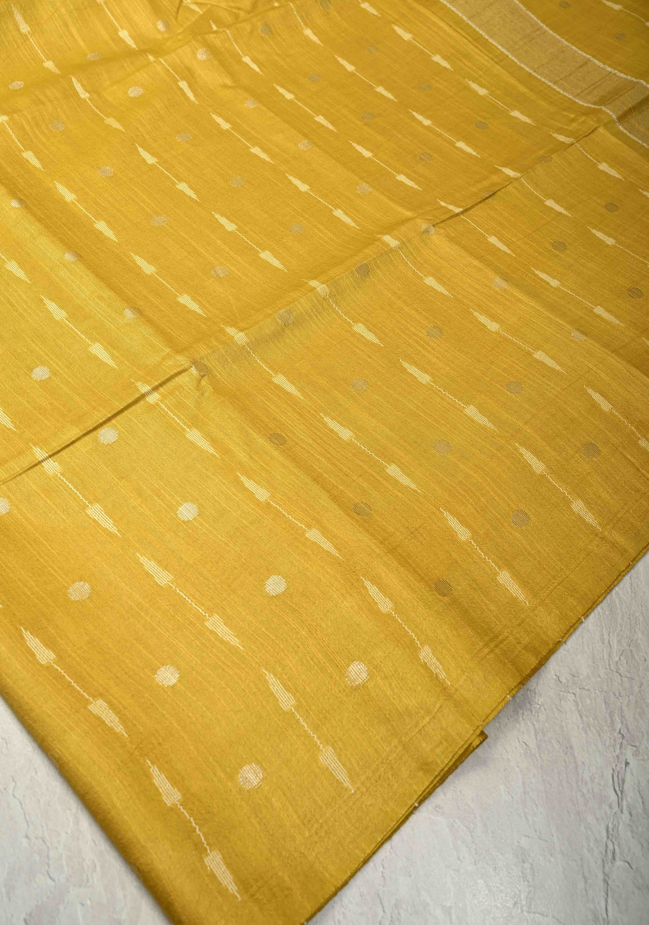Add a cheerful and elegant touch to your ethnic wardrobe with this Mustard Yellow Borderless Semi Tussar Saree. Crafted from lightweight semi tussar silk, it features delicate zari polka dots and subtle thread stripes across the body, creating a perfect blend of traditional charm and contemporary minimalism. The borderless design enhances its modern appeal, making it ideal for festive occasions, cultural gatherings, and daytime celebrations.
