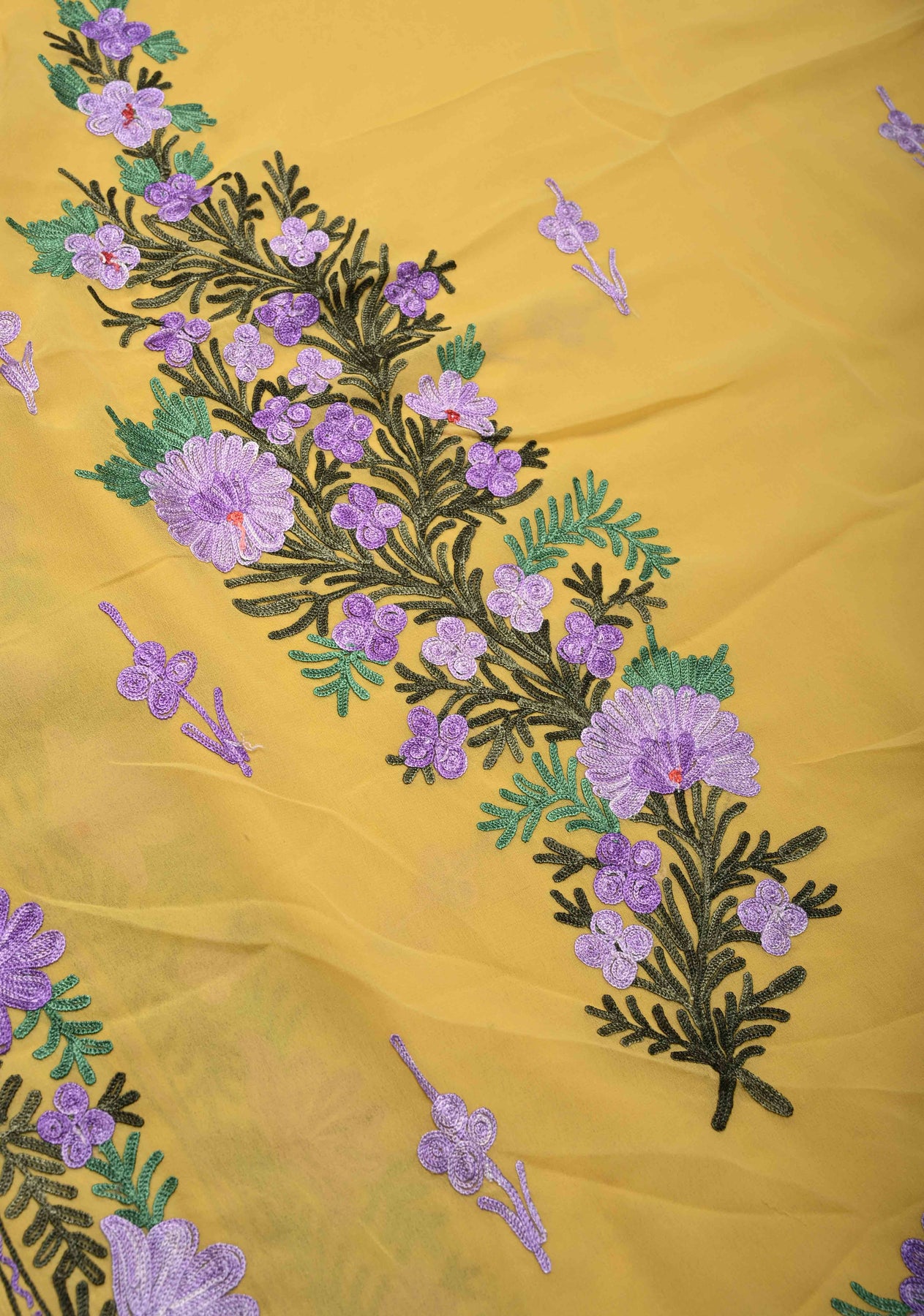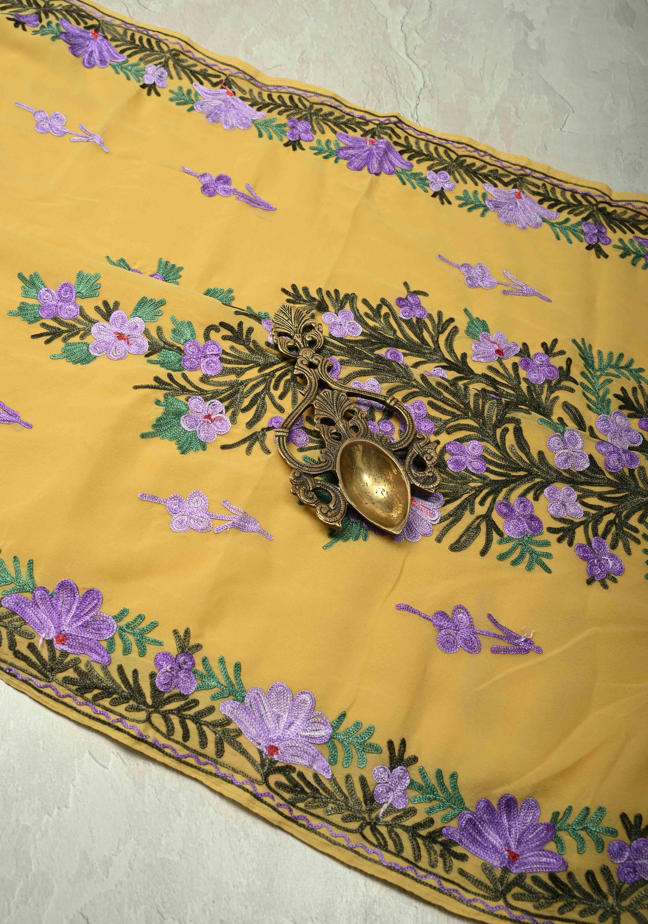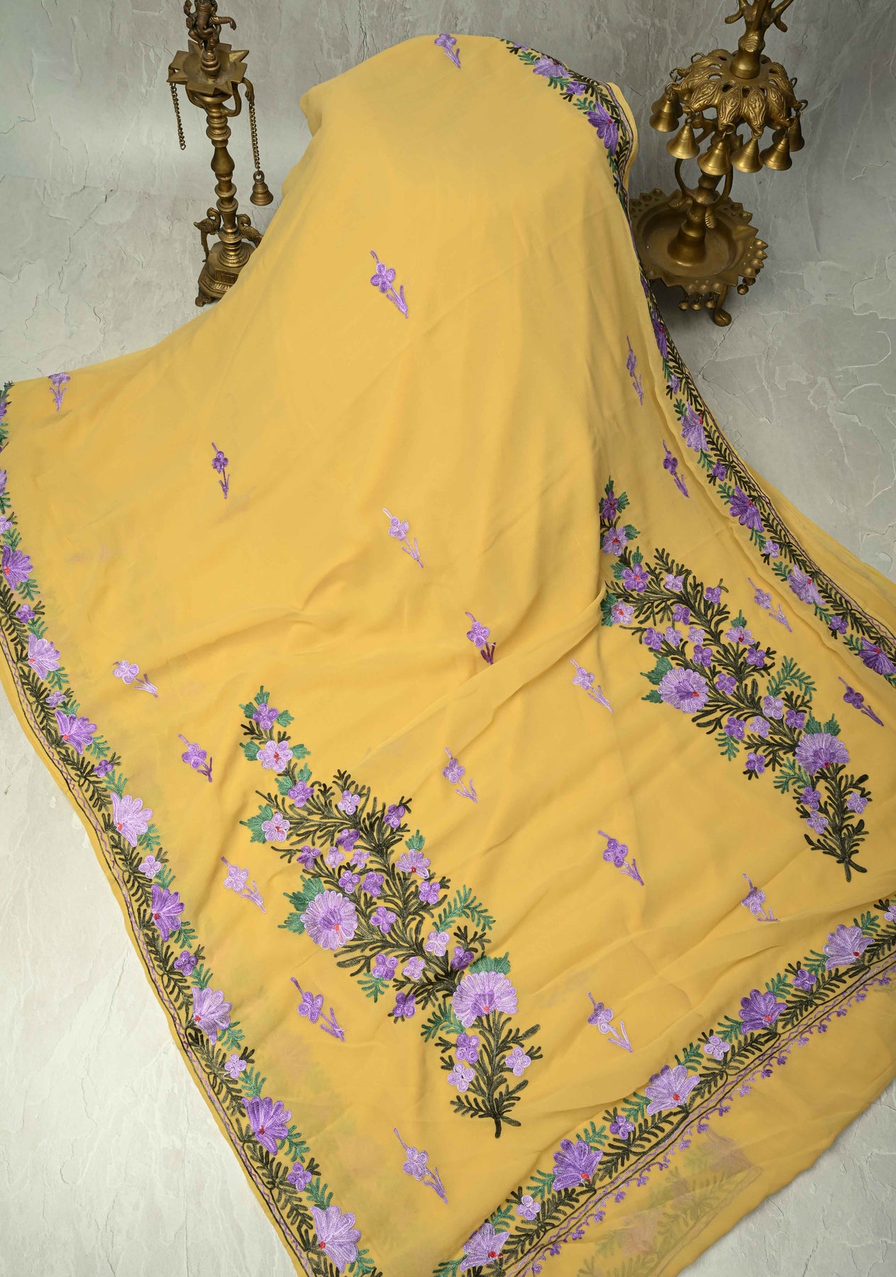 Yellow Kashmiri Aari Georgette Saree with Floral Embroidery