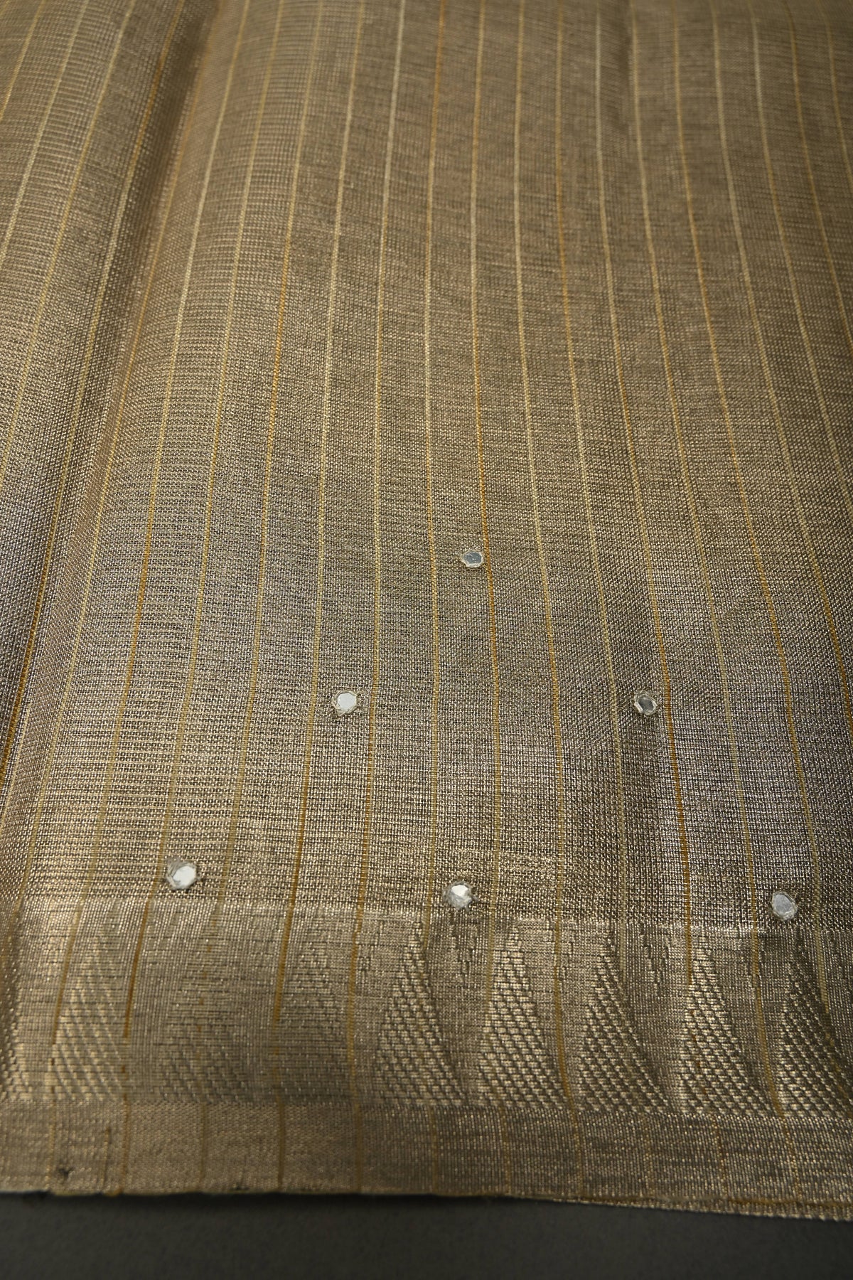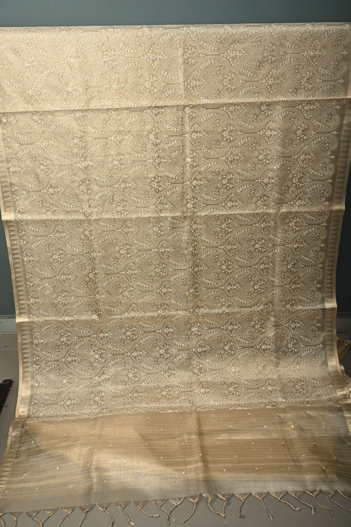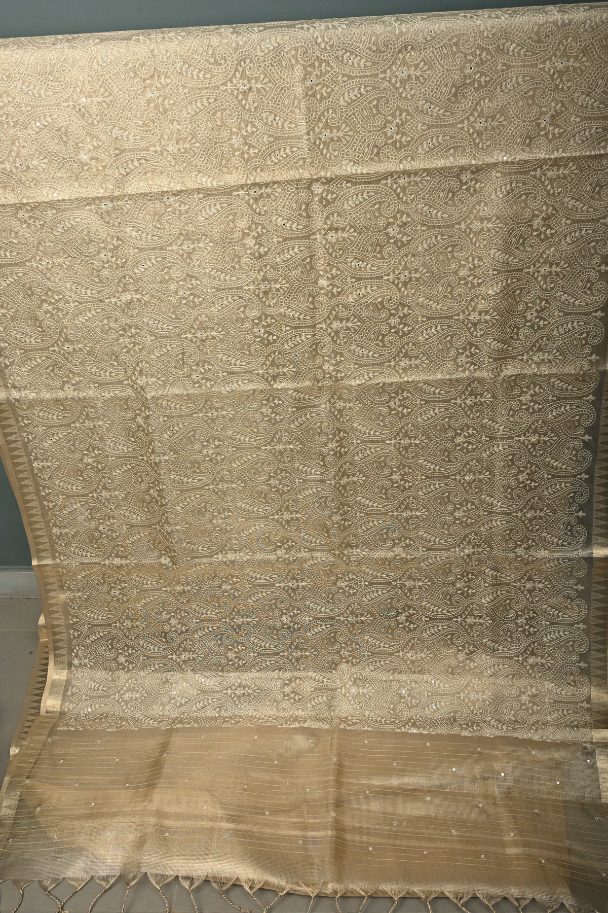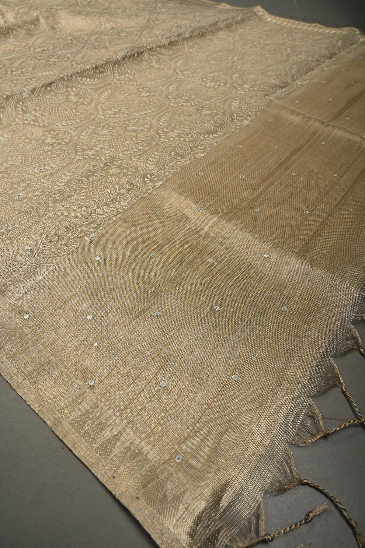 Elevate your ethnic wardrobe with this Muted Gold Kota Doria Tissue Saree, featuring subtle muted jaal machine embroidery and a refined zari border. Crafted from lightweight Kota Doria tissue fabric, the saree drapes gracefully, offering a soft and airy feel perfect for all-day wear. The delicate machine-embroidered jaal adds understated elegance, while the zari border lends a touch of shimmer, making it ideal for festive gatherings, daytime celebrations, or casual formal events. A timeless piece that blends traditional craftsmanship with contemporary sophistication.