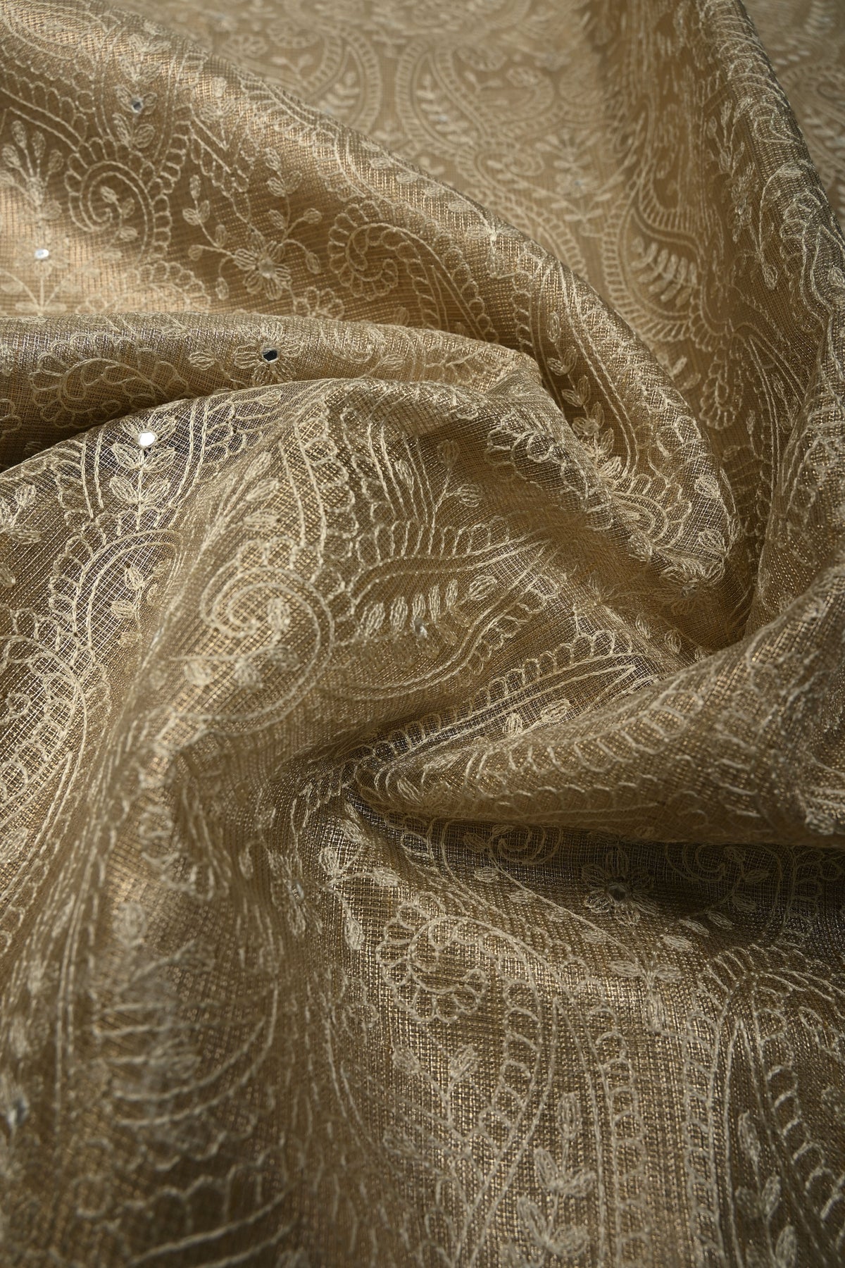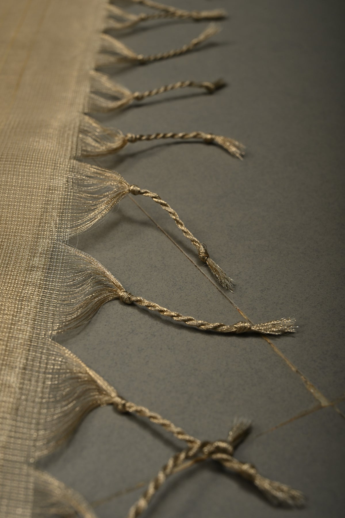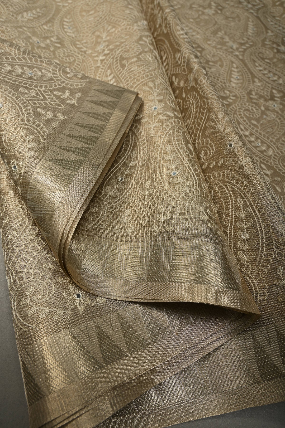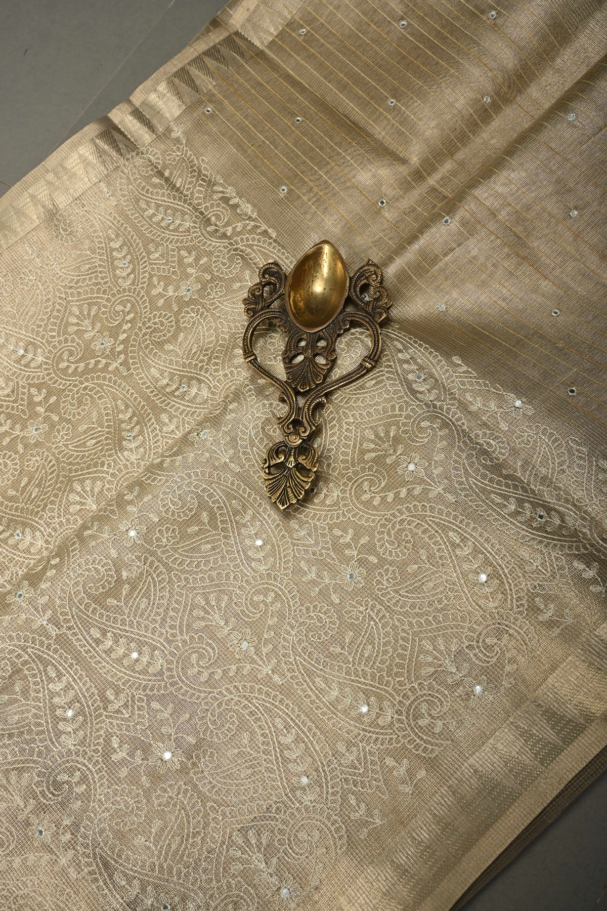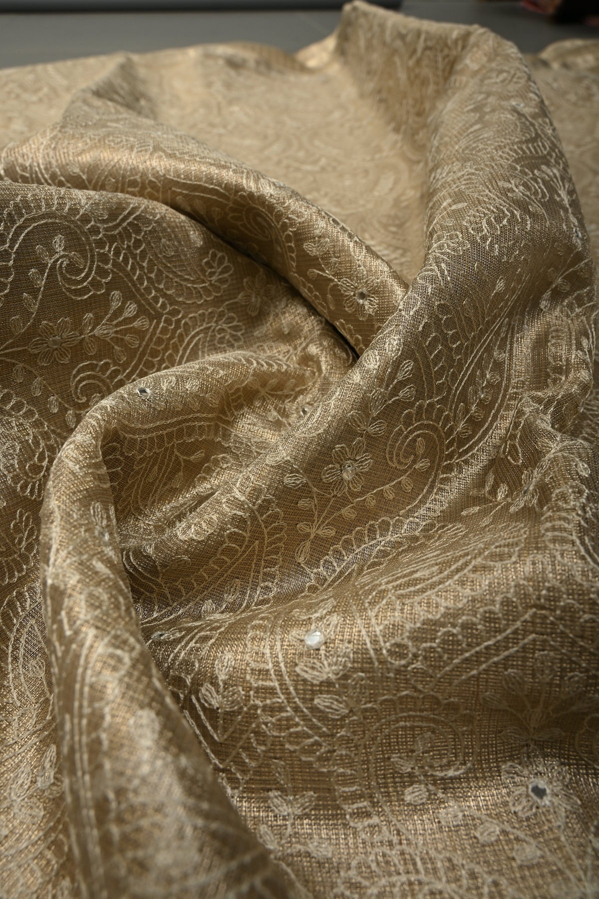 Elevate your ethnic wardrobe with this Muted Gold Kota Doria Tissue Saree, featuring subtle muted jaal machine embroidery and a refined zari border. Crafted from lightweight Kota Doria tissue fabric, the saree drapes gracefully, offering a soft and airy feel perfect for all-day wear. The delicate machine-embroidered jaal adds understated elegance, while the zari border lends a touch of shimmer, making it ideal for festive gatherings, daytime celebrations, or casual formal events. A timeless piece that blends traditional craftsmanship with contemporary sophistication.