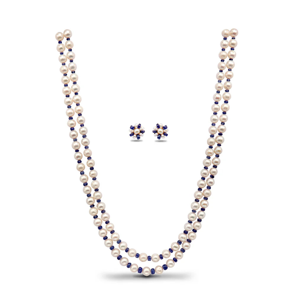 This elegant 2-row necklace features radiant 6-7MM round white freshwater cultured pearls, paired with dazzling faceted blue natural sapphires. With an approximate weight of 50.400 grams and a length of 18–19 inches, the AA quality pearls offer a soft glow that complements the rich sapphire hues beautifully. Expertly handcrafted and backed by a lifelong guarantee on pearls and natural stones, this piece reflects timeless grace and durability. A perfect statement for formal occasions, cultural celebrations, or evening wear—it enhances both traditional and modern ensembles with refined charm.