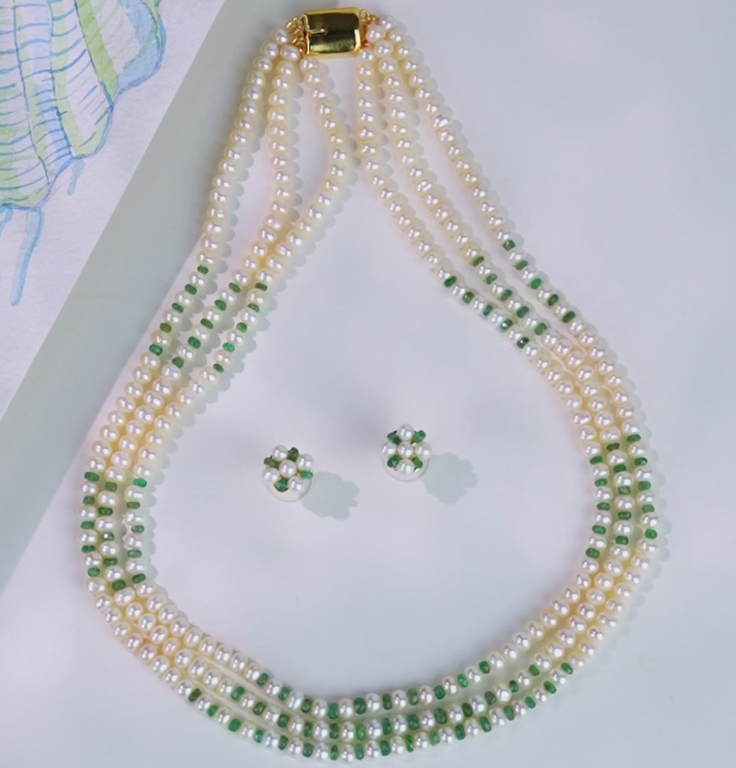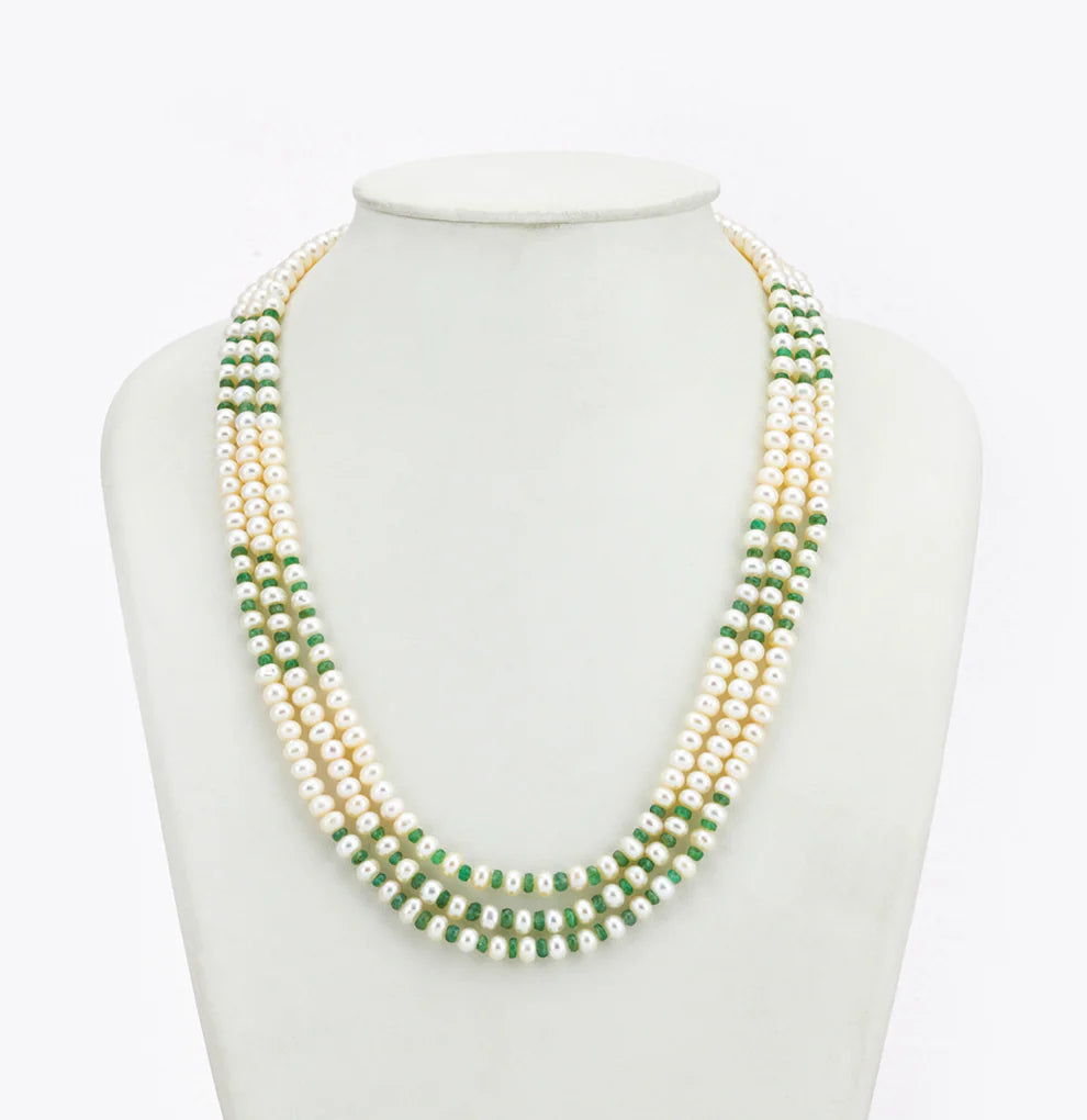 Embrace refined elegance with this 3-row necklace featuring AA-quality freshwater cultured white button pearls, sized 5–6 mm, and adorned with cut-faceted natural emeralds. Weighing approximately 57.4 grams and measuring 18 inches in length, this necklace offers a perfect balance of grace and color. The vivid green of the emeralds enhances the serene beauty of the pearls, all backed by a lifelong guarantee on pearls and natural stones. Ideal for weddings, cultural festivities, and evening gatherings, this piece complements traditional outfits and contemporary fusion wear with timeless sophistication.