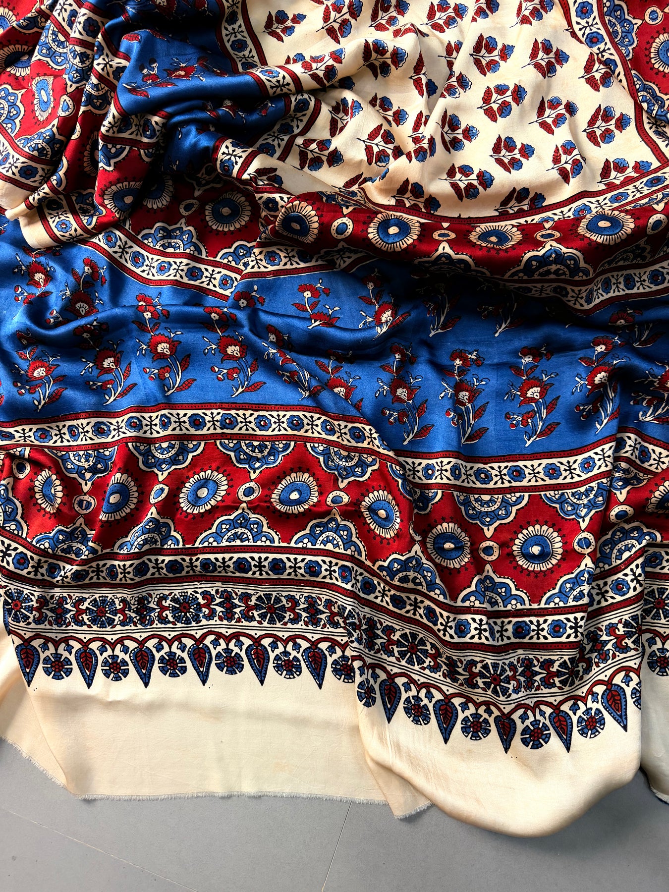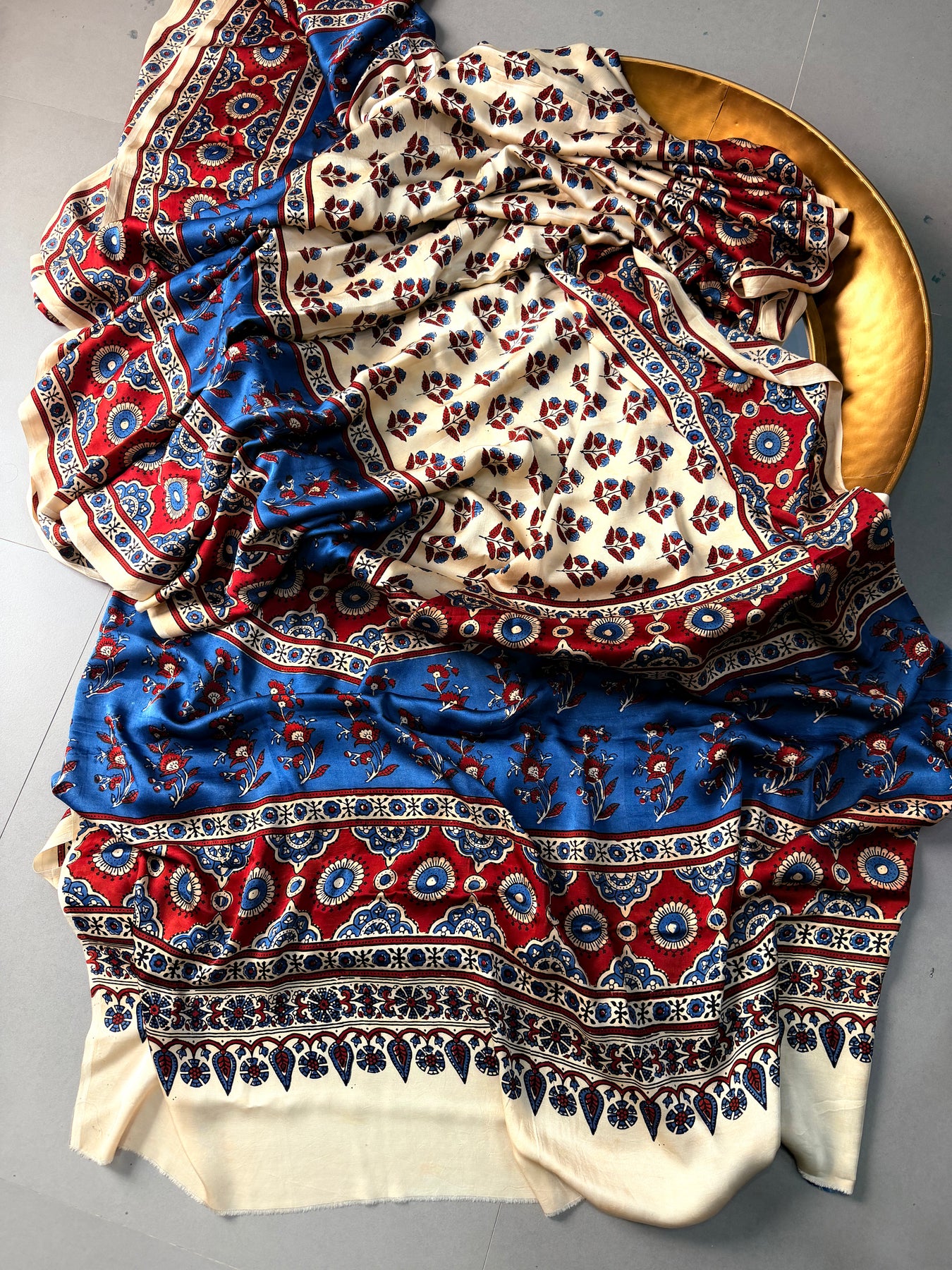 This Off White Ajrakh Style Mughal Hand Block Print on Modal Silk Saree is a timeless blend of regal aesthetics and traditional craftsmanship. Crafted from modal silk, the saree features intricate Mughal-inspired motifs rendered in classic Ajrakh-style hand block printing. The elegant panel design adds structure and visual depth, while the beautifully detailed border frames the saree with refined sophistication. Set against a serene off-white base, the rich patterns stand out gracefully, creating a look that is both subtle and statement-worthy. With its soft drape and artisanal detailing, this saree is perfect for festive occasions, cultural gatherings, and elegant daytime celebrations.