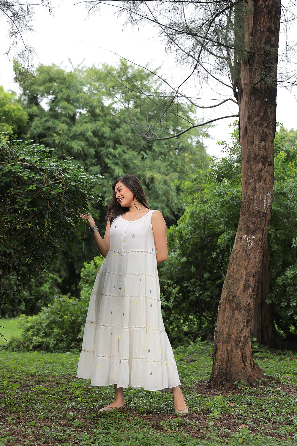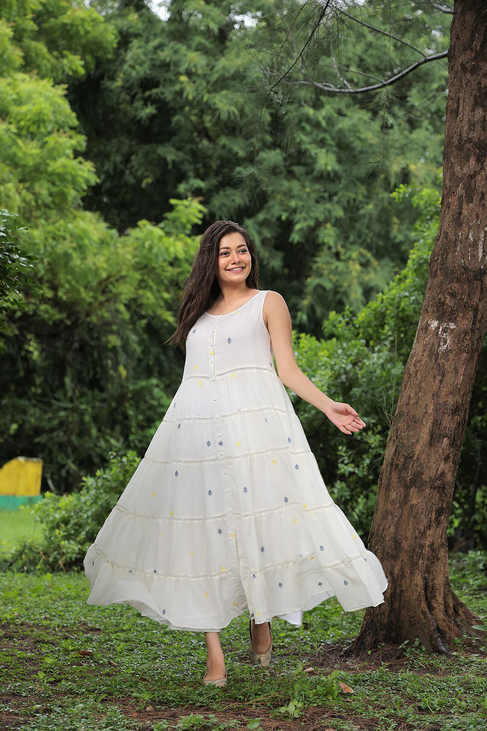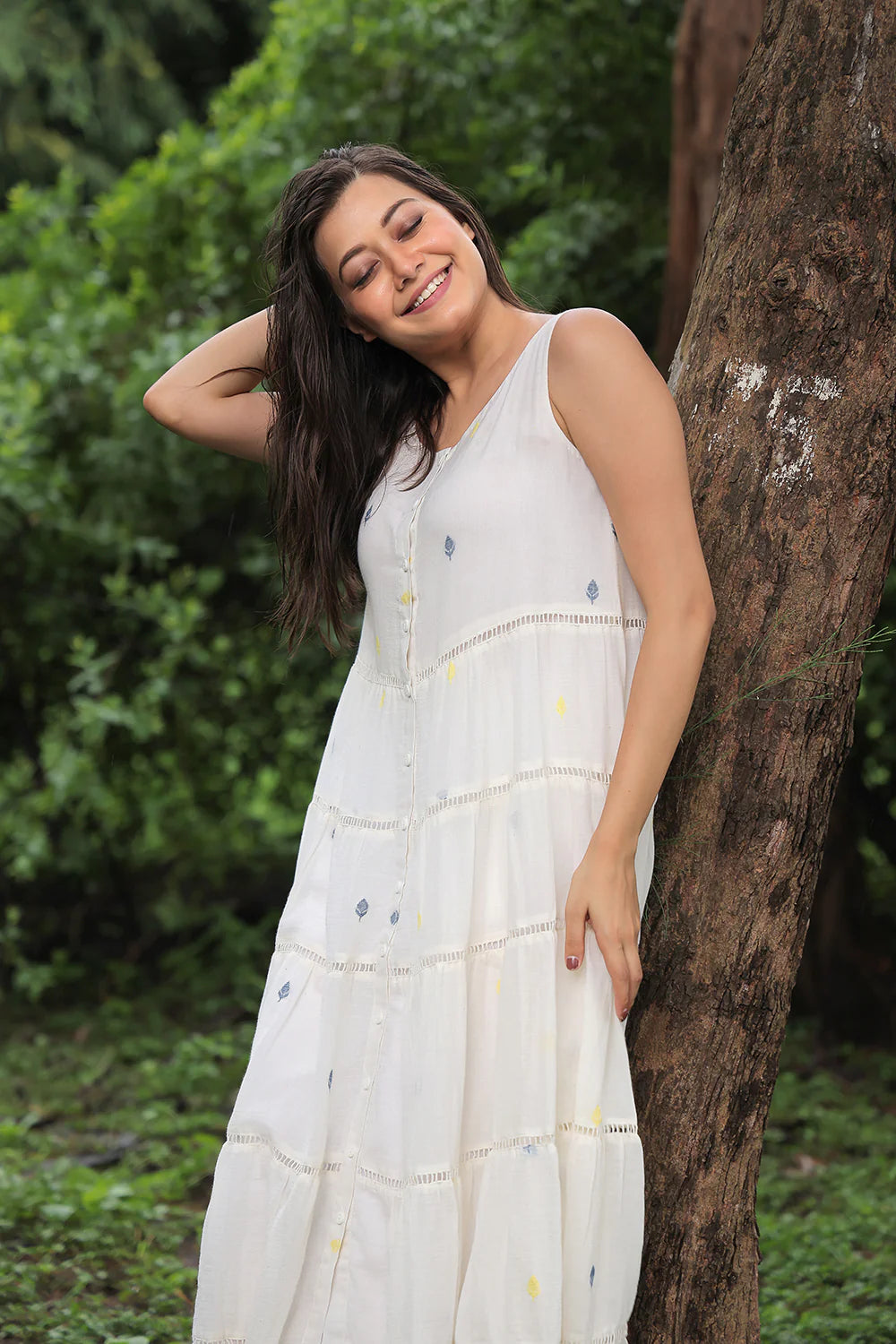 Elevate your style with our sleeveless handwoven pure cotton Jamdani dress. Featuring a flared silhouette and elegant front buttons, this dress combines traditional craftsmanship with modern design. The attached lining ensures comfort and ease, making it perfect for any occasion. Embrace timeless elegance with this versatile piece, handcrafted to perfection for the discerning fashionista.
