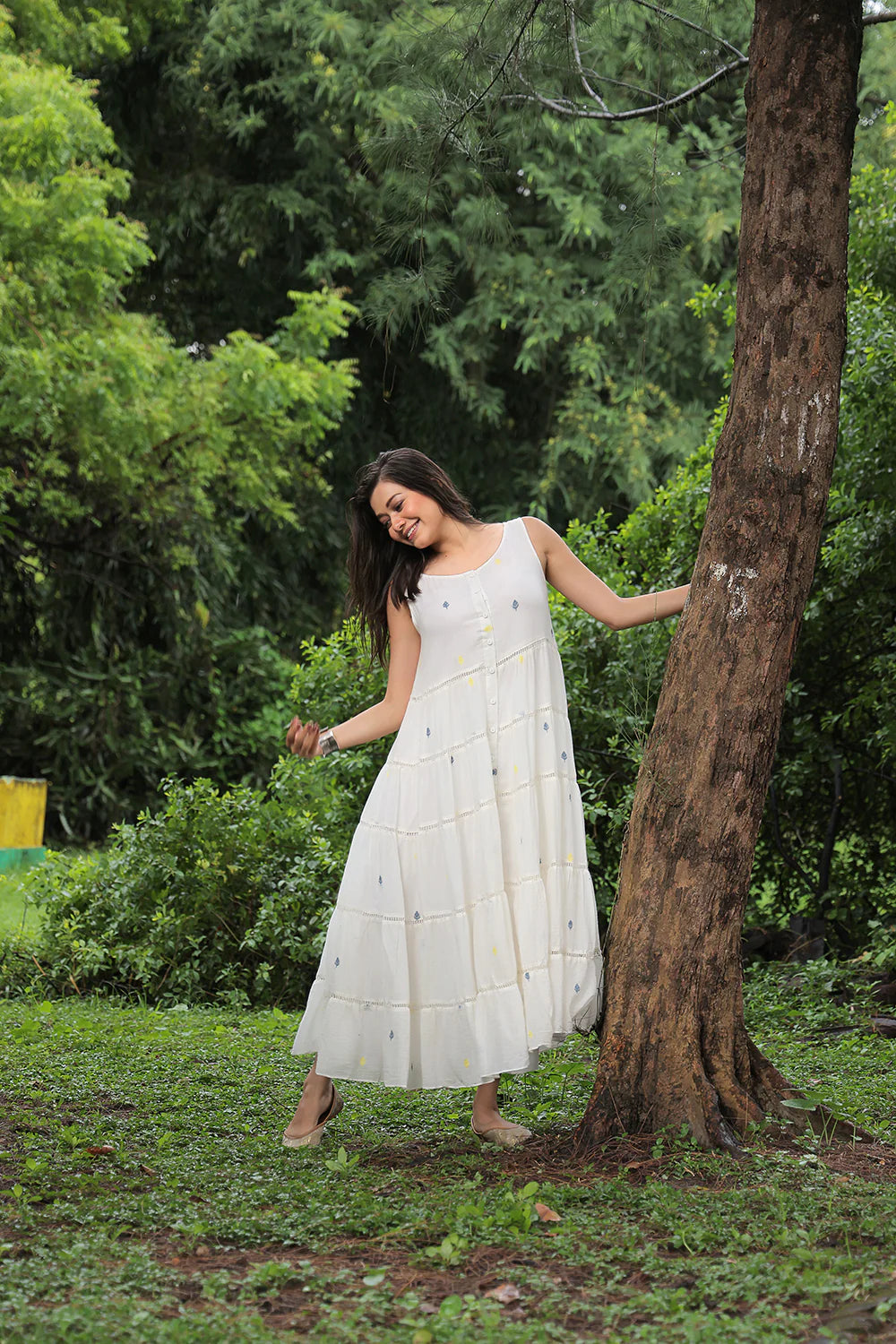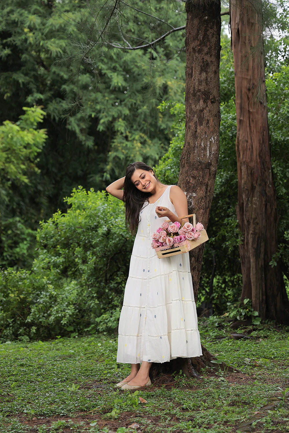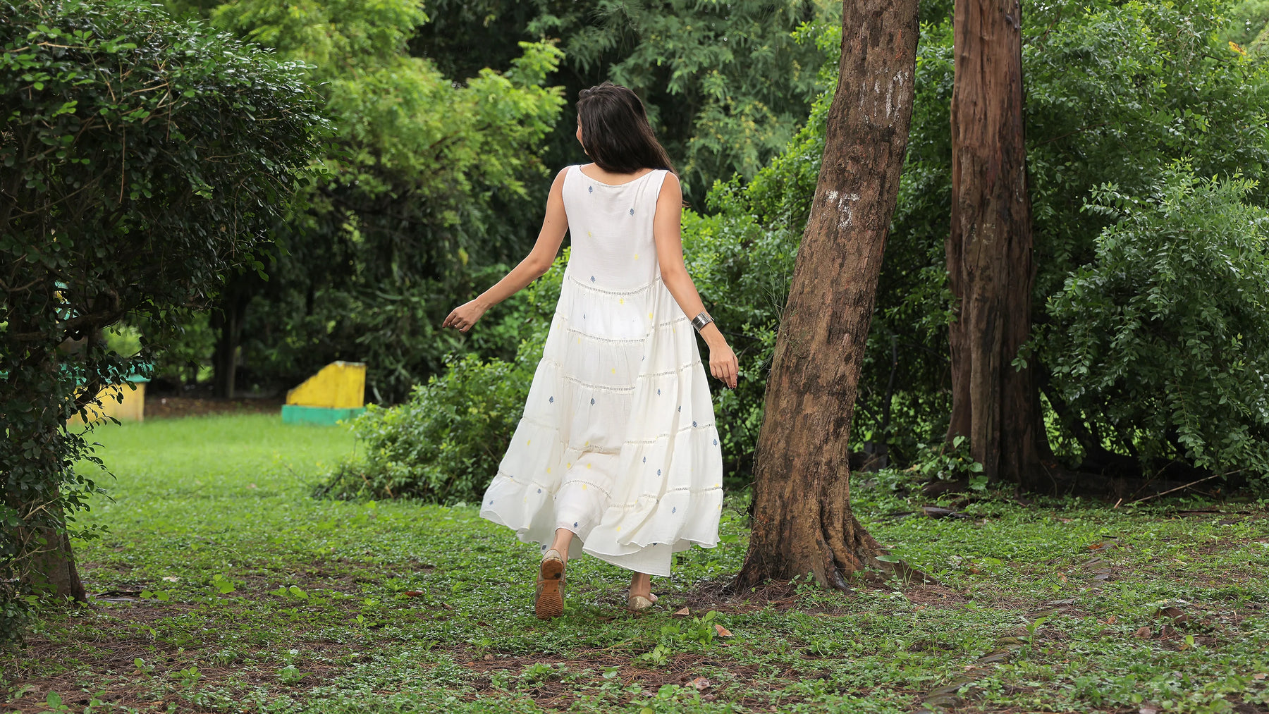 Elevate your style with our sleeveless handwoven pure cotton Jamdani dress. Featuring a flared silhouette and elegant front buttons, this dress combines traditional craftsmanship with modern design. The attached lining ensures comfort and ease, making it perfect for any occasion. Embrace timeless elegance with this versatile piece, handcrafted to perfection for the discerning fashionista.