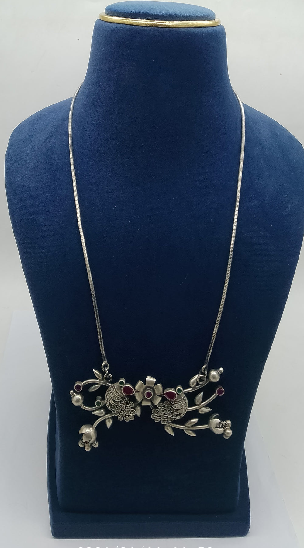Embrace the beauty of nature with our Handcrafted Oxidized Silver Bird Motif Necklace. This artisanal piece features a symmetrical twin bird design nestled within a delicate floral vine. Adorned with subtle ruby-red and emerald-green stone accents, the antique matte finish offers a sophisticated, timeless look perfect for any occasion