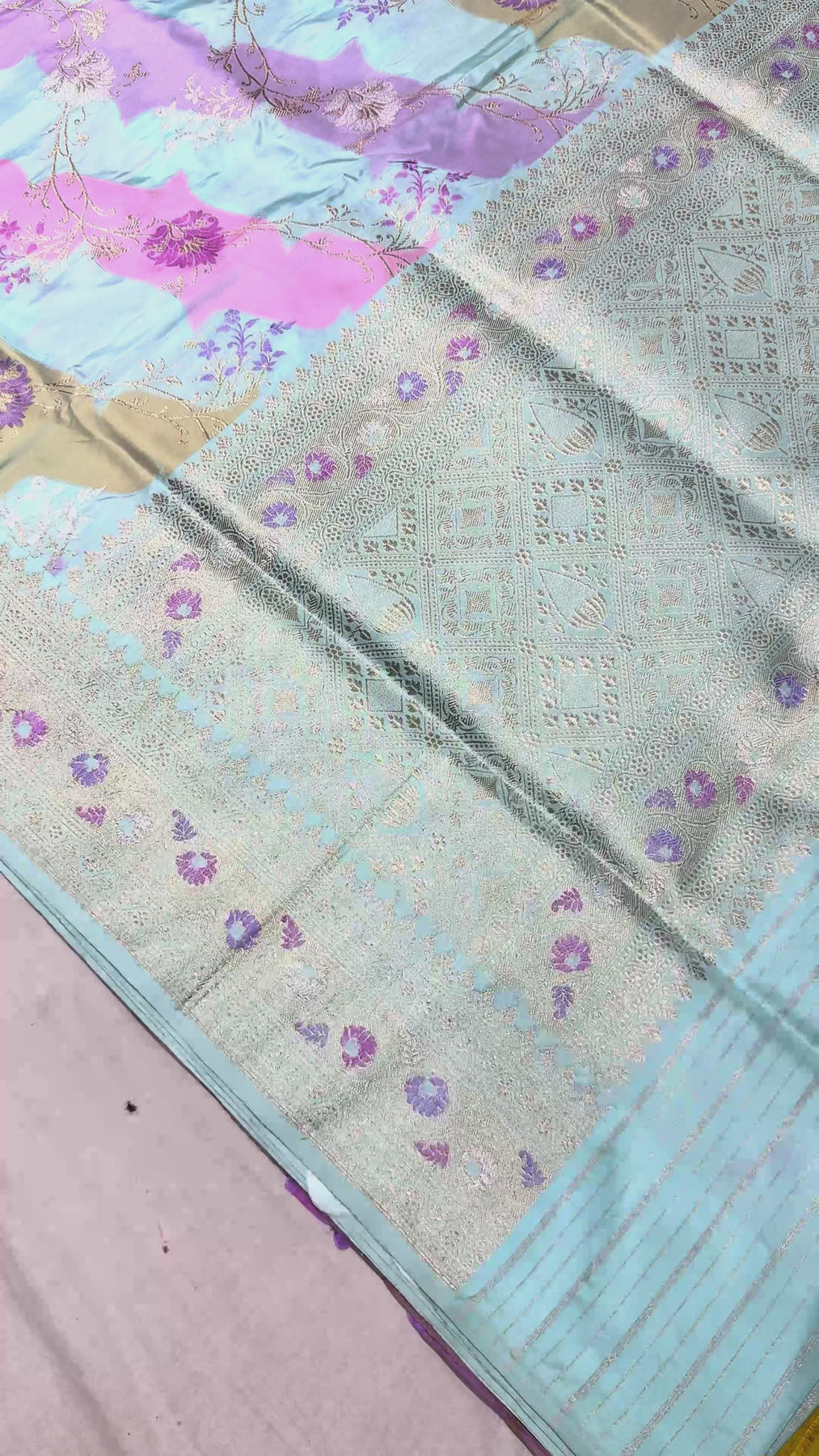 Delicate, graceful, and exquisitely handwoven, this Pastel-Hued Rangkaat Kadhuwa Banarasi Silk Saree is a timeless expression of heritage craftsmanship. The soft, multi-toned Rangkaat weave brings a gentle medley of pastel shades to life, seamlessly blended across the body. Adorned with intricately woven Meenakari buttas in vibrant resham and zari, each motif is crafted using the meticulous Kadhuwa technique for lasting beauty and definition. The saree is finished with a luminous zari border, adding elegance and a subtle regal touch. Ideal for weddings, festive celebrations, or refined daywear, this saree captures the essence of understated luxury and tradition