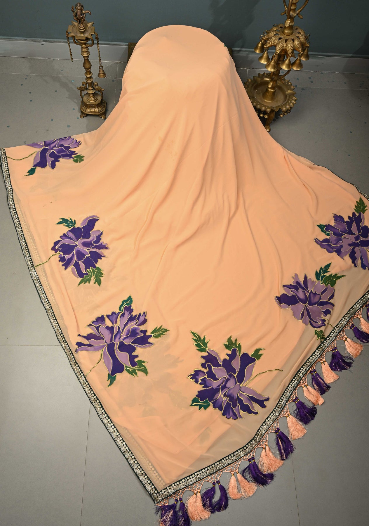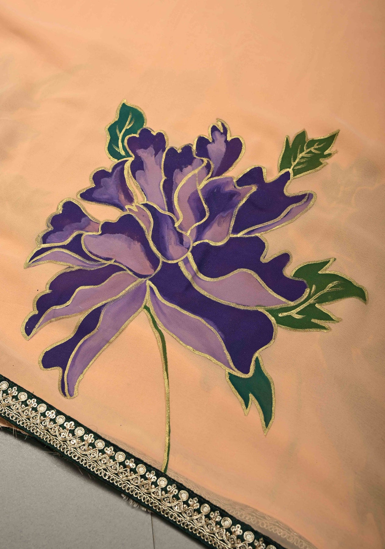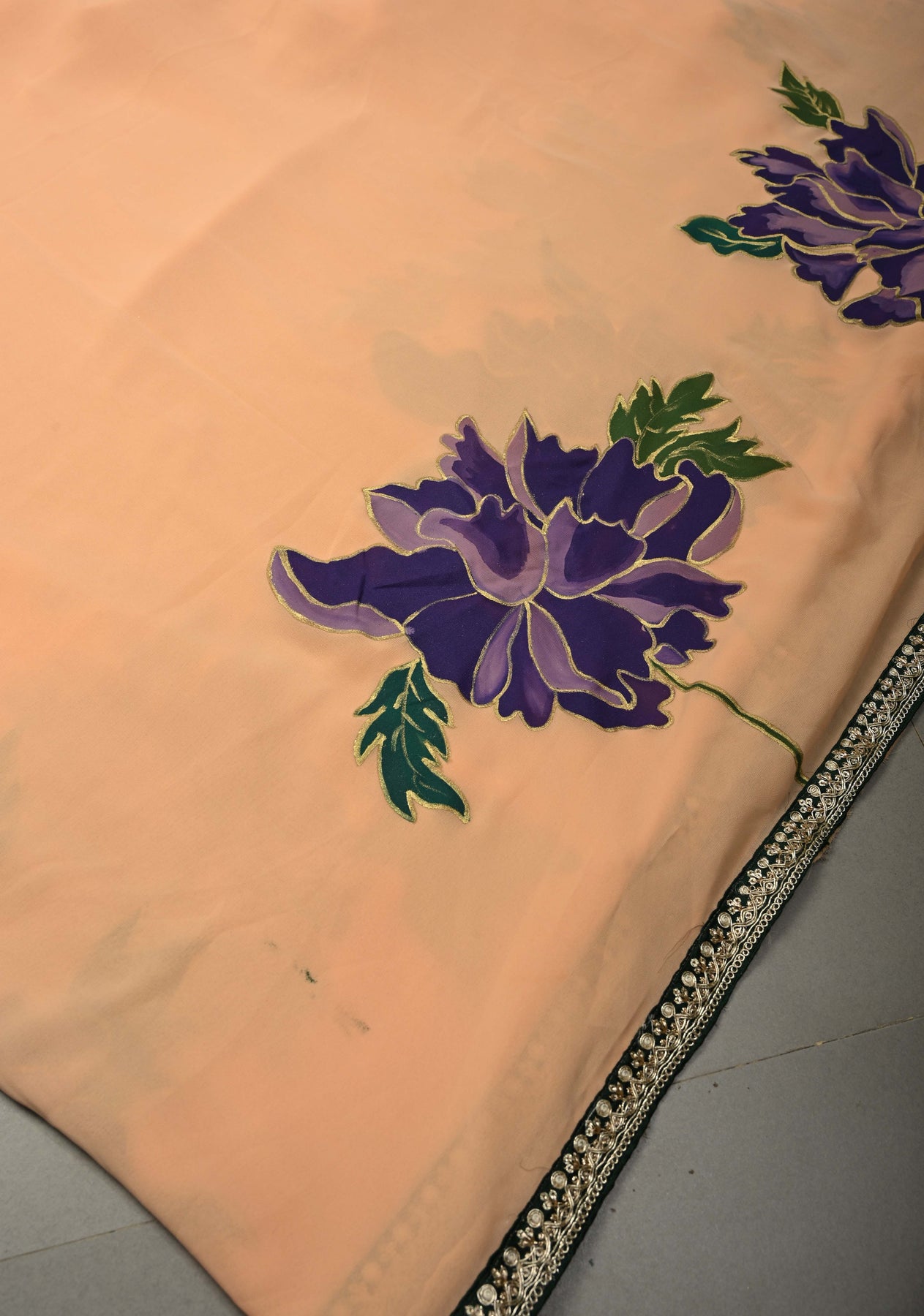 The saree is adorned with large, hand-painted floral motifs, adding an eye-catching, artistic appeal to its soft peach base. A minimal fancy lace border enhances the overall design without overpowering the delicate artwork, giving it a refined and elegant finish. Ideal for festive occasions, casual gatherings, parties, or cultural events, this saree combines artistry with graceful simplicity.