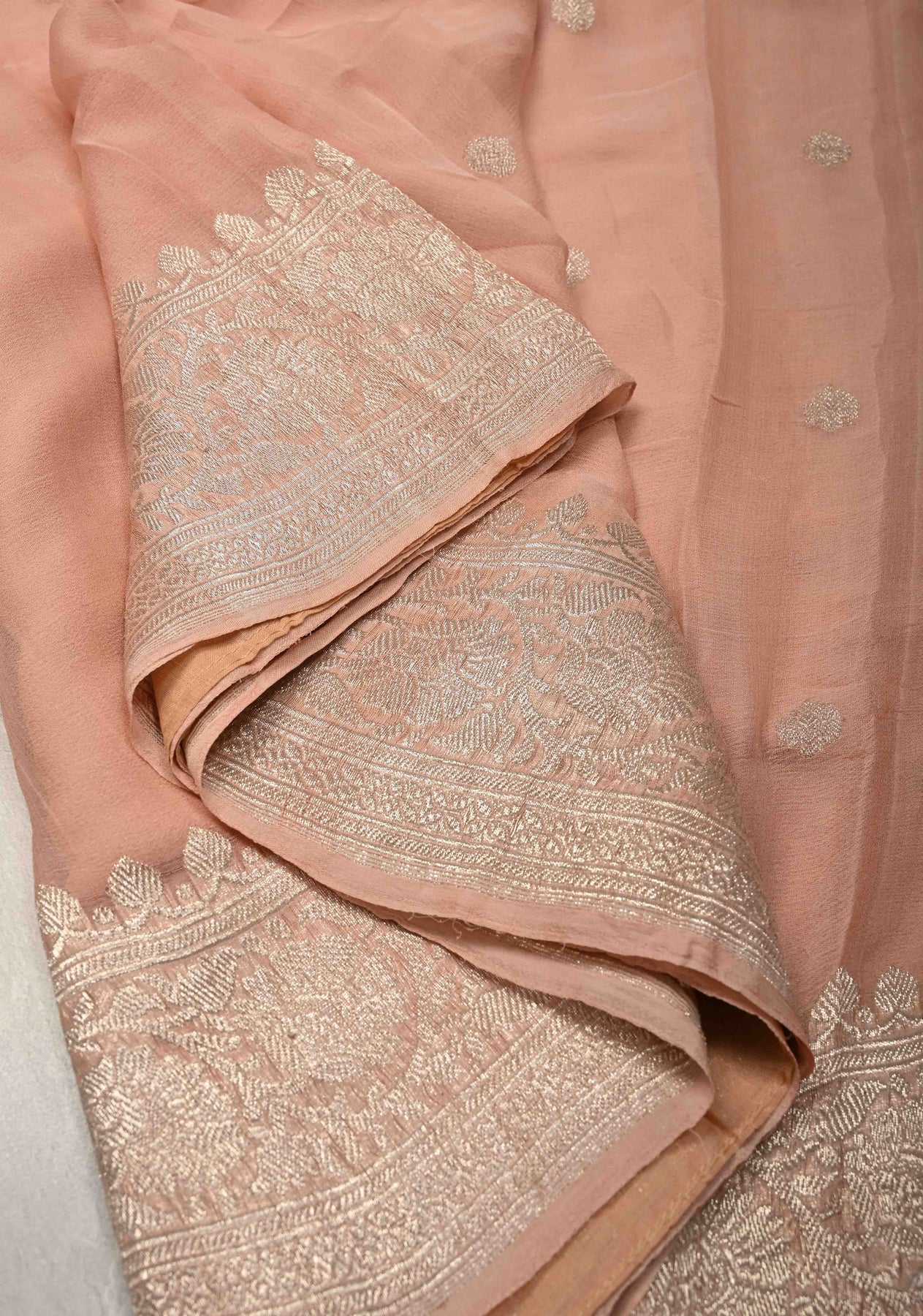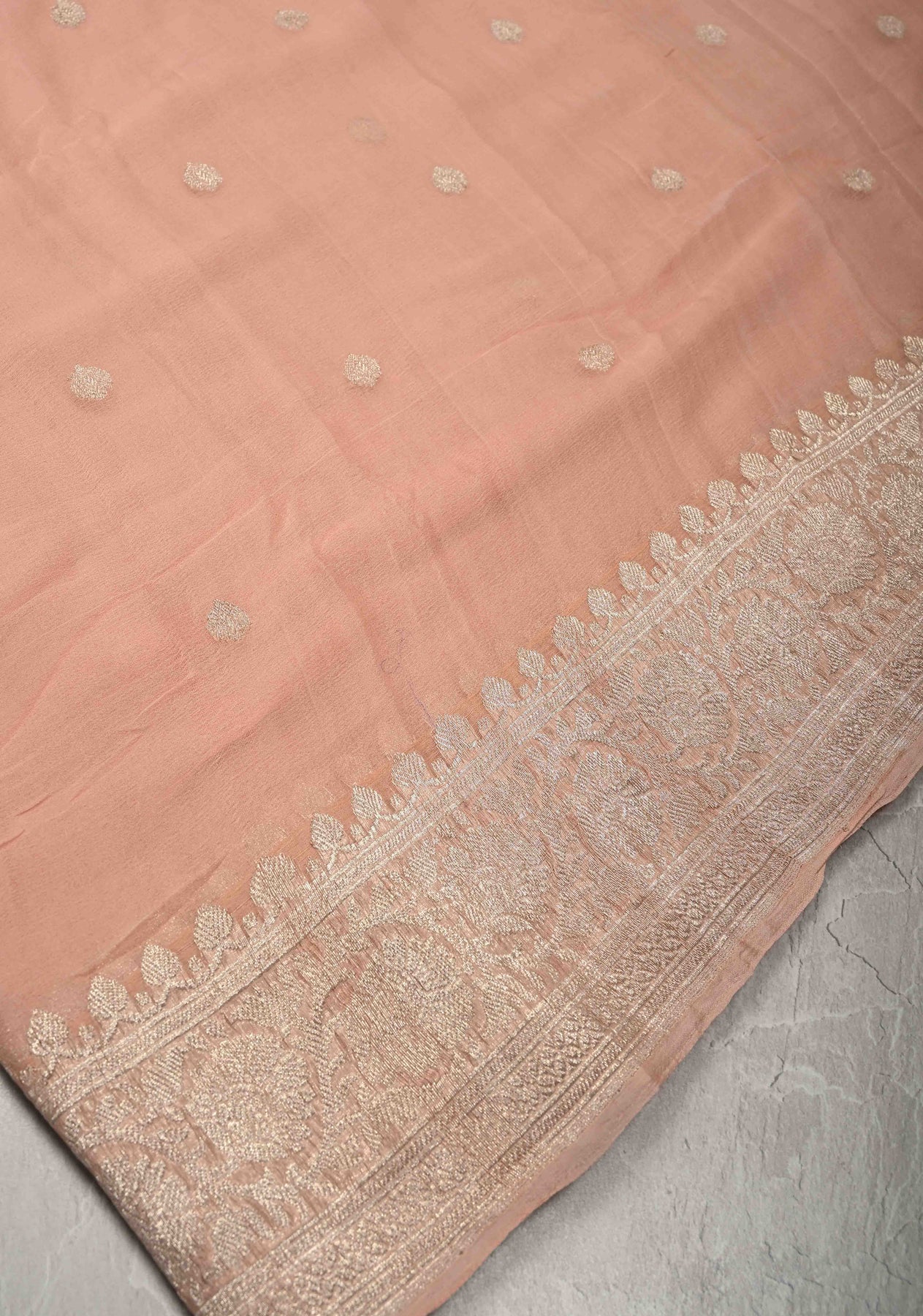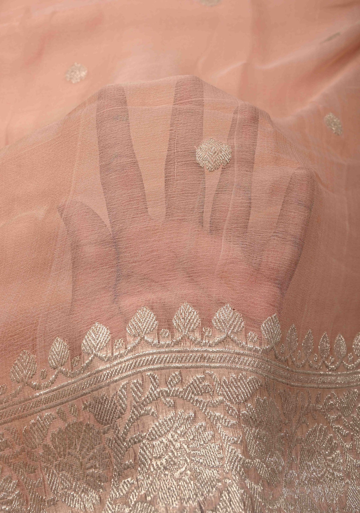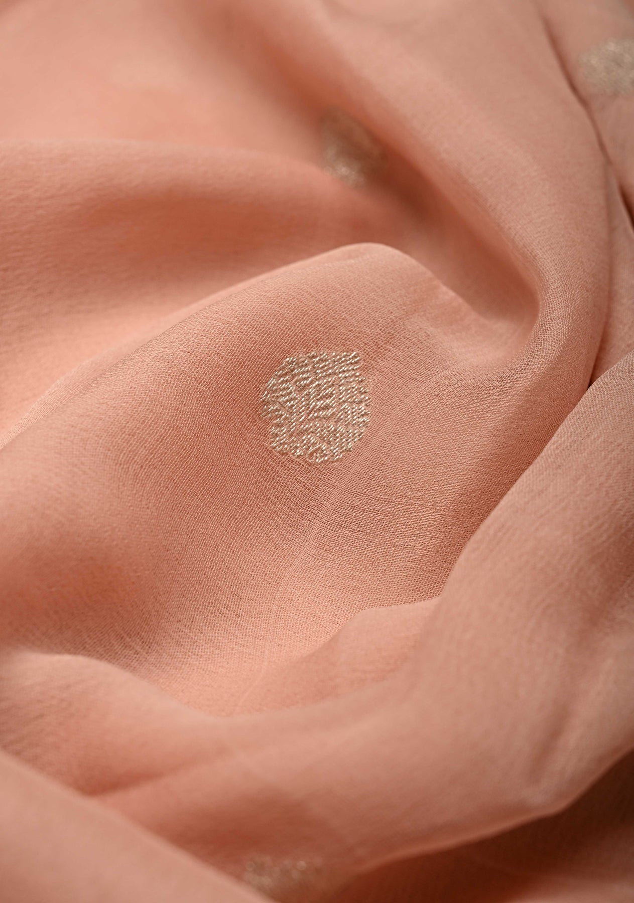 Peach Puff Chiffon Silk Saree with Zari Buttas and Zari Border | SILK MARK CERTIFIED