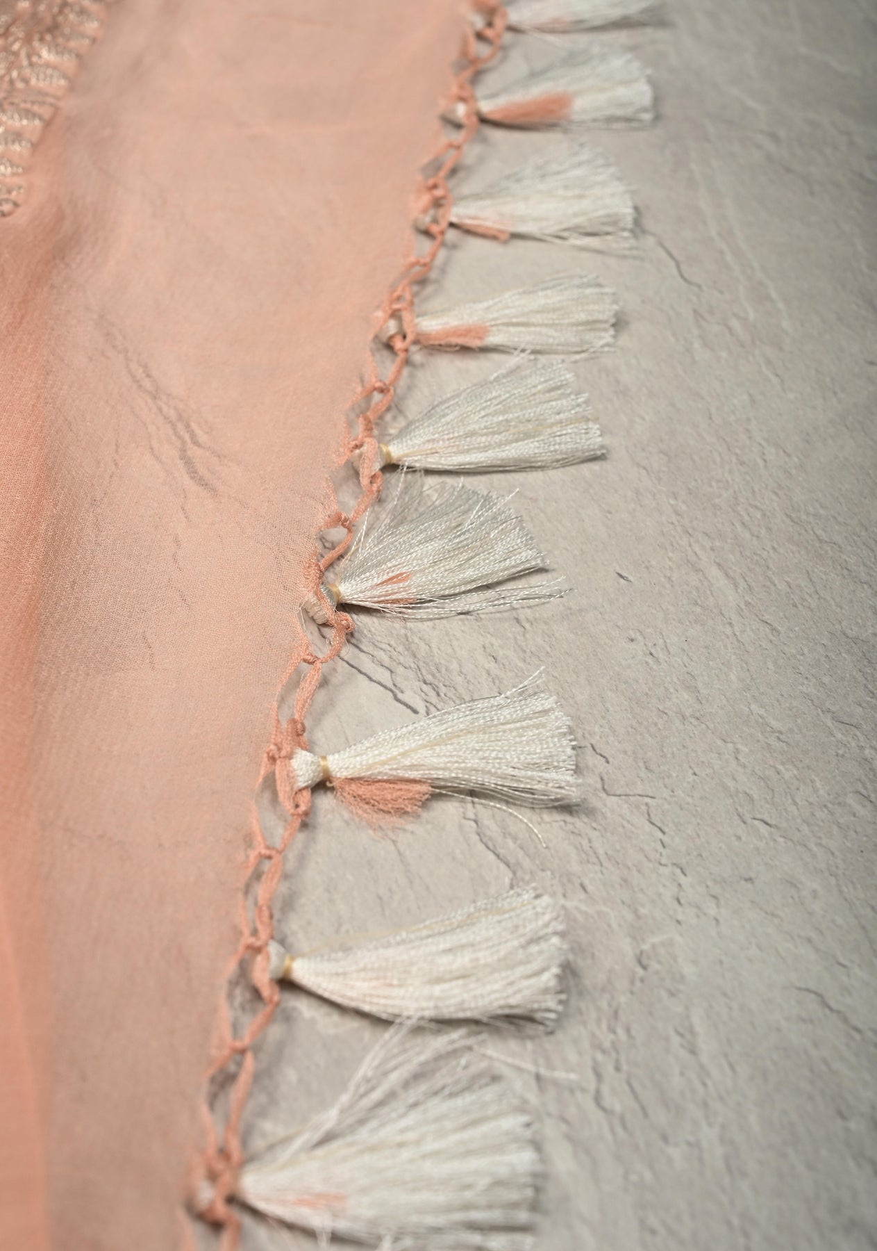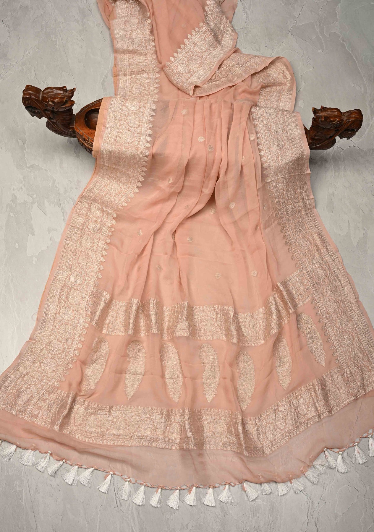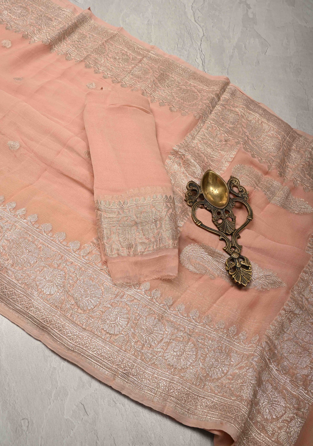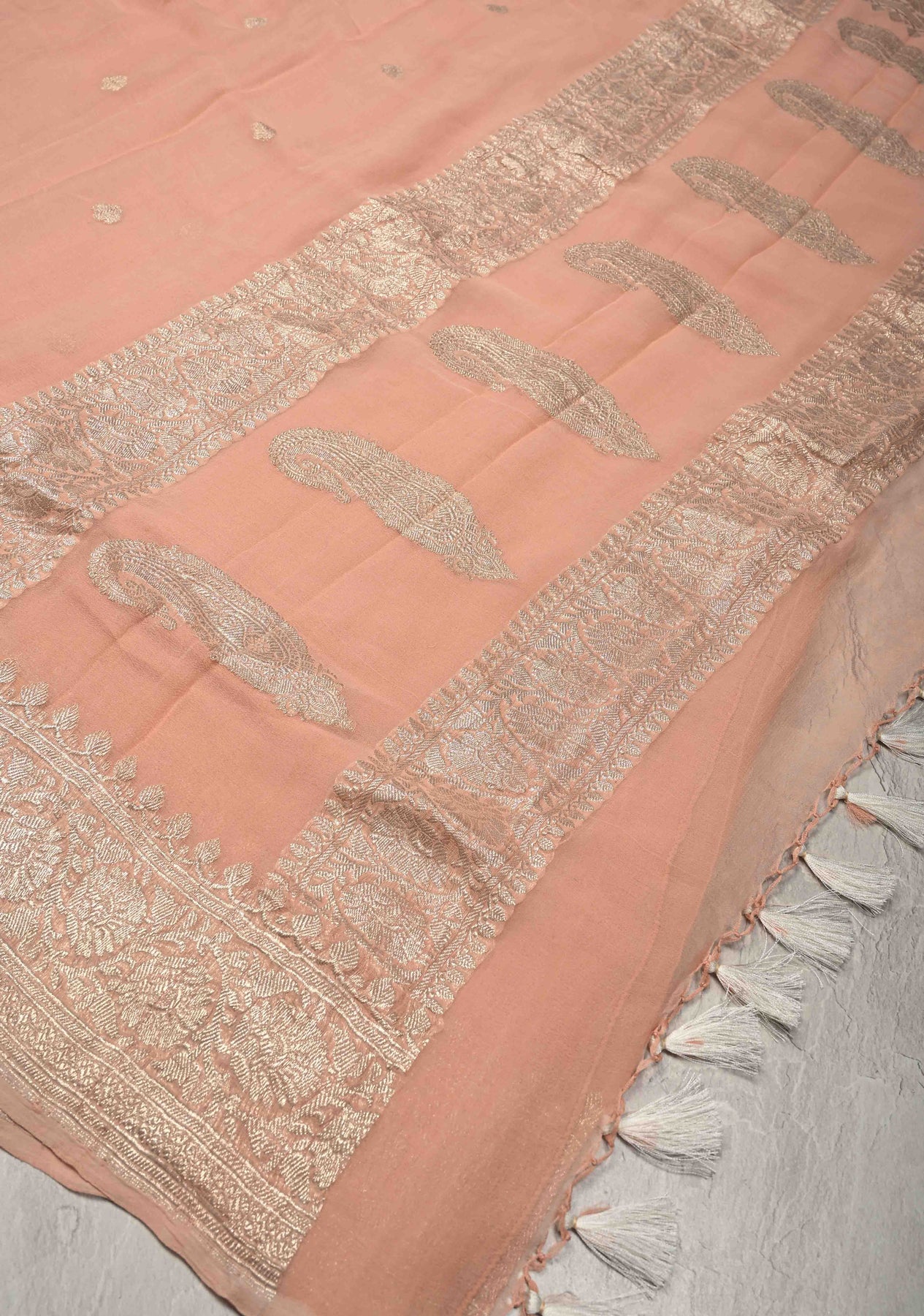 Peach Puff Chiffon Silk Saree with Zari Buttas and Zari Border | SILK MARK CERTIFIED