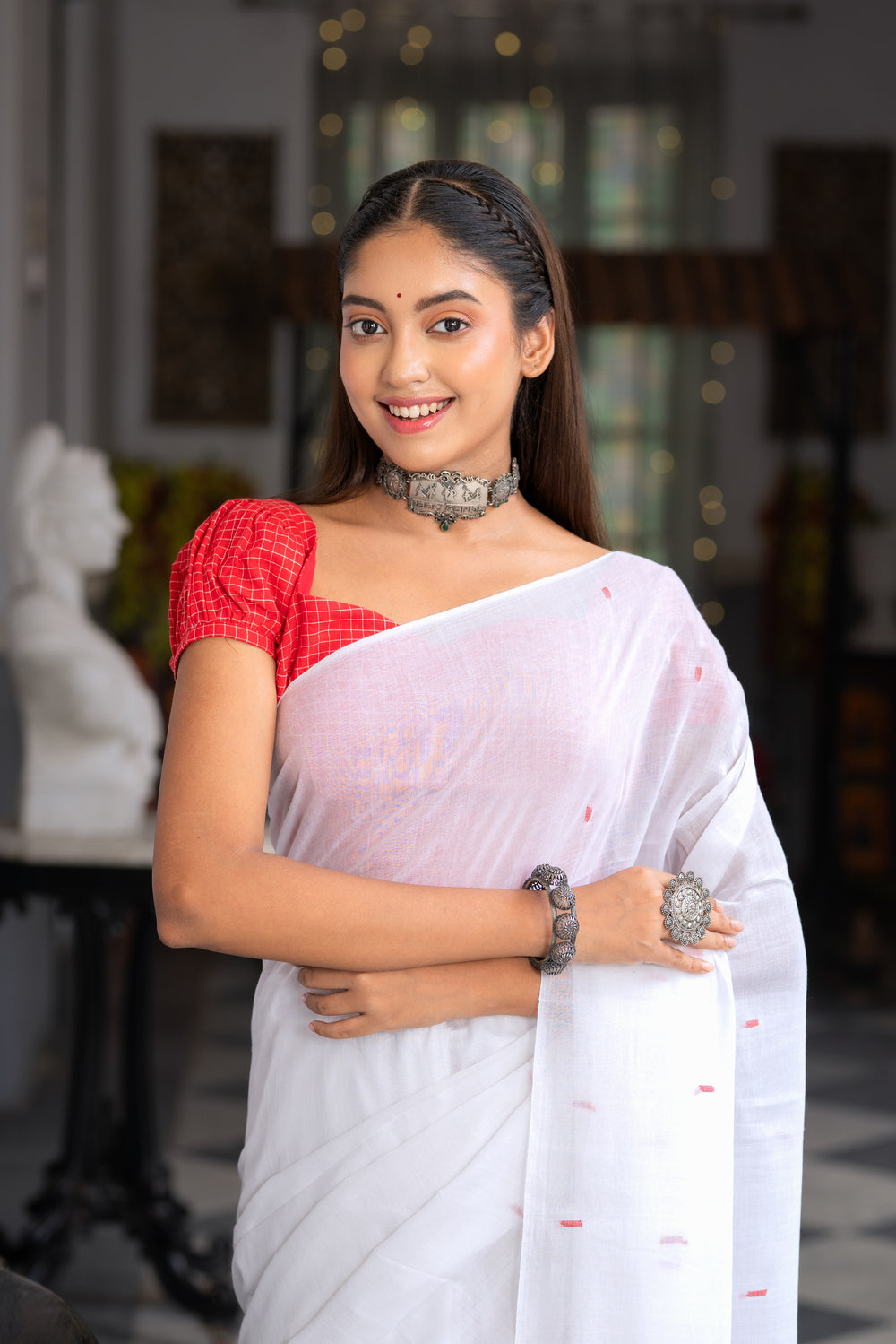 Experience timeless elegance with this handcrafted Red Jamdani blouse, made from pure cotton. The intricate floral motifs and puff sleeves add a touch of charm, while the back hook closure ensures a perfect fit. Ideal for pairing with sarees, this blouse is a beautiful blend of traditional artistry and modern style, perfect for any occasion.