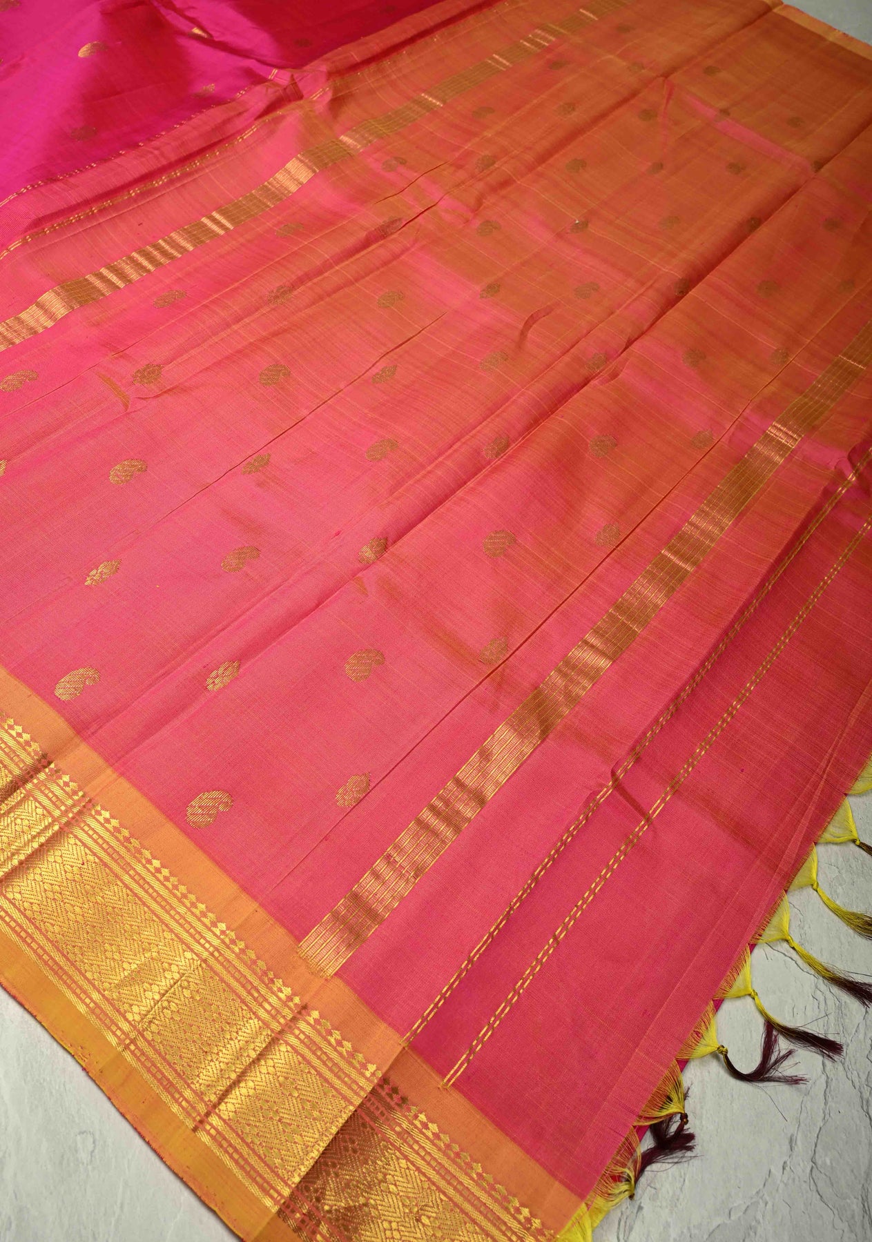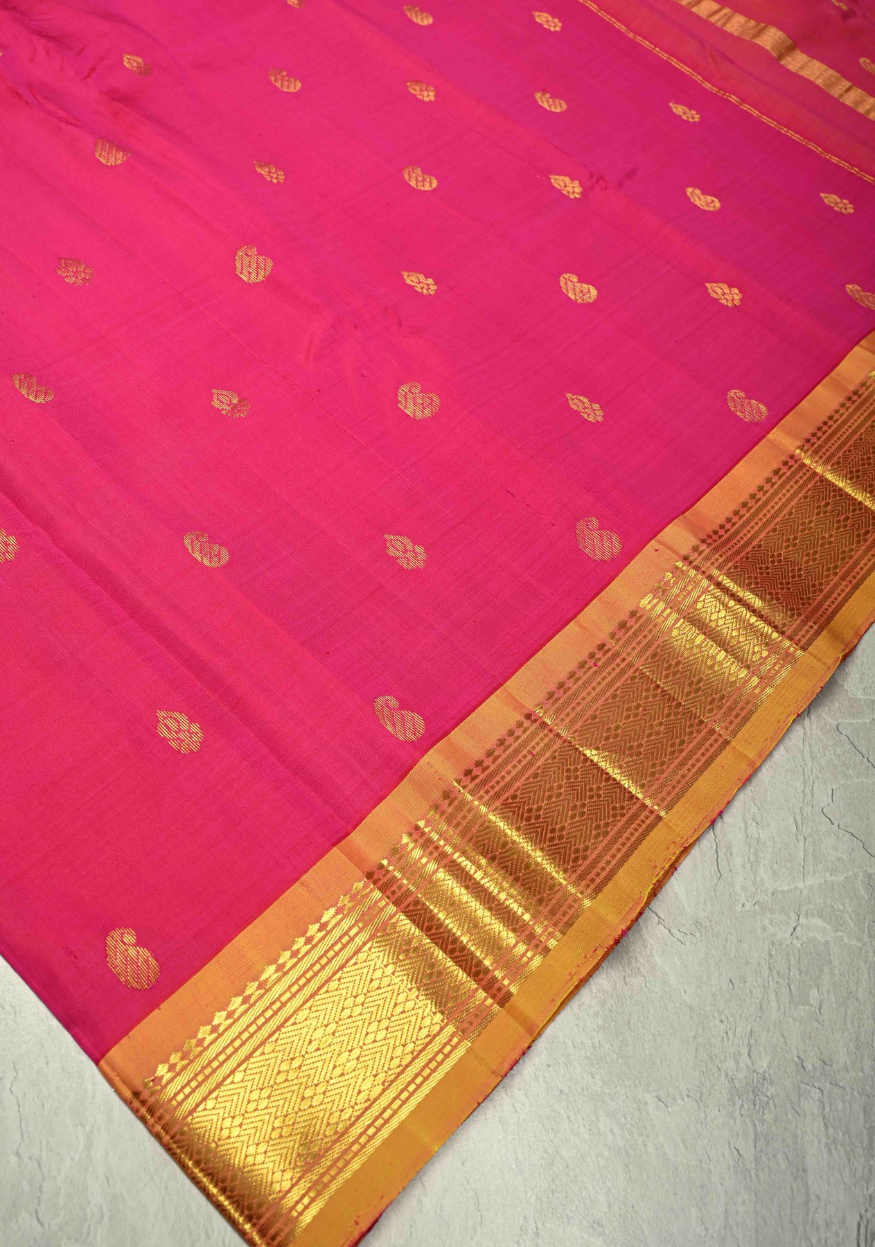 Make a bold statement with this Rani Pink Pure Kanjivaram Silk Saree Pavizham, adorned with golden zari buttas and a vibrant yellow zari border. Woven from Kanjivaram silk, this saree blends traditional South Indian craftsmanship with contemporary elegance.