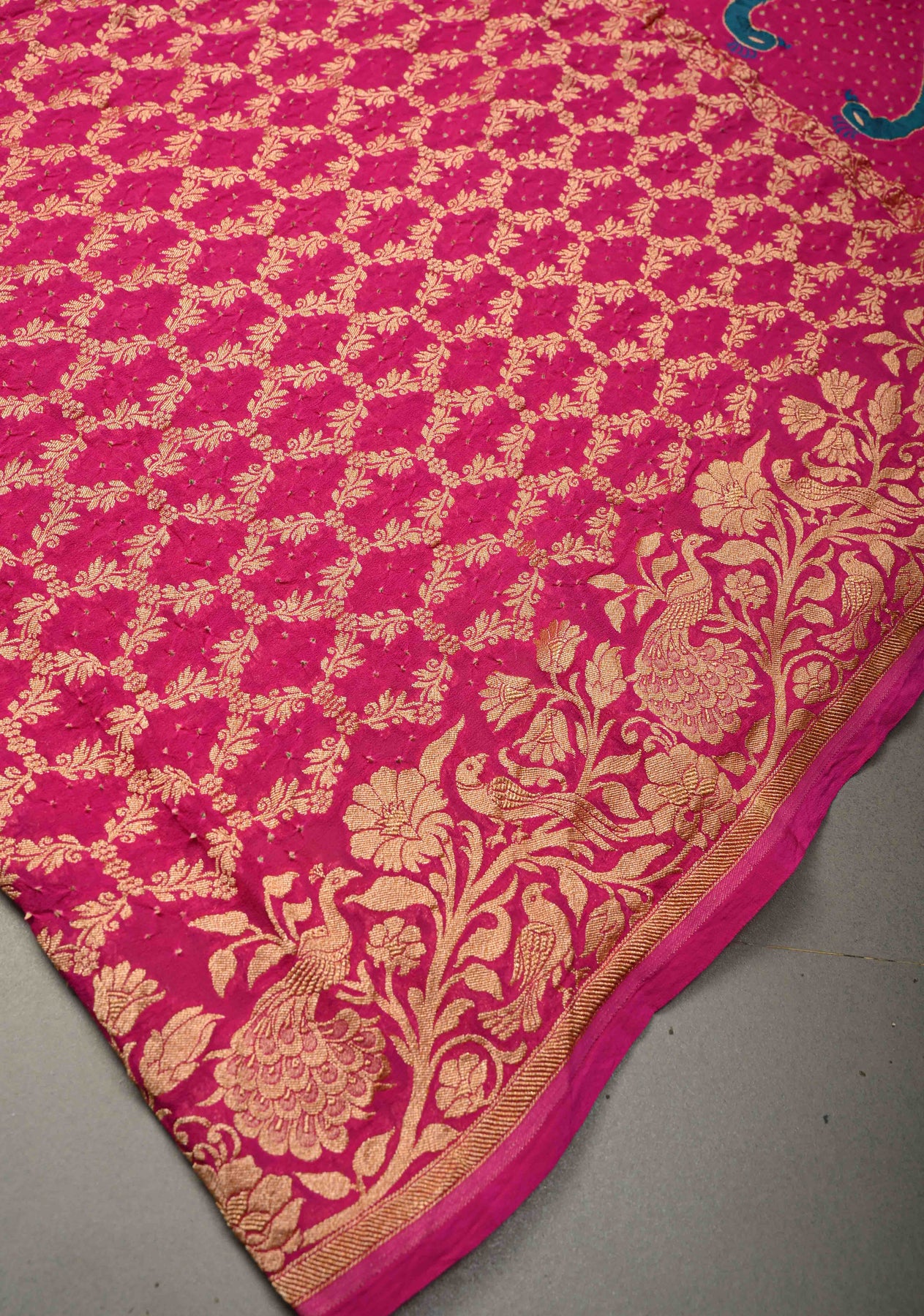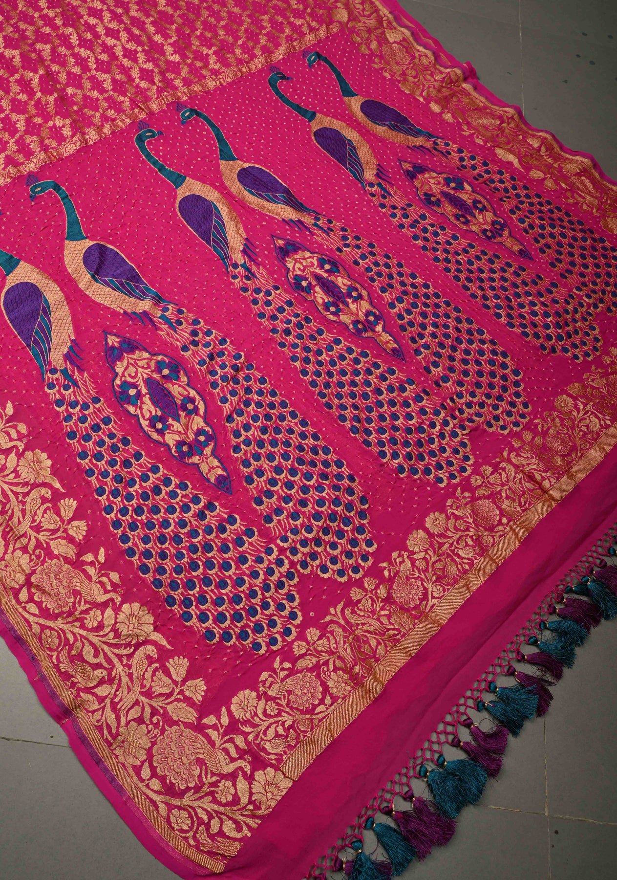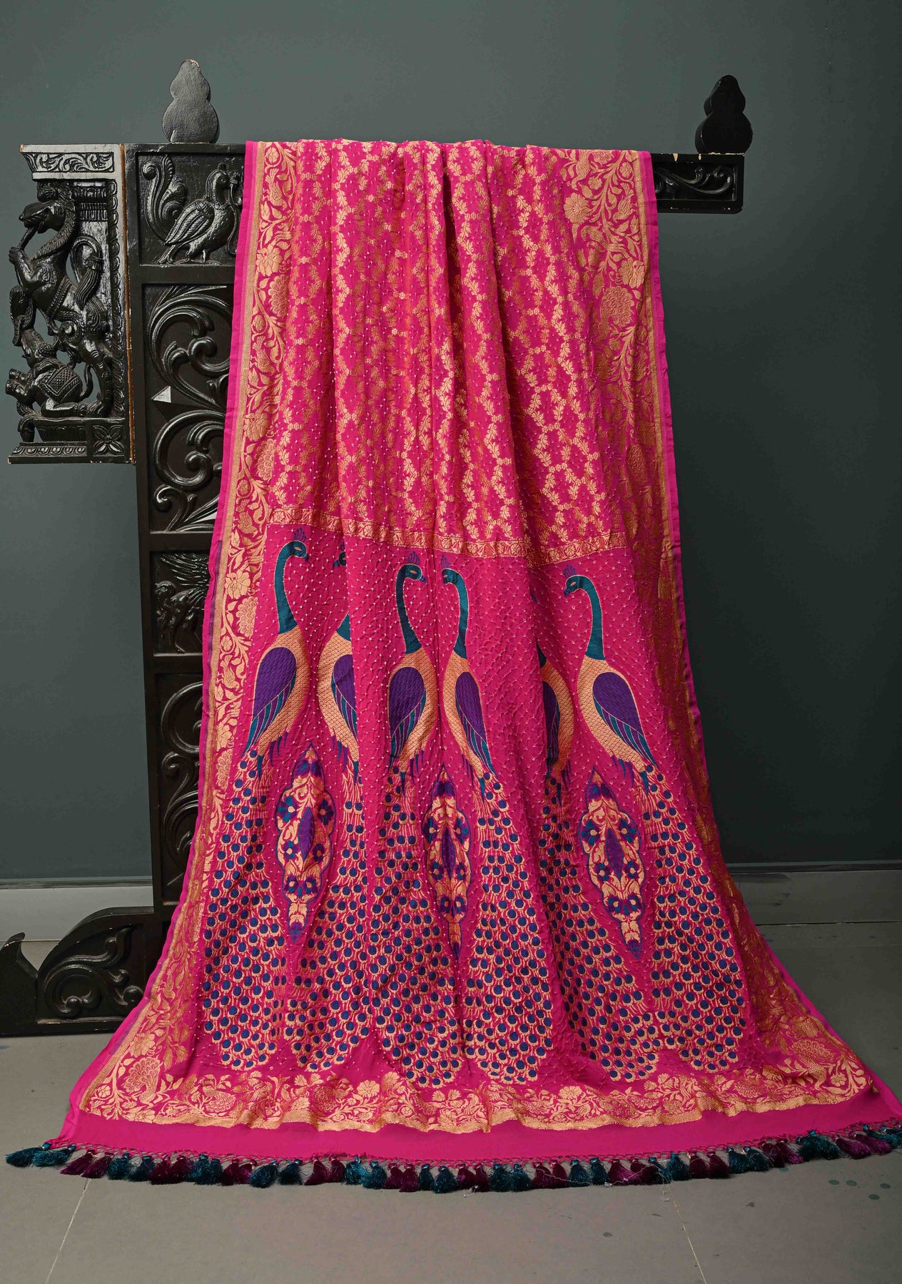 Exude royal elegance in this Rani Pink Red Banarasi Georgette Silk Saree, featuring a vibrant red body meticulously woven with a fine gold zari jaal and ornate paisley motifs. The resplendent pallu showcases intricate peacock Meenakari artistry, blending traditional craftsmanship with a luxurious, fluid drape. Finished with a majestic gold zari border, this opulent ensemble is a timeless choice for bridal celebrations and grand festive occasions.