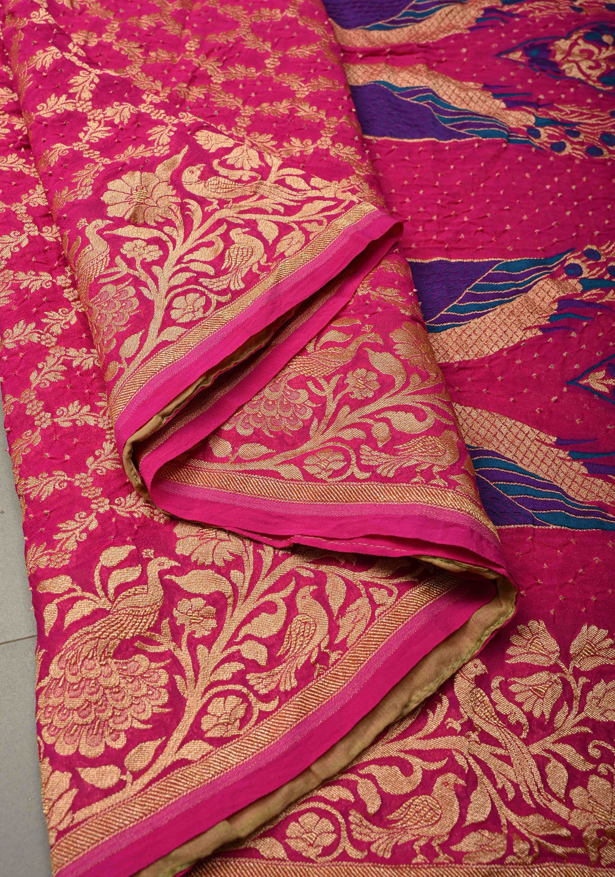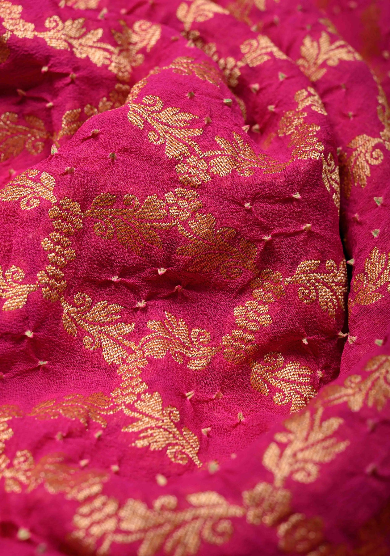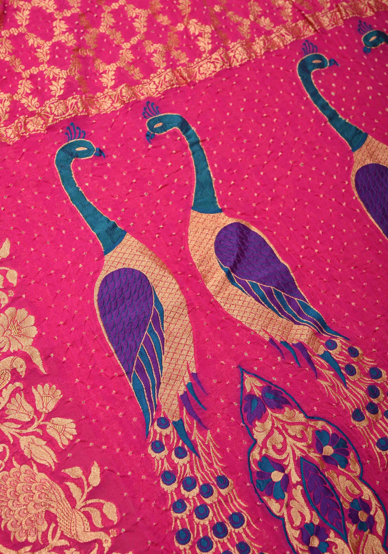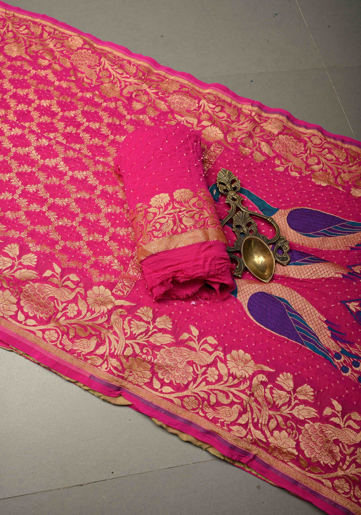 Exude royal elegance in this Rani Pink Red Banarasi Georgette Silk Saree, featuring a vibrant red body meticulously woven with a fine gold zari jaal and ornate paisley motifs. The resplendent pallu showcases intricate peacock Meenakari artistry, blending traditional craftsmanship with a luxurious, fluid drape. Finished with a majestic gold zari border, this opulent ensemble is a timeless choice for bridal celebrations and grand festive occasions.