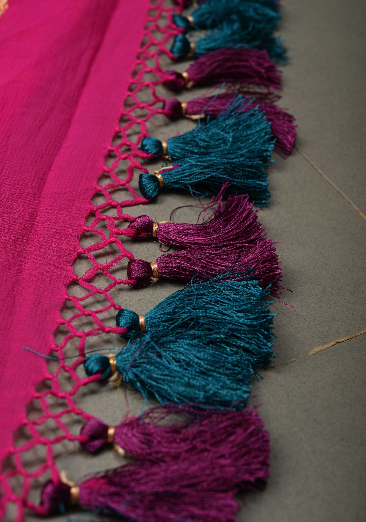 This saree is ready to wear with fall and pico done. Handmade silk tassels adorn the pallu and add more grace to it. An unstitched blouse fabric is included.