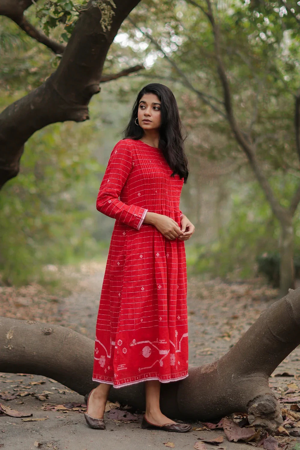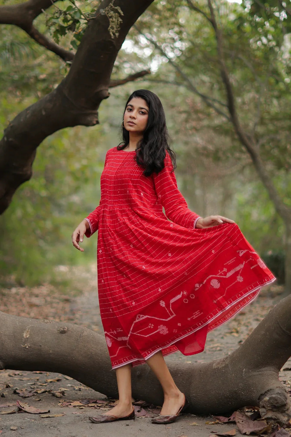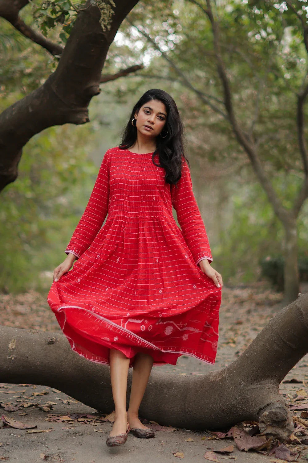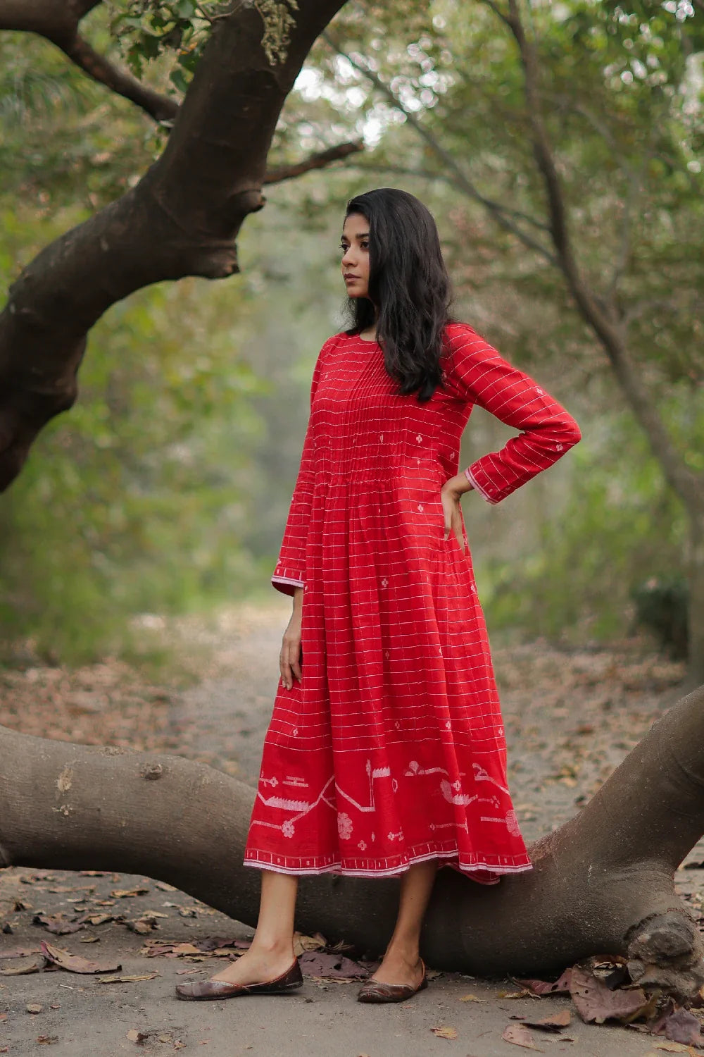 Elevate your style with this Red Handwoven Pure Cotton Flared Jamdani Dress. Featuring a round neck, broad white woven border, and lining for a comfortable fit, this dress combines traditional craftsmanship with modern elegance. Perfect for festive or casual occasions, it’s a timeless piece showcasing the beauty of Jamdani artistry.