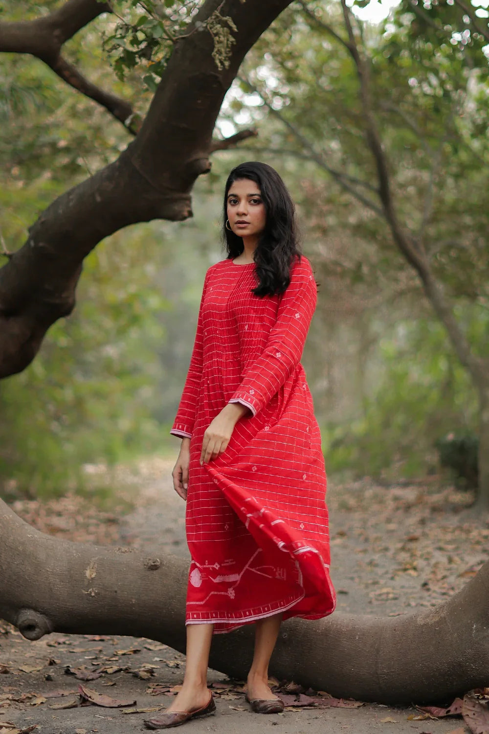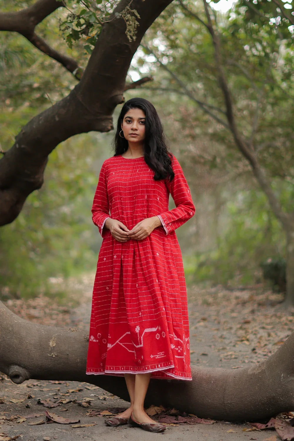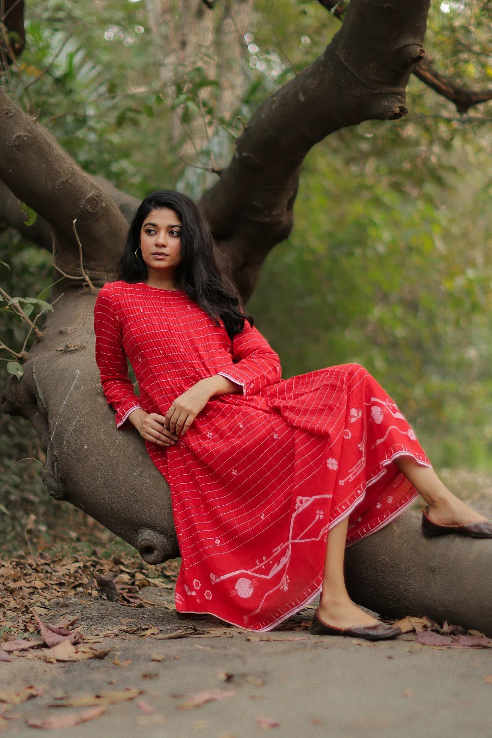 Elevate your style with this Red Handwoven Pure Cotton Flared Jamdani Dress. Featuring a round neck, broad white woven border, and lining for a comfortable fit, this dress combines traditional craftsmanship with modern elegance. Perfect for festive or casual occasions, it’s a timeless piece showcasing the beauty of Jamdani artistry.
