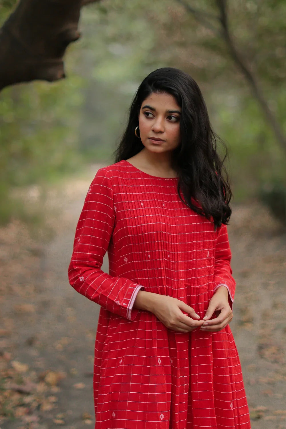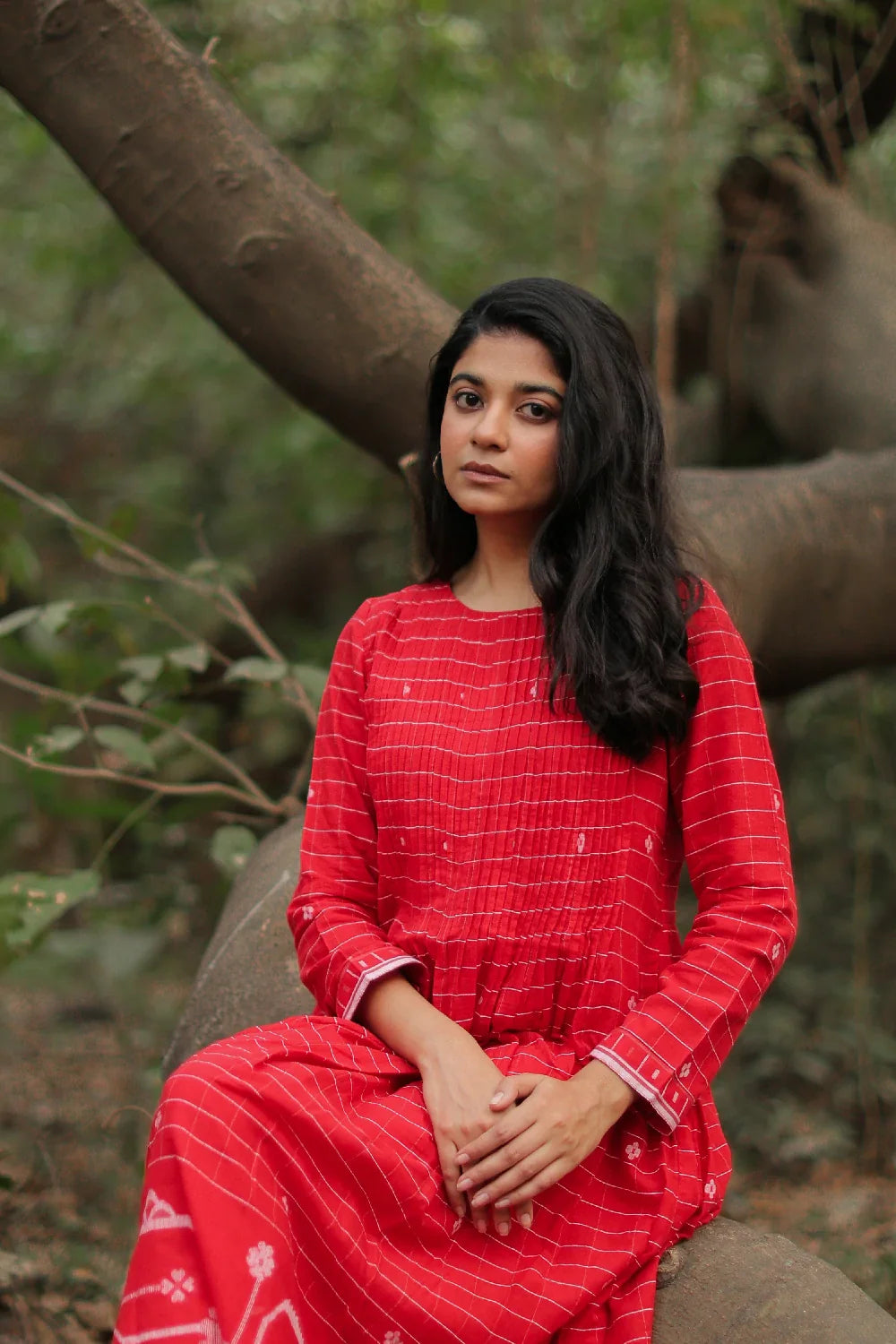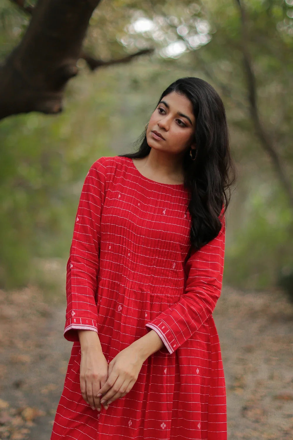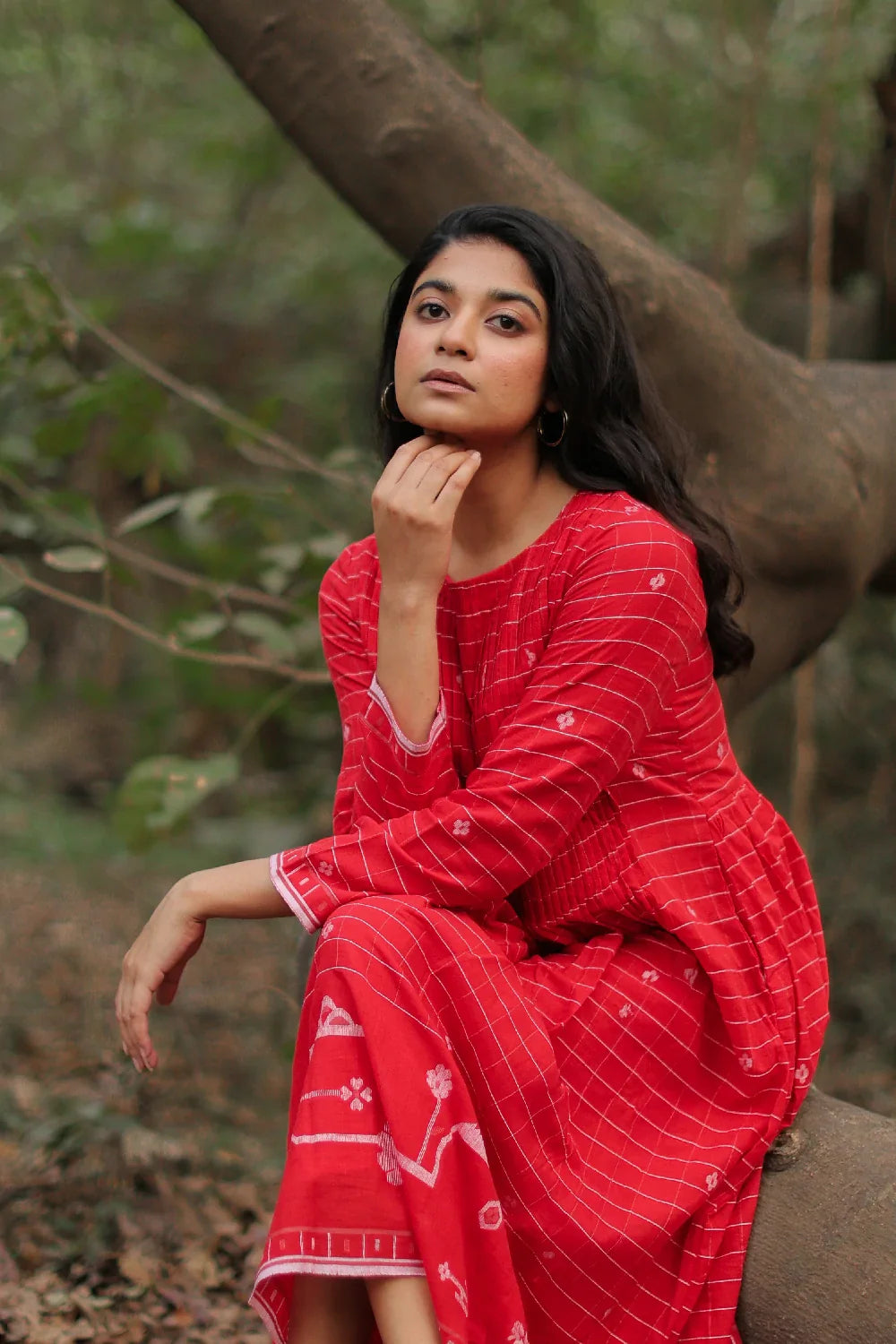 Elevate your style with this Red Handwoven Pure Cotton Flared Jamdani Dress. Featuring a round neck, broad white woven border, and lining for a comfortable fit, this dress combines traditional craftsmanship with modern elegance. Perfect for festive or casual occasions, it’s a timeless piece showcasing the beauty of Jamdani artistry.