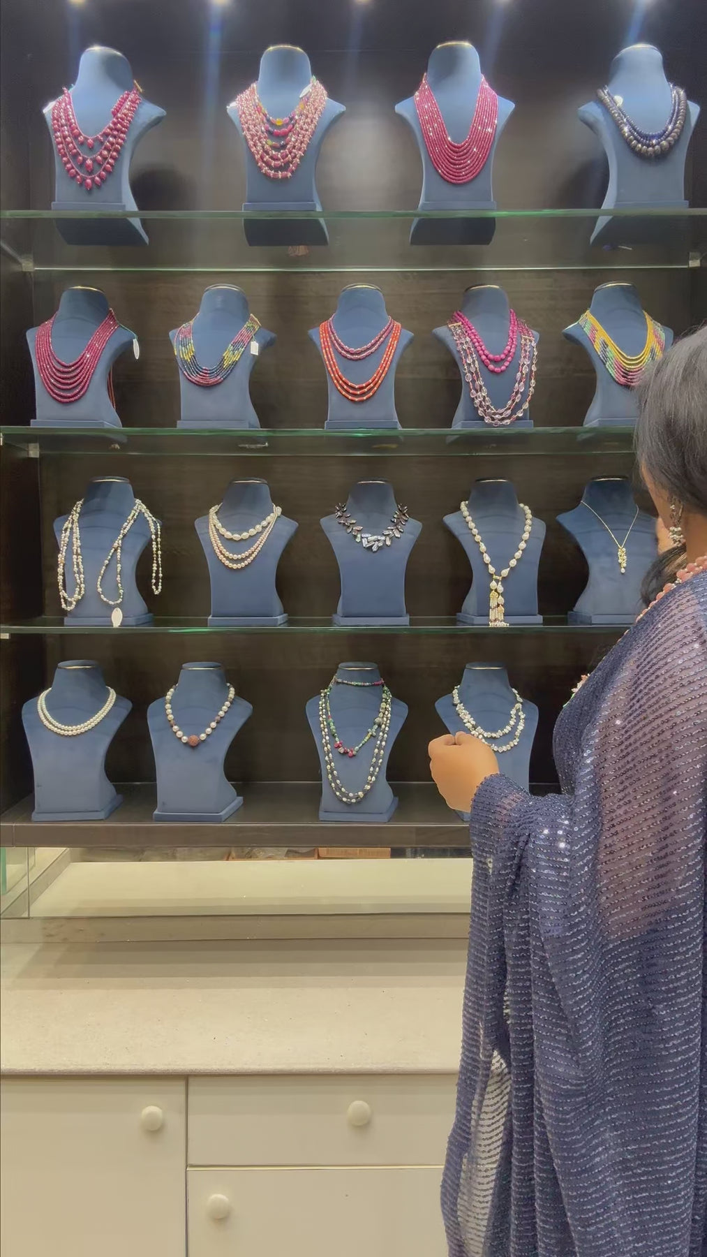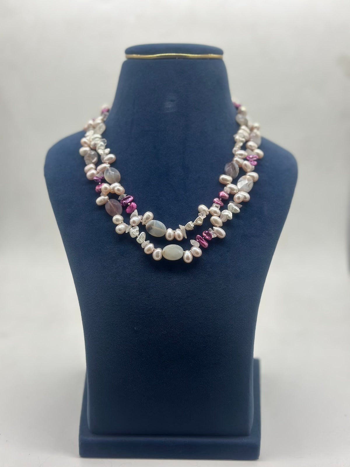 A striking four-line necklace featuring natural freshwater pearls dyed in black, complemented by vibrant semi-precious stones. Each pearl and stone is carefully selected to create a harmonious, luxurious design. The layered style adds depth, texture, and elegance to any outfit. Perfect for making a bold yet sophisticated statement
