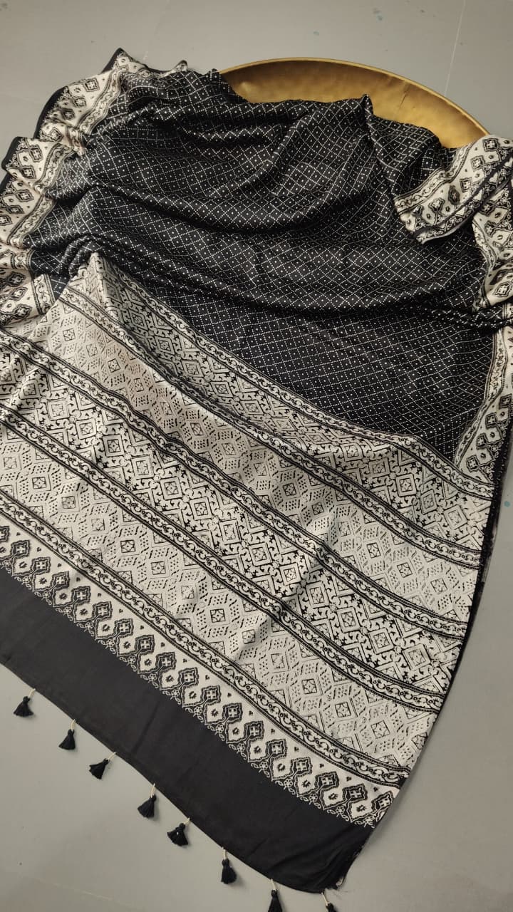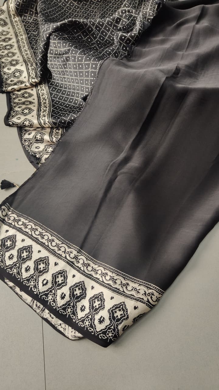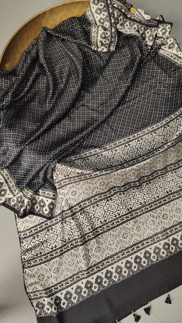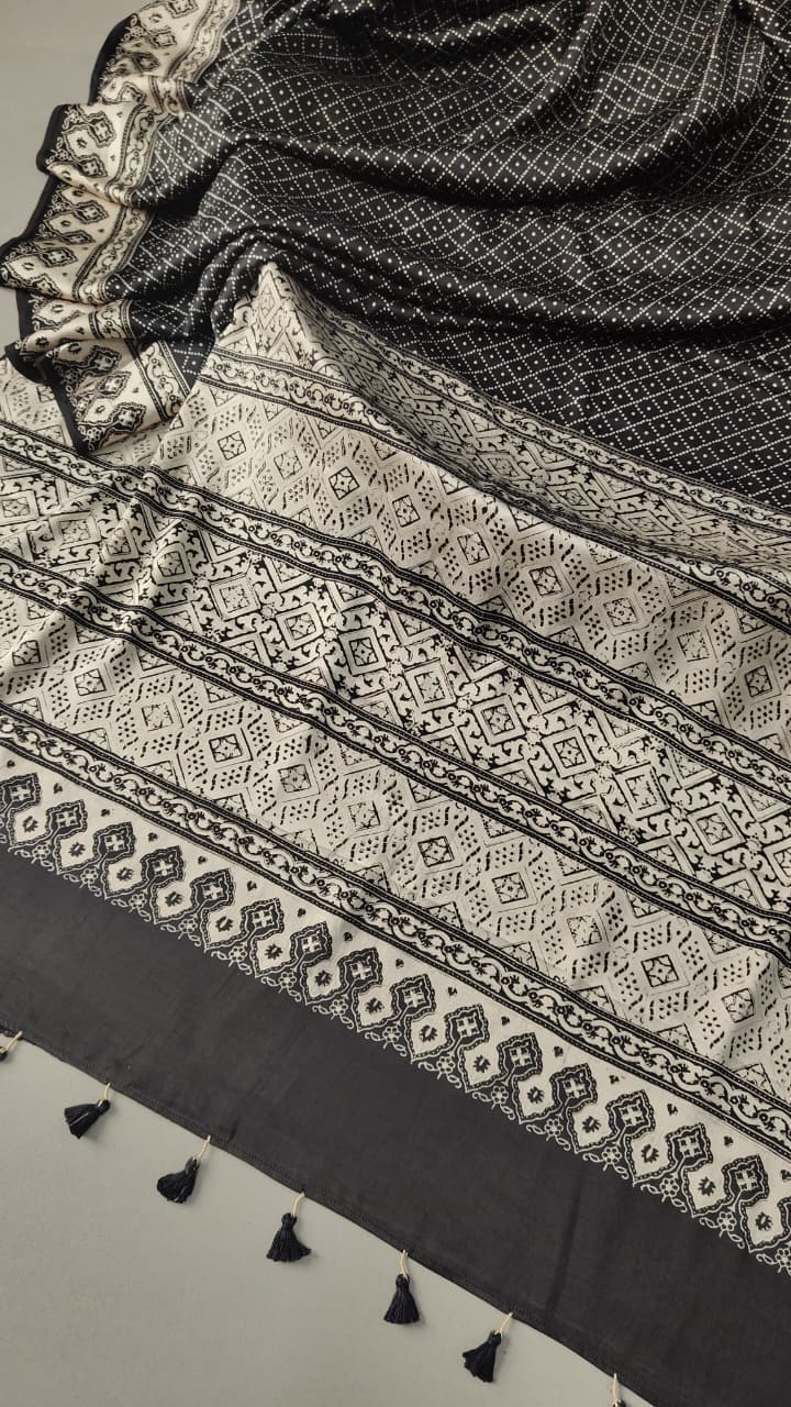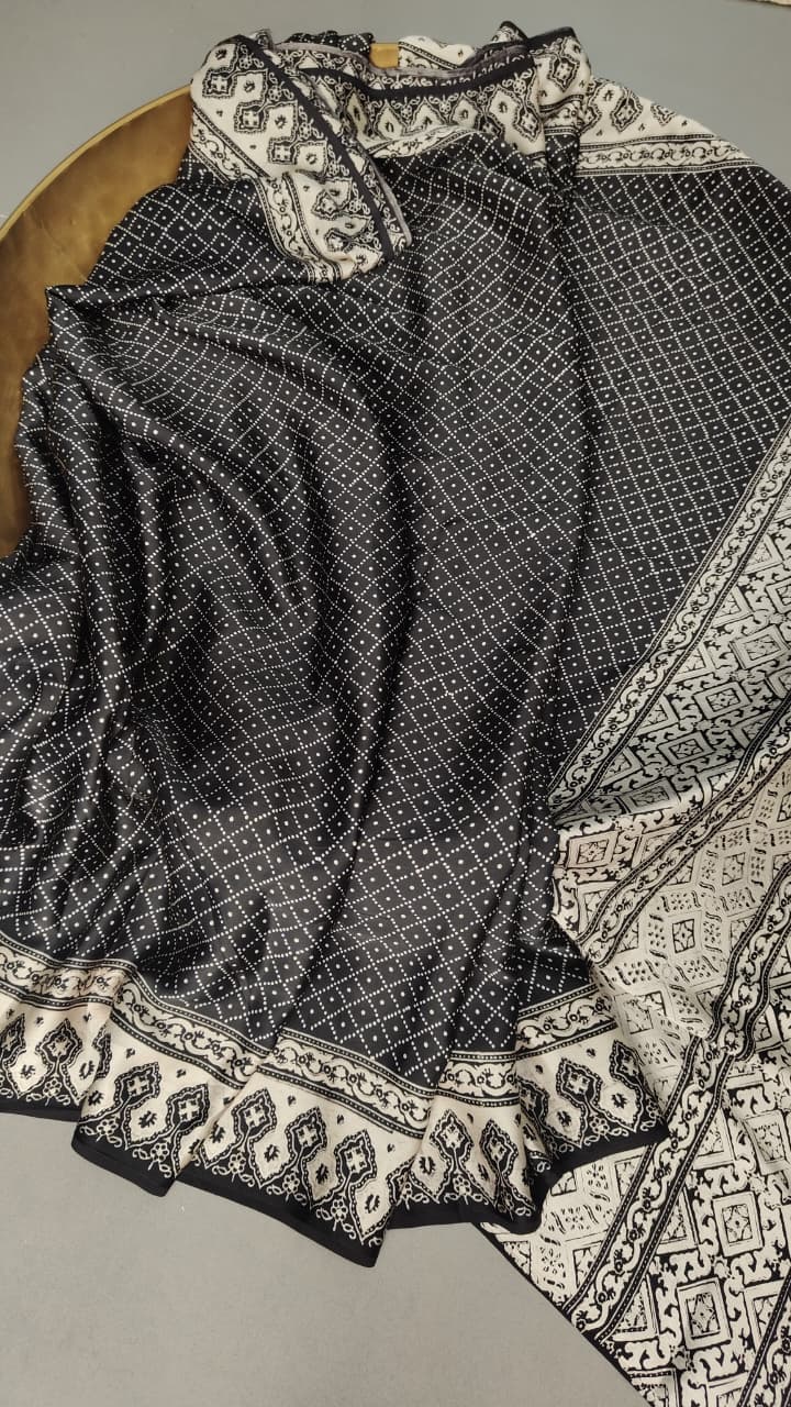 Make a bold style statement with this Black and White Authentic Ajrakh Hand Block Print Modal Silk Saree, a perfect blend of heritage craftsmanship and contemporary elegance. Crafted on luxurious modal silk, the saree features intricate Ajrakh hand block prints with finely detailed geometric motifs across the body, beautifully complemented by a striking contrast border. The soft, fluid drape of modal silk adds comfort and grace, making it ideal for long wear. Perfect for workwear, cultural gatherings, or elegant daytime occasions, this saree celebrates timeless design with a modern monochrome appeal..