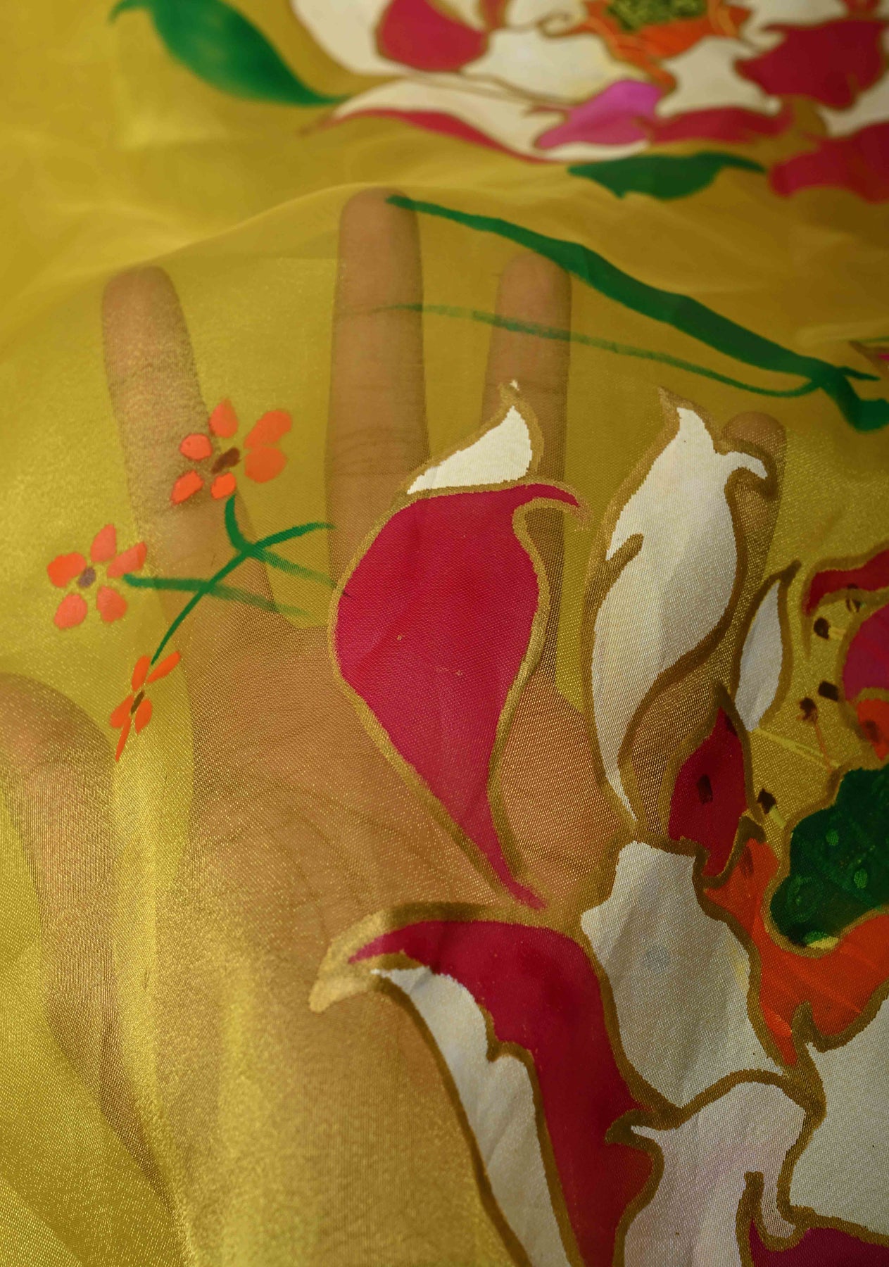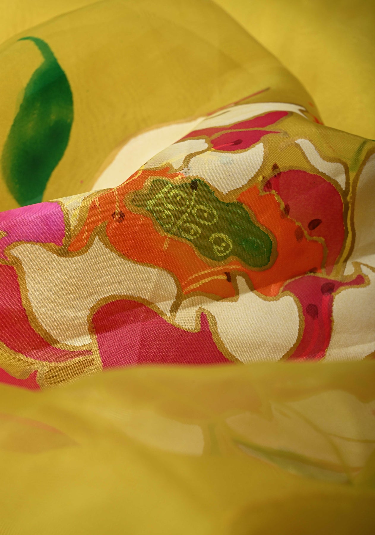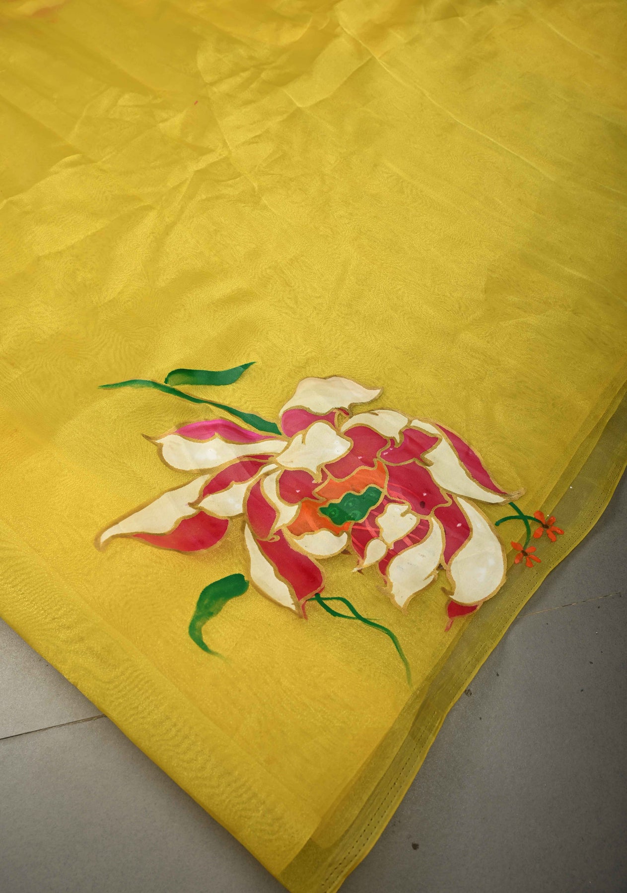 Radiate summery elegance in this Sunflower Yellow Shimmer Organza Saree, featuring delicate hand-painted floral blooms. Crafted from lightweight, translucent organza with a subtle shimmer finish, this saree offers a graceful drape and sophisticated glow. The vibrant yellow hue and artistic floral motifs make it an ideal choice for garden weddings, daytime festivities, or spring celebrations. This piece beautifully blends contemporary textile trends with timeless hand-painted artistry.