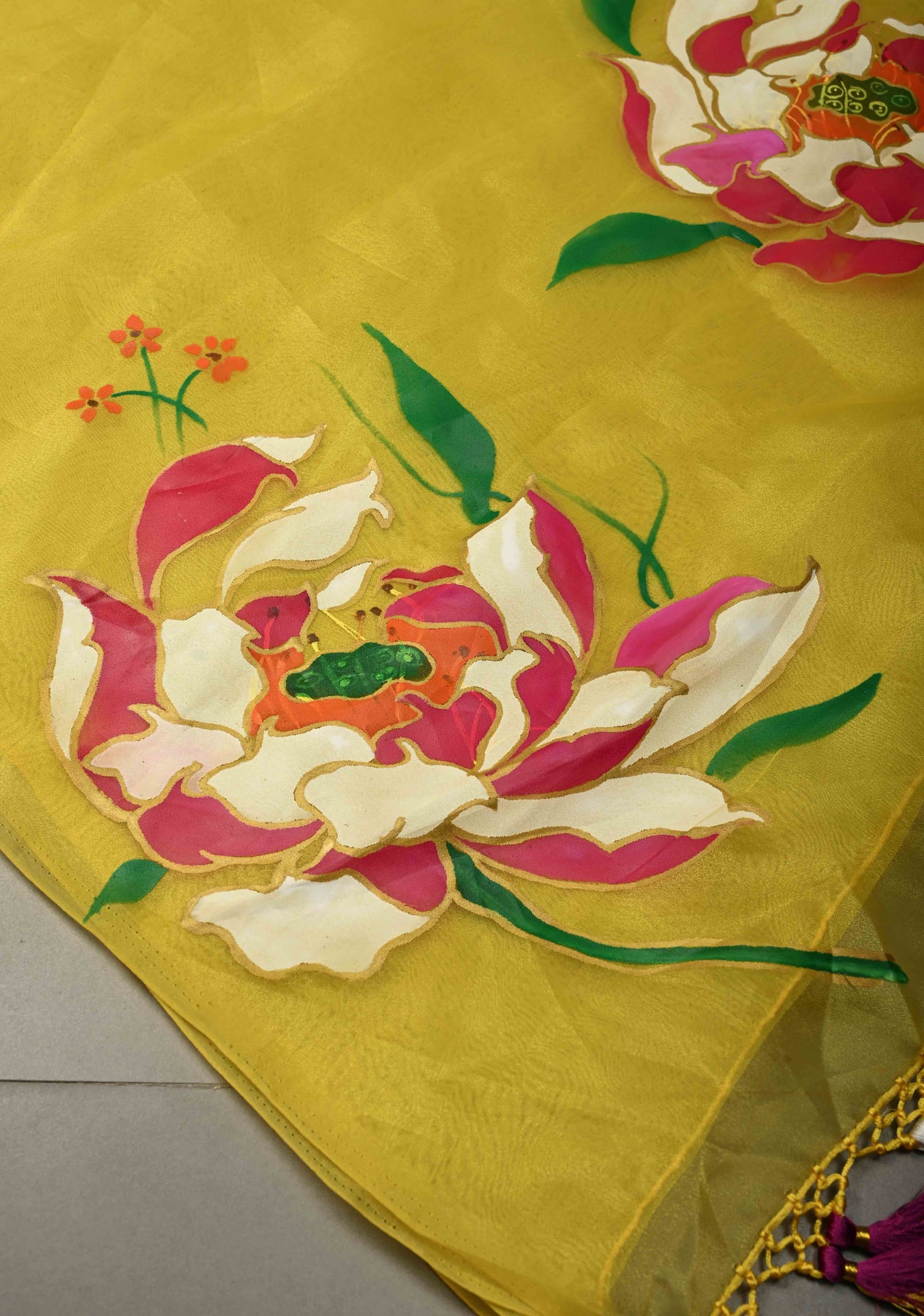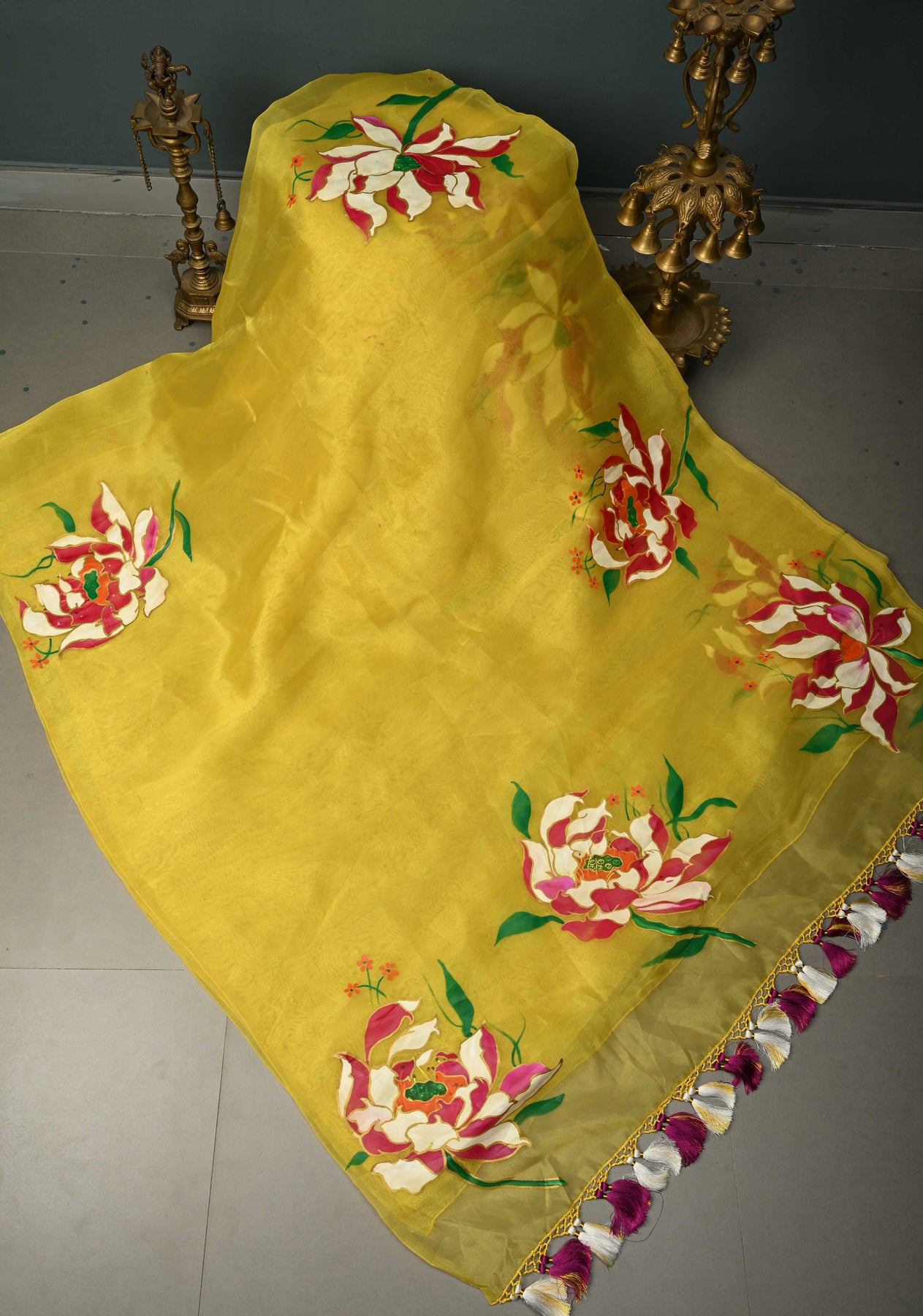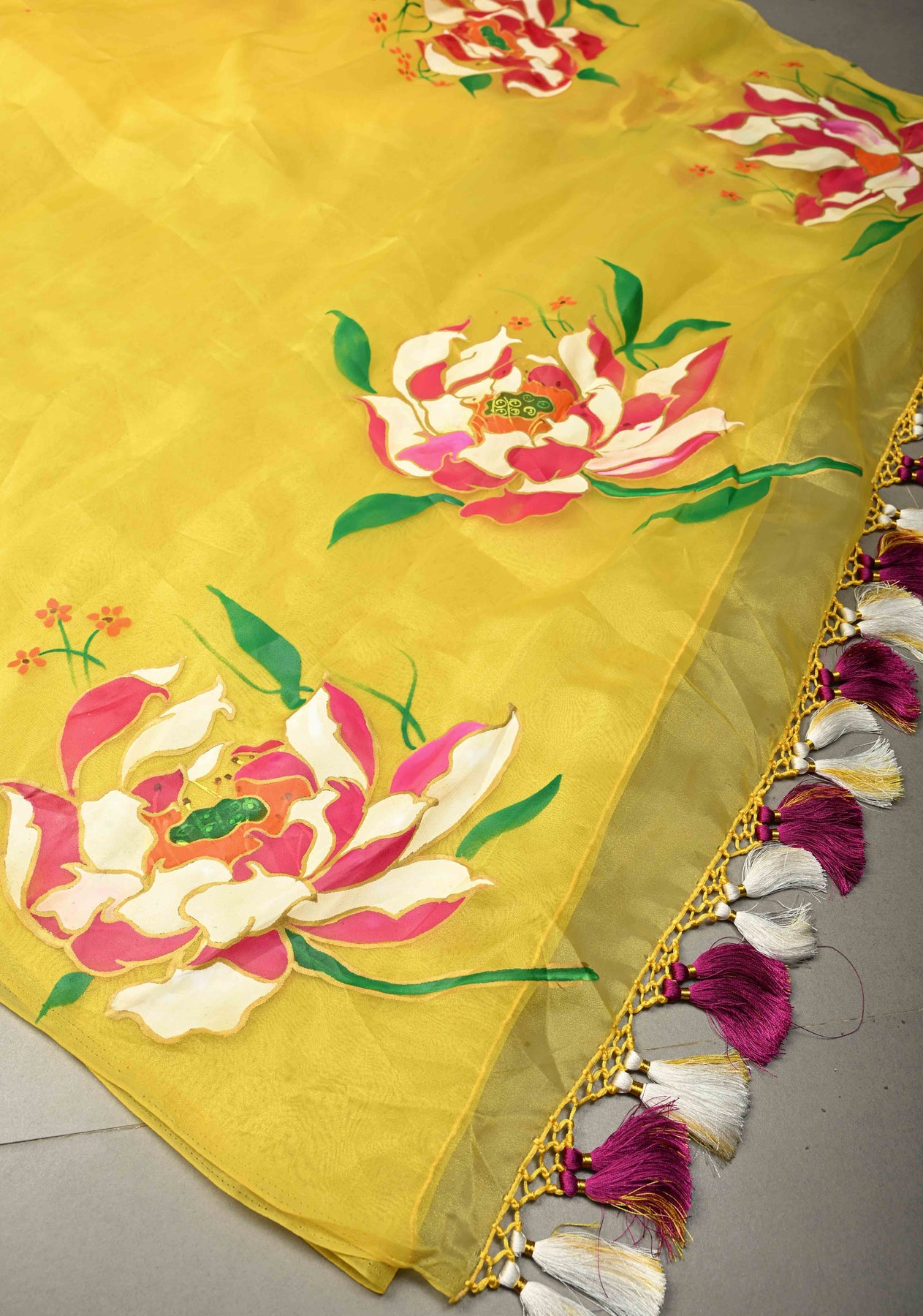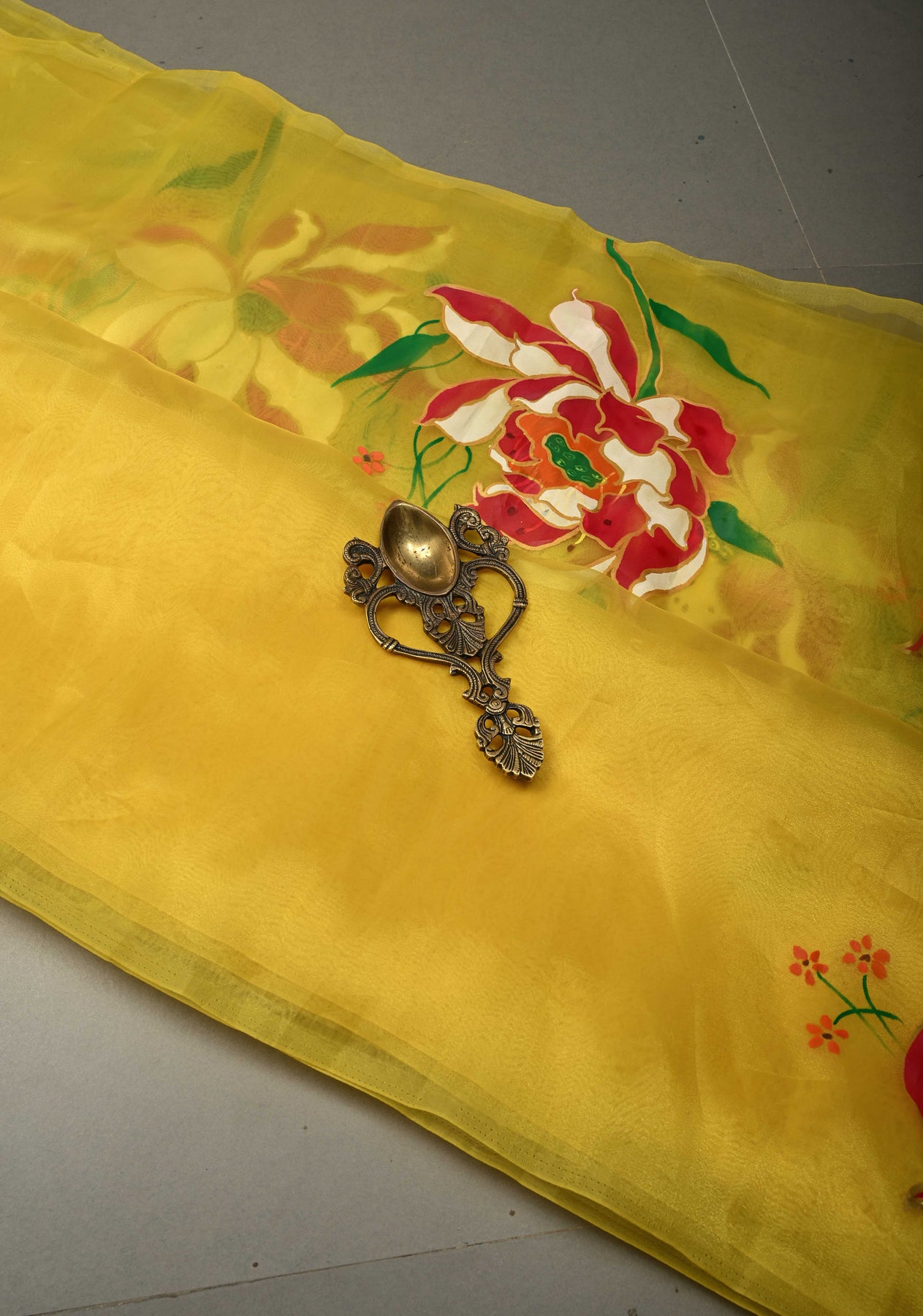 Radiate summery elegance in this Sunflower Yellow Shimmer Organza Saree, featuring delicate hand-painted floral blooms. Crafted from lightweight, translucent organza with a subtle shimmer finish, this saree offers a graceful drape and sophisticated glow. The vibrant yellow hue and artistic floral motifs make it an ideal choice for garden weddings, daytime festivities, or spring celebrations. This piece beautifully blends contemporary textile trends with timeless hand-painted artistry.
