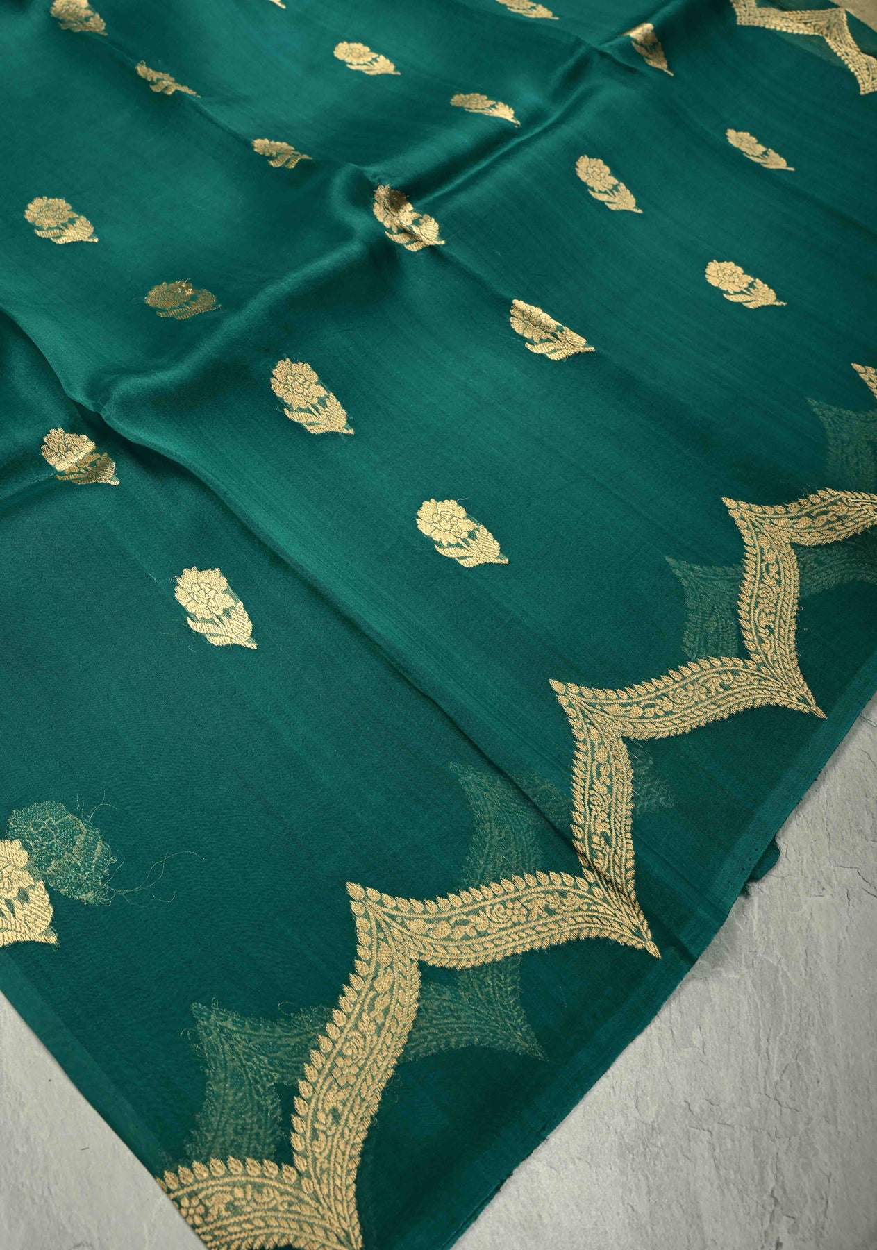 Teal Green Pure Banarasi Organza Silk Saree with Floral Zari Buttas and Scallop Border | SILK MARK CERTIFIED