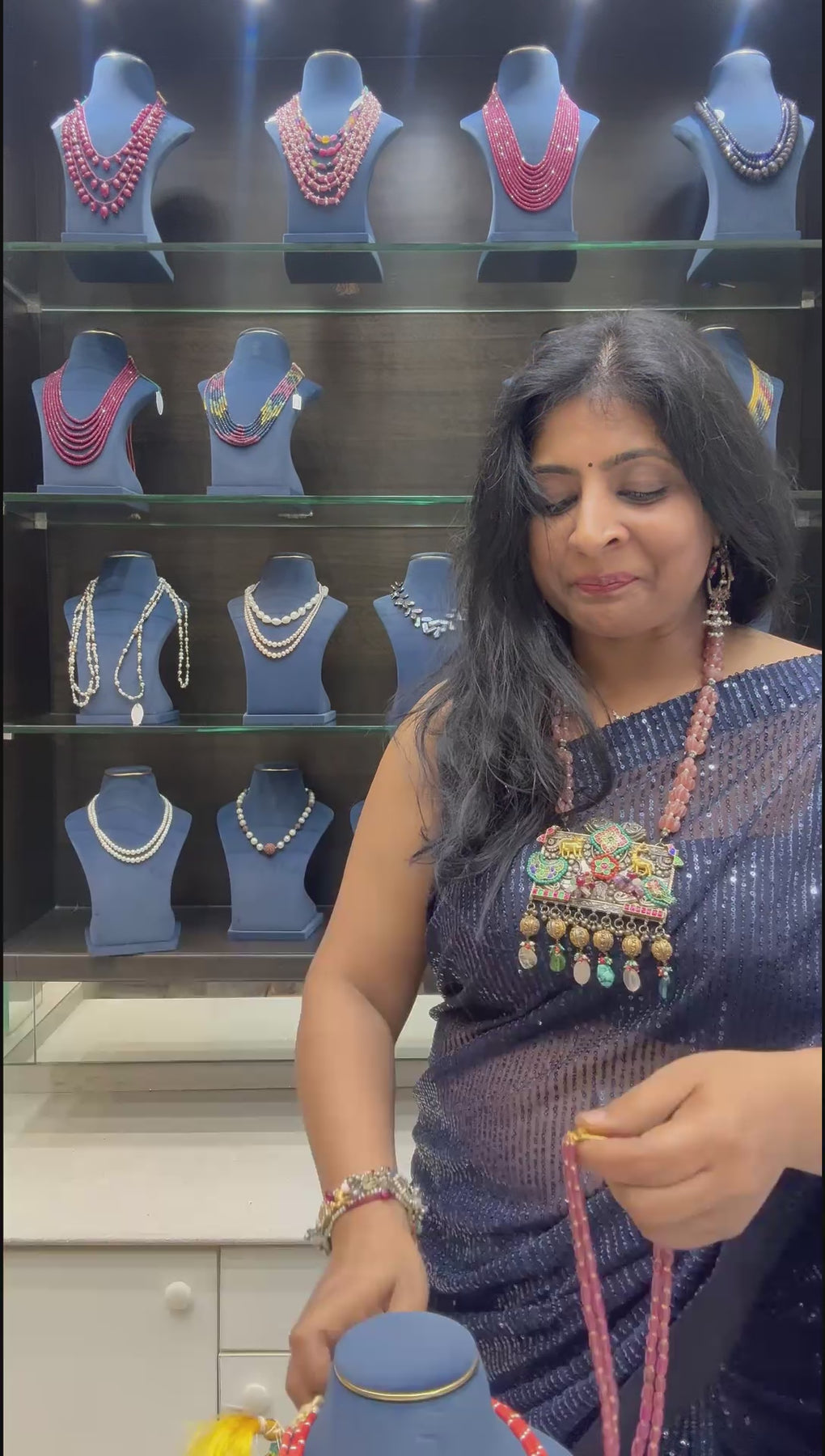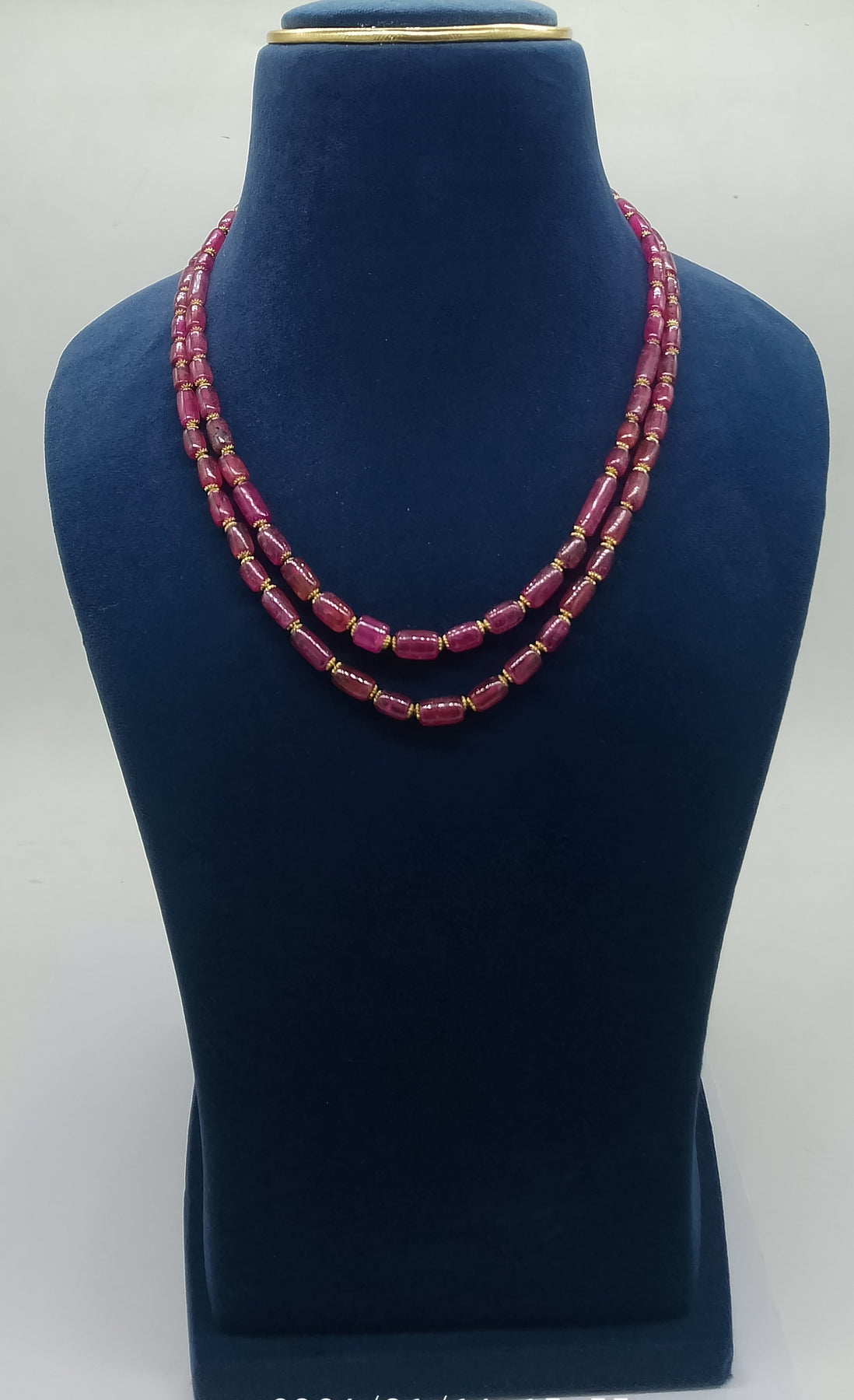 The Two-Layer Long Ruby Stone Necklace with Metallic Bead Accents showcases a striking blend of bold color and refined detailing. Featuring elongated ruby stones arranged in a graceful two-layer design, the necklace is enhanced with delicate metallic beads that add subtle shimmer and texture. The rich crimson tones of the ruby stones create a powerful statement, while the layered silhouette offers depth and elegance. Perfect for both festive occasions and sophisticated evening wear, this necklace brings a touch of modern luxury and timeless charm to any ensemble