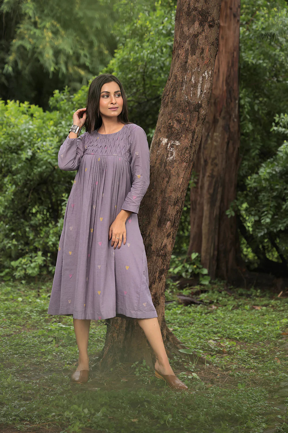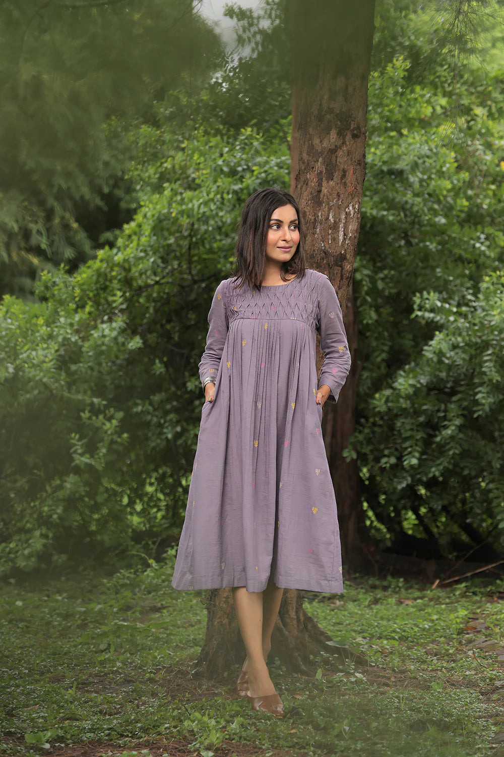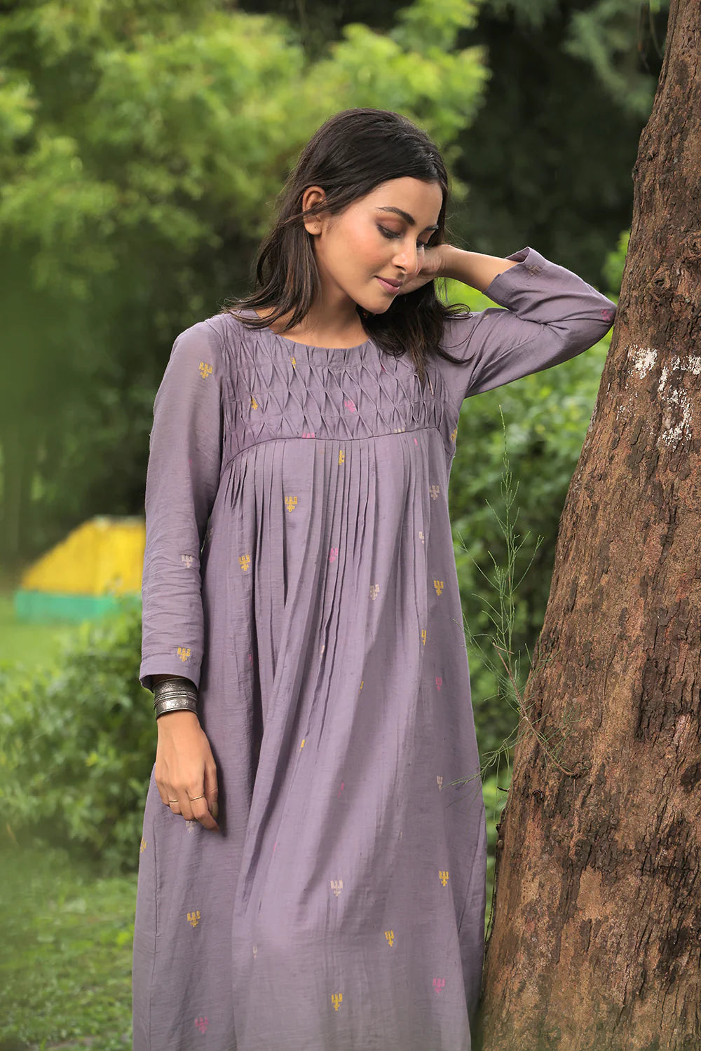 Embrace understated elegance with our Grey Jamdani dress, featuring intricate Trishul motifs woven into handwoven cotton fabric. This lined dress offers a perfect blend of comfort and style, making it ideal for both casual and semi-formal occasions. The subtle grey hue and timeless design ensure you'll make a sophisticated statement with ease.