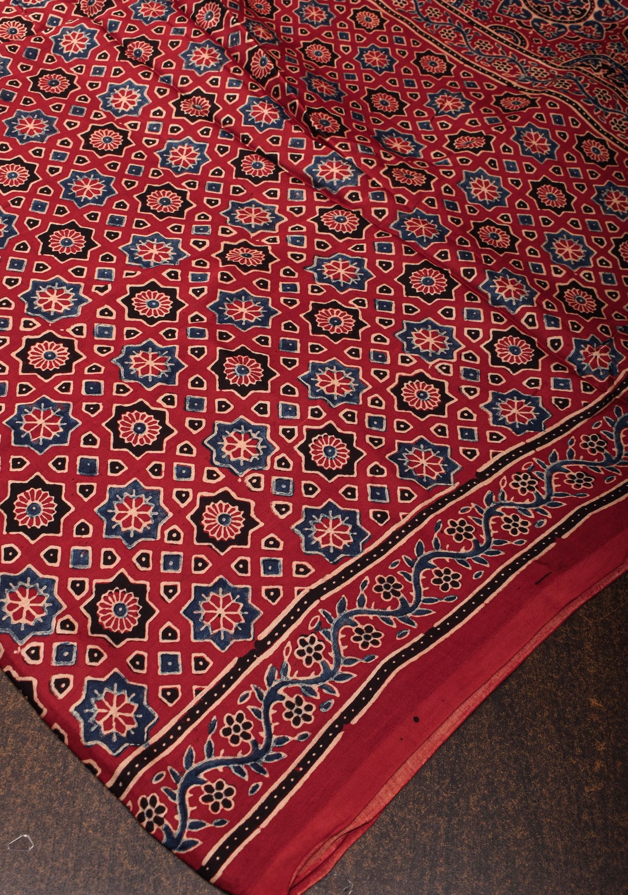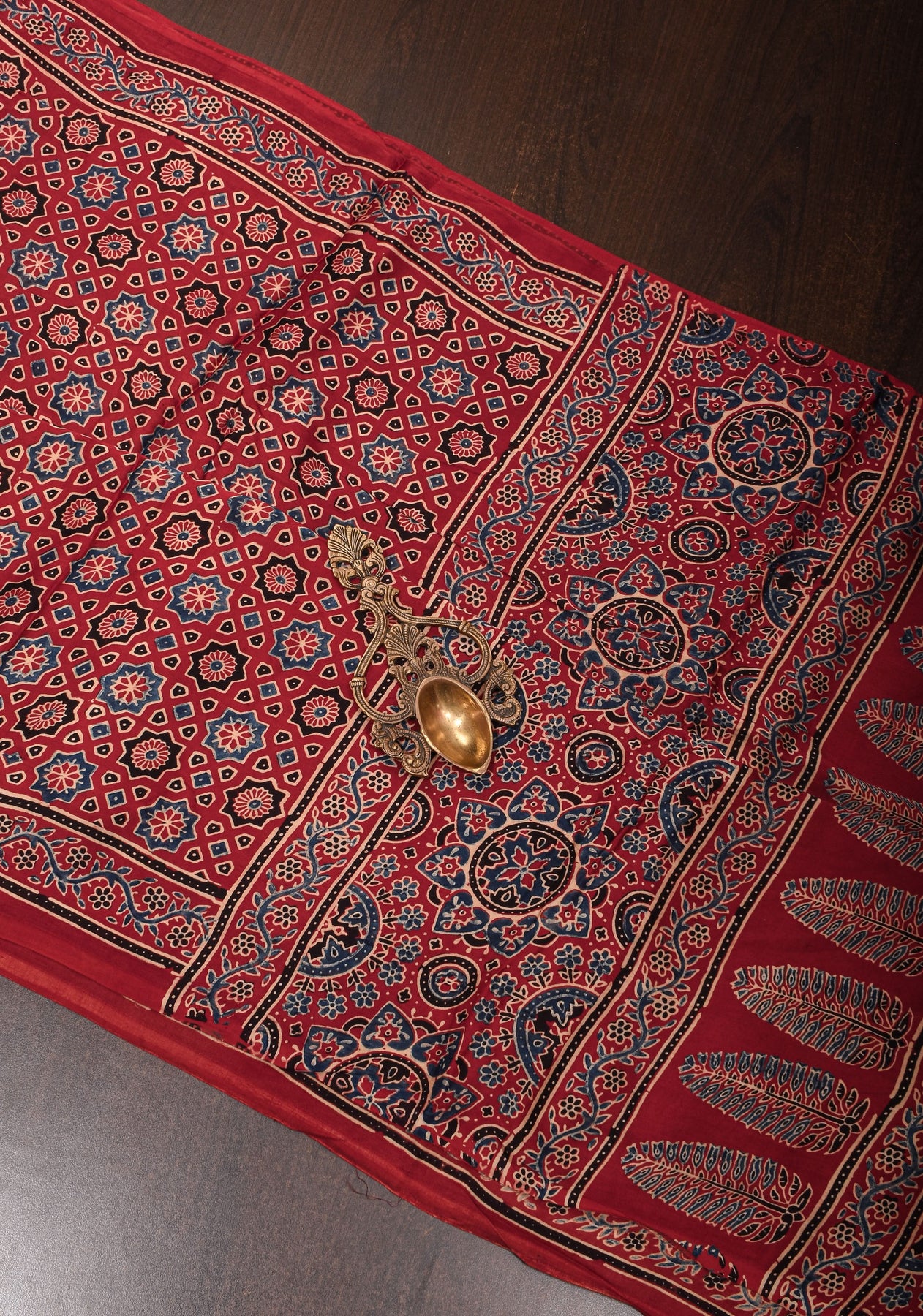 Presenting a smooth Modal Silk saree in Red filled with Floral Ajrakh patterns. The shiny and flowy fabric and prints make it a versatile saree for many occasions.