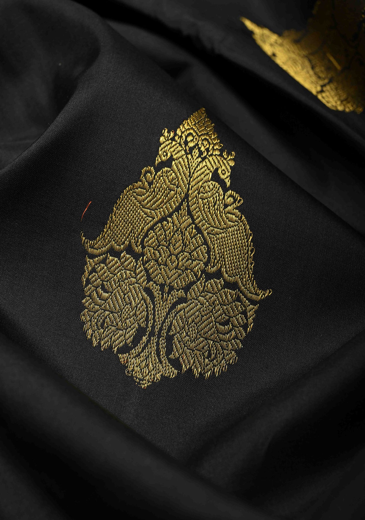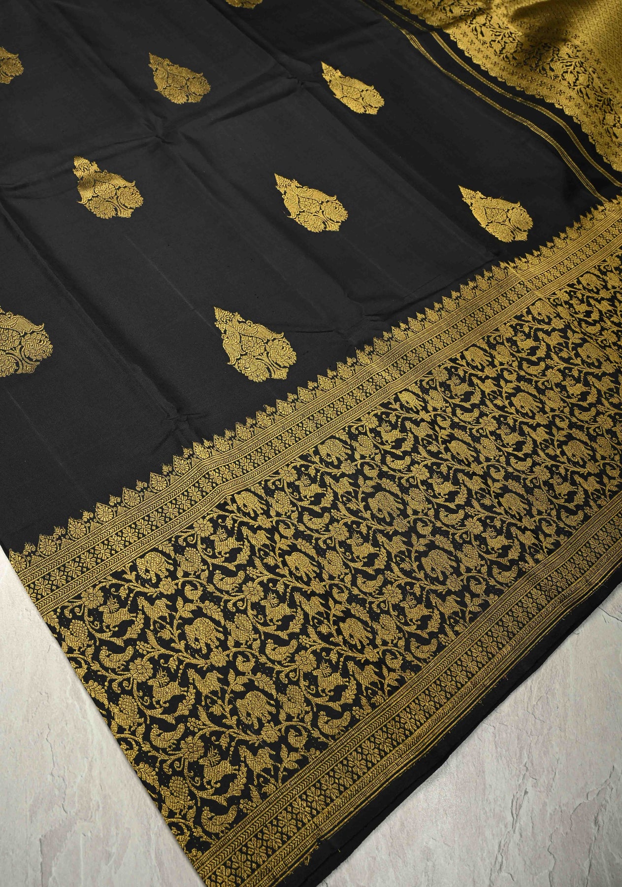 Embrace the timeless majesty of our Black Handloom Pure Silk Kanchipattu Saree, a masterpiece of traditional Dravidian artistry. The deep ebony body is adorned with intricate Peacock Buttas, symbolizing grace and beauty. It features a spectacular Vanasingaram wide zari border, intricately woven with "forest glory" motifs including elephants, and birds. Handcrafted from pure silk, this regal saree is the ultimate choice for grand weddings and heirloom collections, offering an unmatched silhouette of power and elegance.