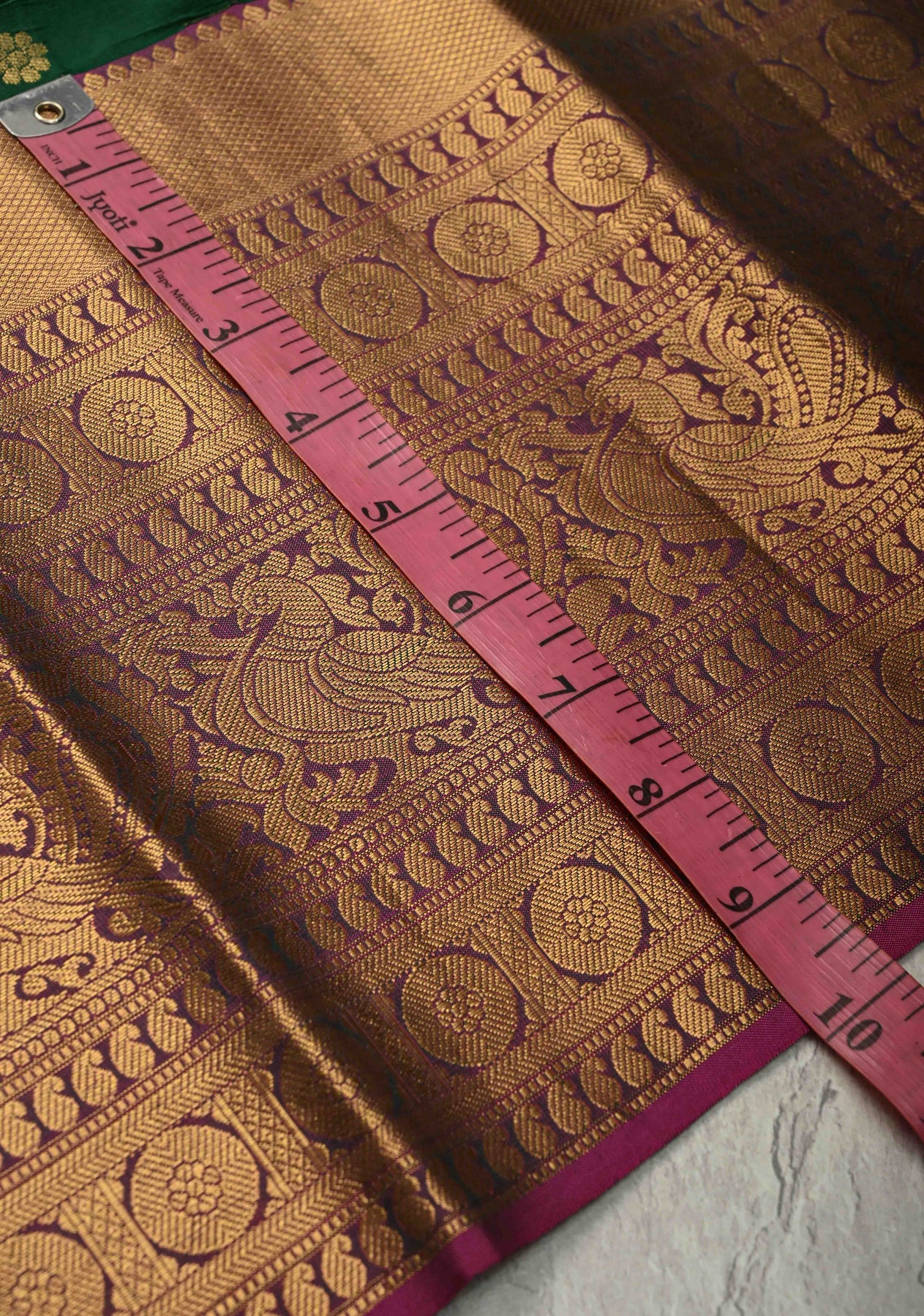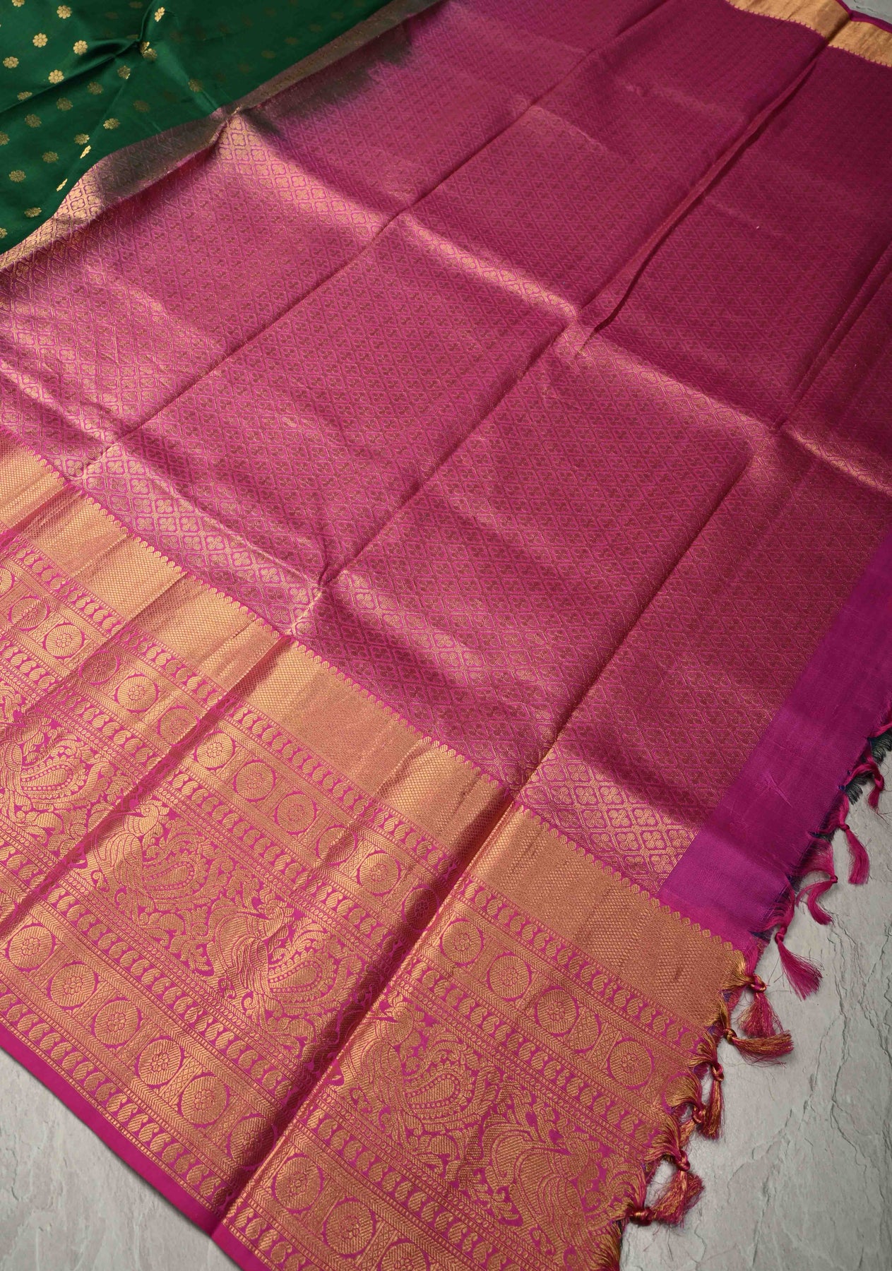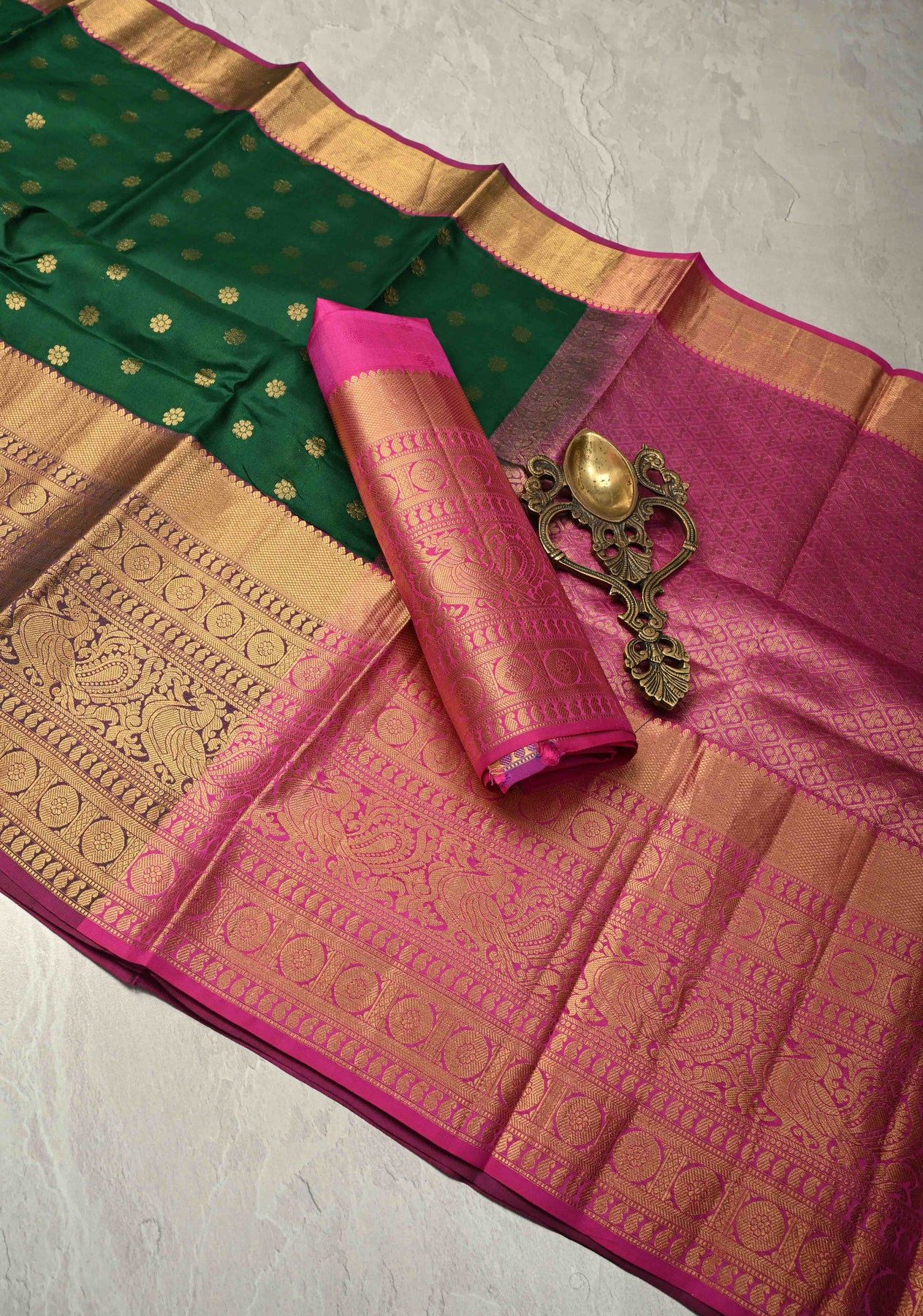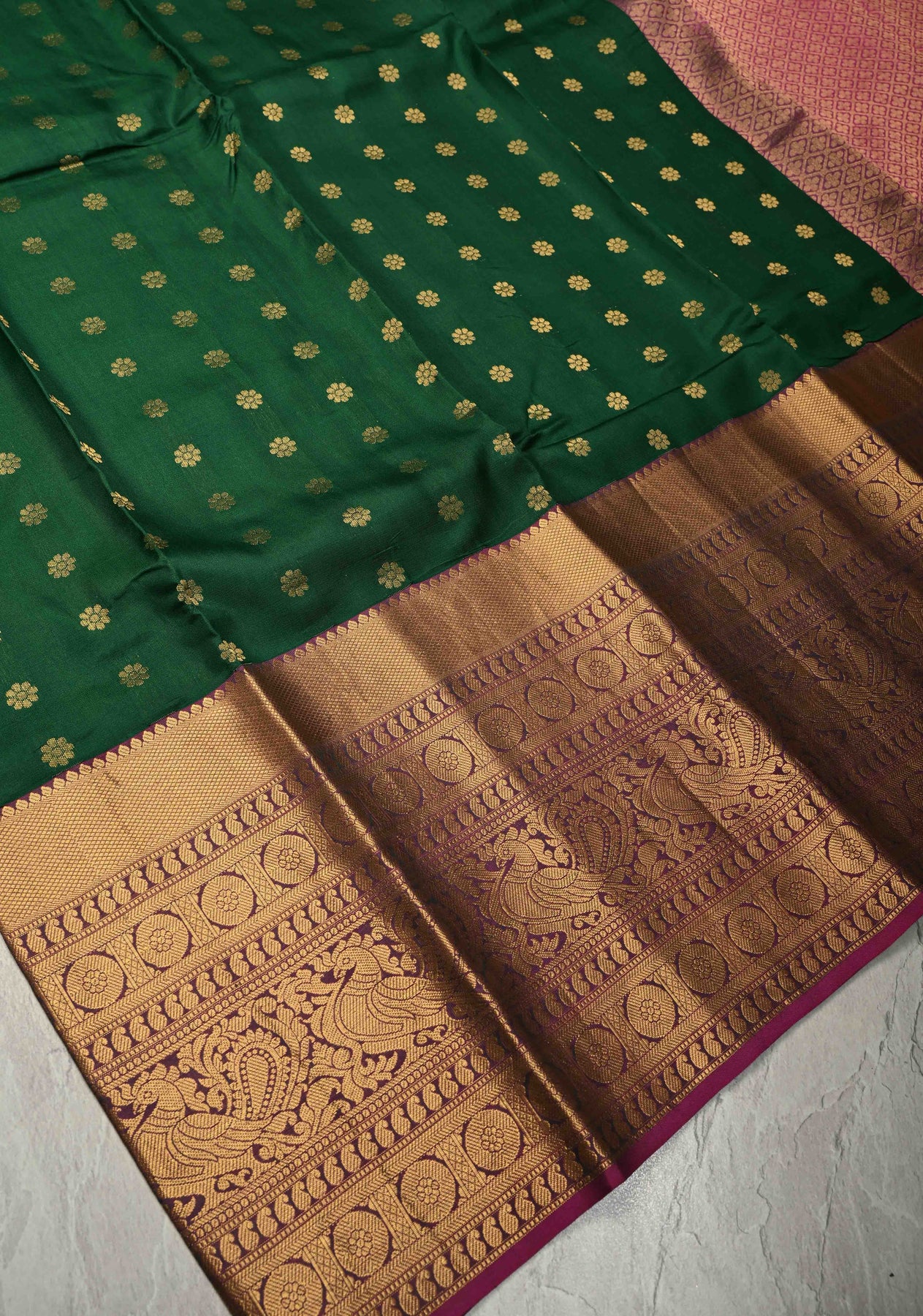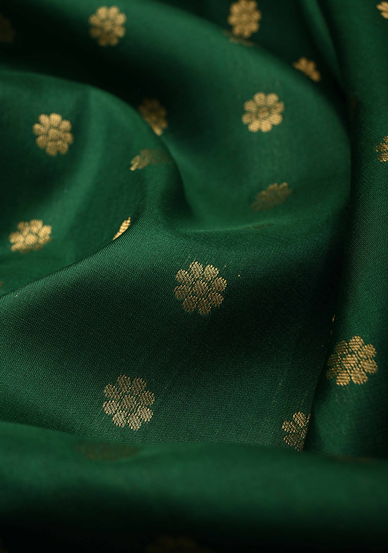 The Dark Green Handloom Kanchipattu Pure Silk Saree is a timeless expression of traditional elegance and fine craftsmanship. Woven from pure handloom Kanchipattu silk, this saree features a dark green hue that exudes regal sophistication. The body is adorned with delicate Chunri buttas, adding subtle texture and artisanal charm. A contrast wide zari border beautifully frames the saree, enhancing its classic appeal with a touch of opulence. Perfect for weddings, festive occasions, and cultural celebrations, this saree embodies heritage and grace.