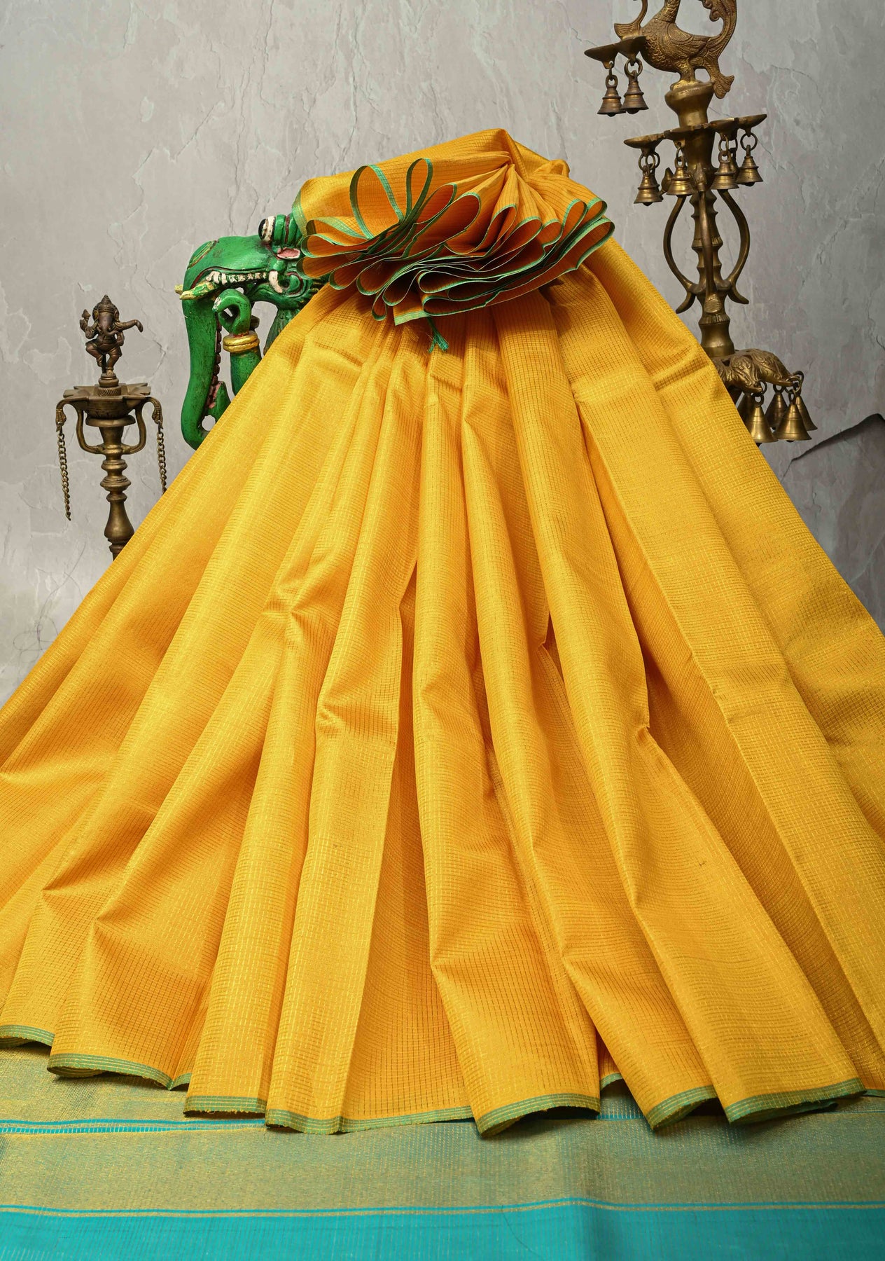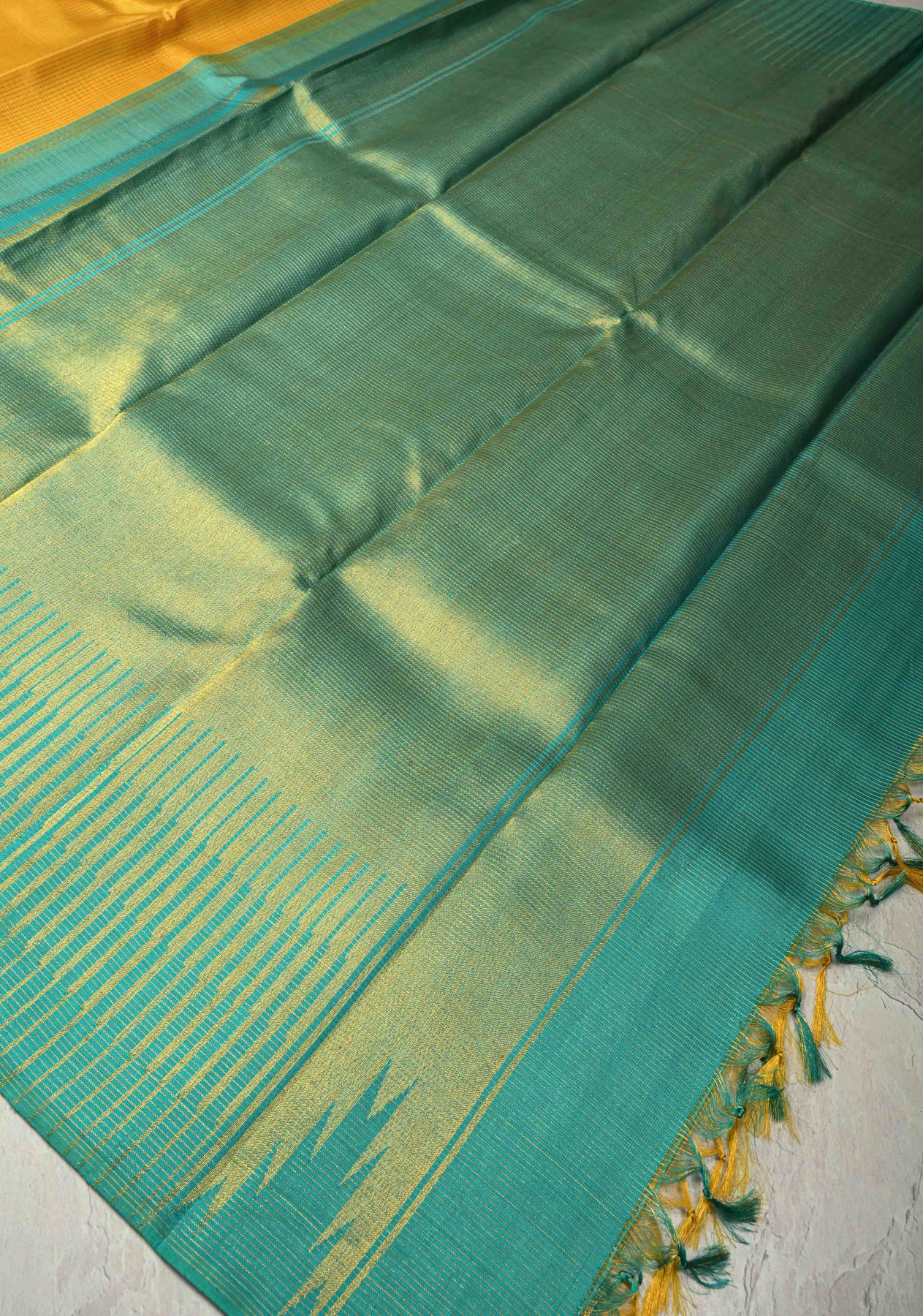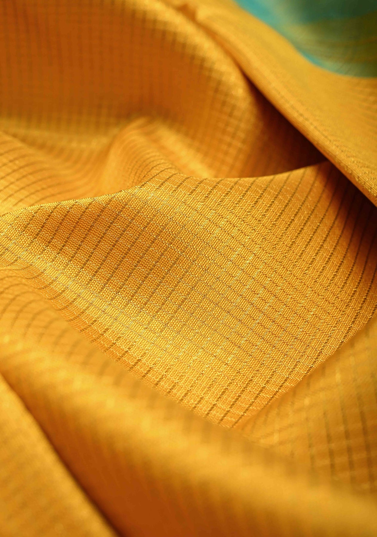 This yellow borderless handloom pure silk Kanchipattu saree embodies contemporary elegance rooted in tradition. The silk body is adorned with fine vertical zari stripes that add subtle shimmer and elongation, while the striking contrast pallu brings depth and a touch of classic grandeur. With its clean, borderless design and exquisite handloom finish, this saree is perfect for weddings, festive occasions, and refined celebrations, showcasing the timeless beauty of Kanchipuram silk.