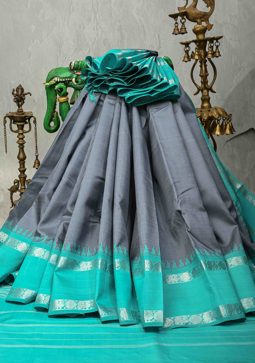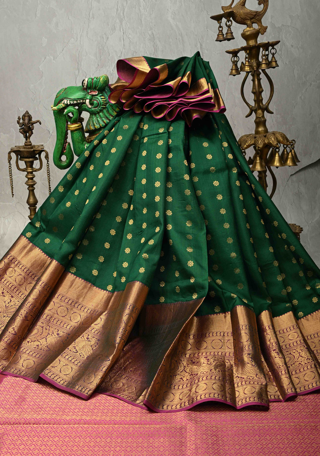 Contrast borders represent traditional Kanchipuram and Mysore silk styles. They're versatile enough for both formal ceremonies and casual temple visits.