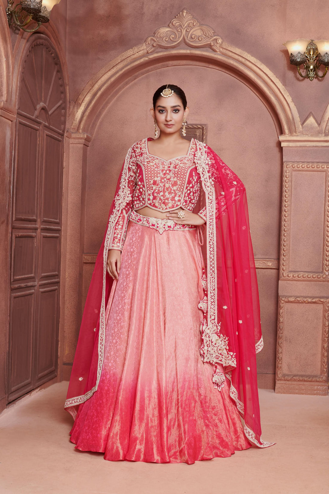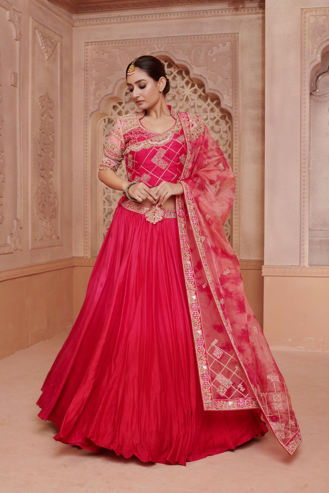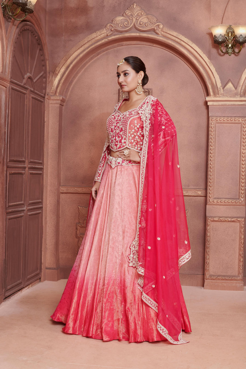 Your dupatta style plays a crucial role in enhancing your pink lehenga. Here are some elegant ways to drape it: