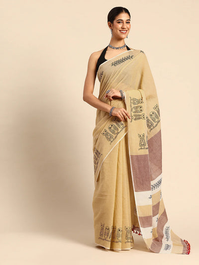 Cream-Yellow Handblock print Cotton saree No Blouse