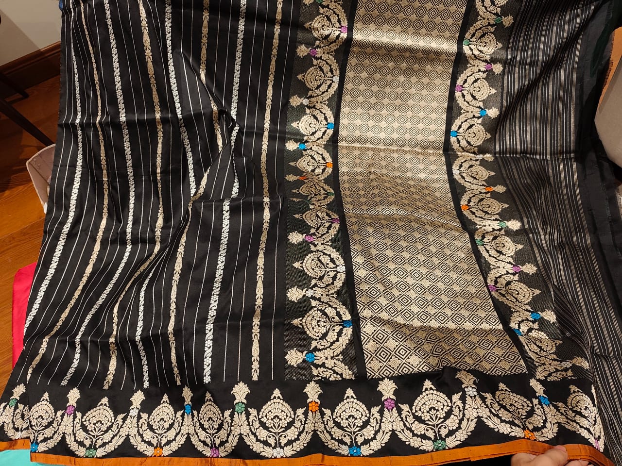 Black Pure Banarasi Silk Saree with Golden Silver Vertical stripes and Meenakari Scallop Border Rust orange selvedge | SILK MARK CERTIFIED