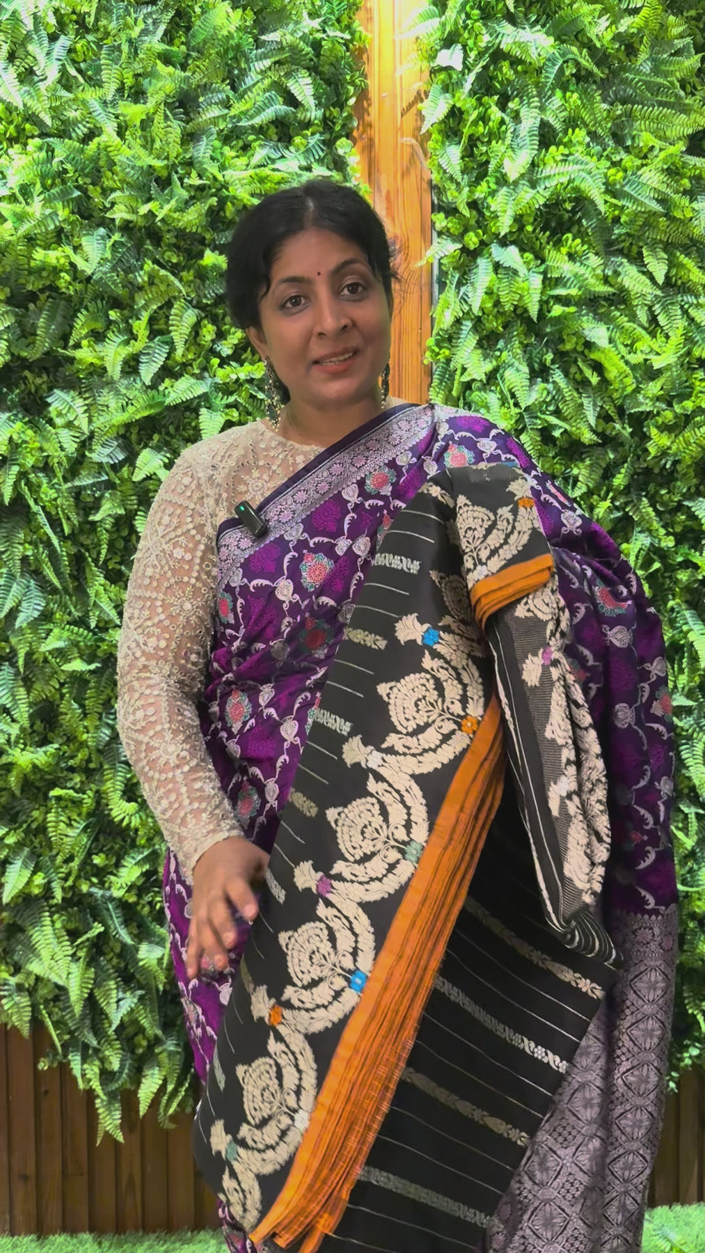 Regular price $450.18 Save $-450.18This stunning black pure Banarasi silk saree is a masterpiece of traditional Indian weaving. Its body is elegantly adorned with shimmering golden and silver vertical stripes, adding a touch of modern sophistication. The real highlight is the intricate Meenakari scallop border, which is a testament to skilled craftsmanship. A unique rust-orange selvedge frames the saree beautifully. This luxurious piece is a perfect blend of timeless elegance and contemporary flair, ideal for grand celebrations and special occasions where you want to make a sophisticated statement.