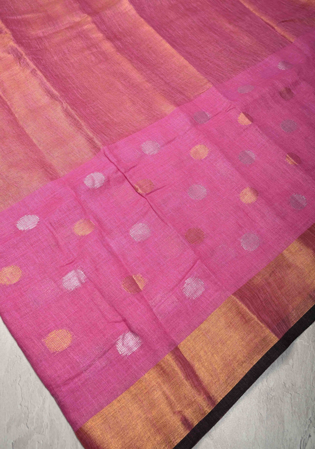 Bubblegum Pink Tissue Body Linen Saree in Muted Antique Gold with Sona Rupa Polka Dots Skirt Border