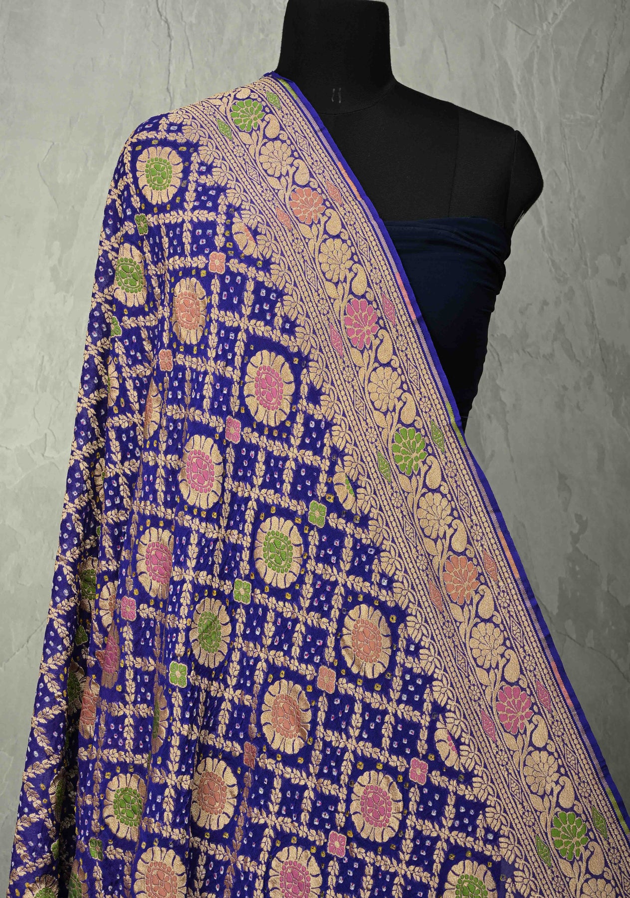 This Ink Purple Bandhej Banarasi Silk Georgette Dupatta is a true masterpiece that reflects the rich heritage of Banaras weaving. Handcrafted from silk georgette, it showcases the traditional Bandhej (tie-dye) pattern enhanced with intricate meenakari floral motifs and a detailed zari jaal across the fabric. The ink purple hue exudes regal charm, while the soft texture and elegant sheen add sophistication to any ensemble. Perfect for festive occasions, weddings, or cultural celebrations, this dupatta beautifully blends traditional craftsmanship with timeless elegance.