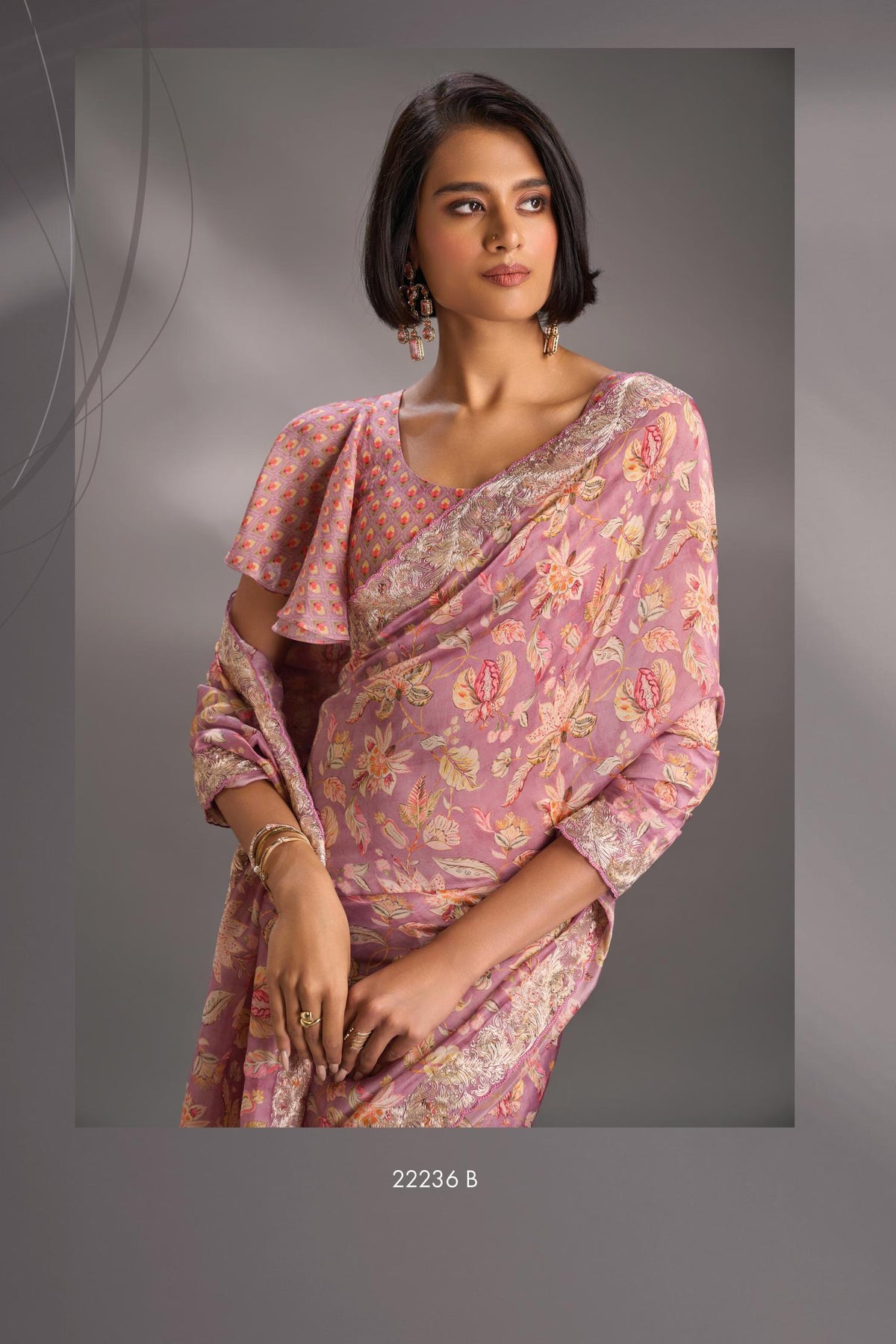 Artistically hand-painted chintz pattern in subtle pastel hues, evoking elegant softness is printed through digital print. The border is artfully highlighted with intricate cord patti embroidery, blending delicate craftsmanship with gentle tones to create a timeless, sophisticated drape that celebrates contemporary artistry with a nod to tradition.